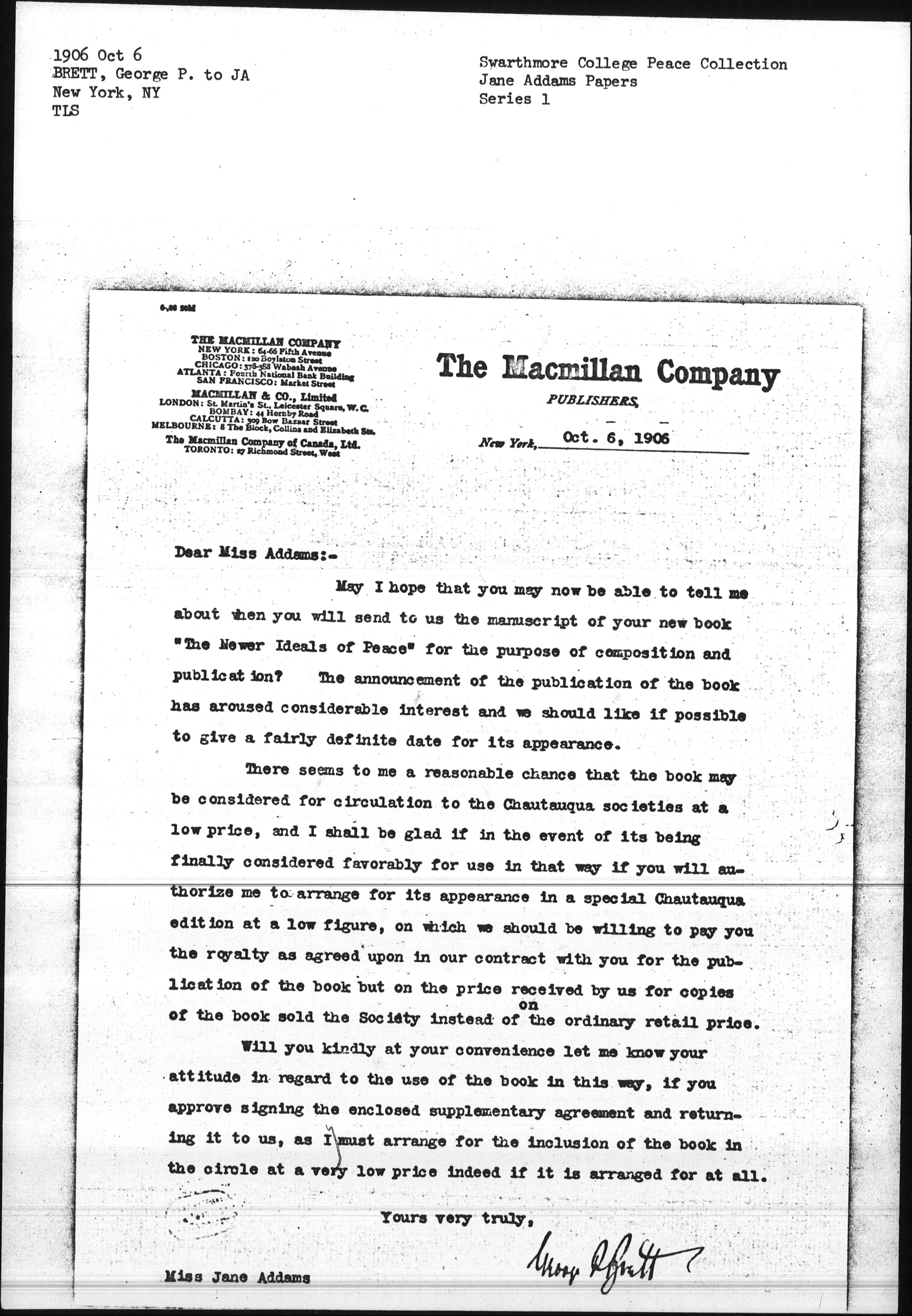 There seems to me a reasonable chance that the book may be considered for circulation to the Chautauqua societies at a low price, and I shall be glad if in the event of its being finally considered favorably for use in that way if you will authorize me to arrange for its appearance in a special Chautauqua edition at a low figure, on which we should be willing to pay you the royalty as agreed upon in our contract with you for the publication of the book but on the price received by us for copies of the book sold the Society instead of ↑on↓ the ordinary retail price.