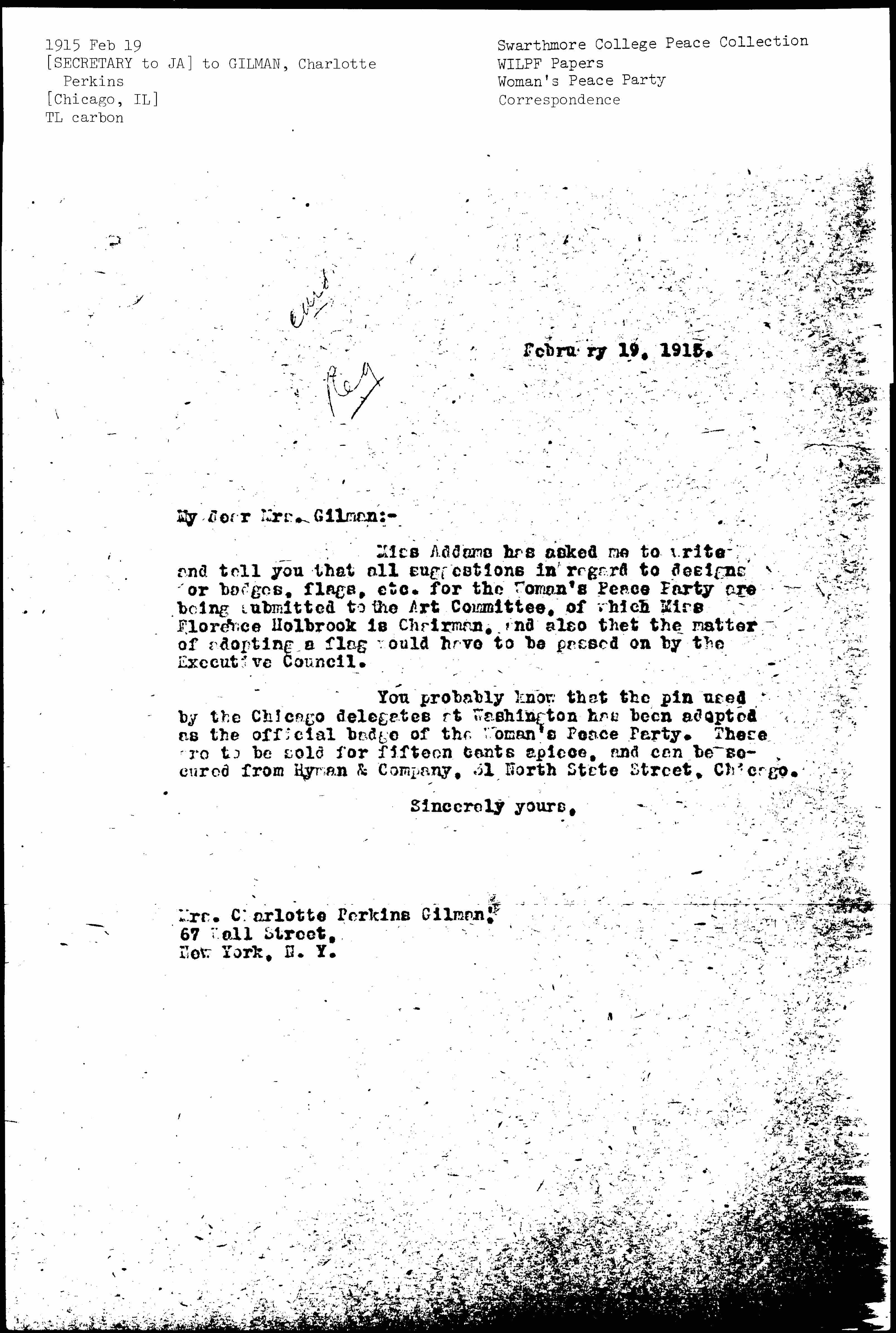 Miss Addams has asked me to write and tell you that all suggestions in regard to designs for badges, flags, etc. for the Woman's Peace Party are being submitted to the Art Committee, of which Miss Florence Holbrook is Chairman, and also that the matter of adopting a flag would have to be passed on by the Executive Council.