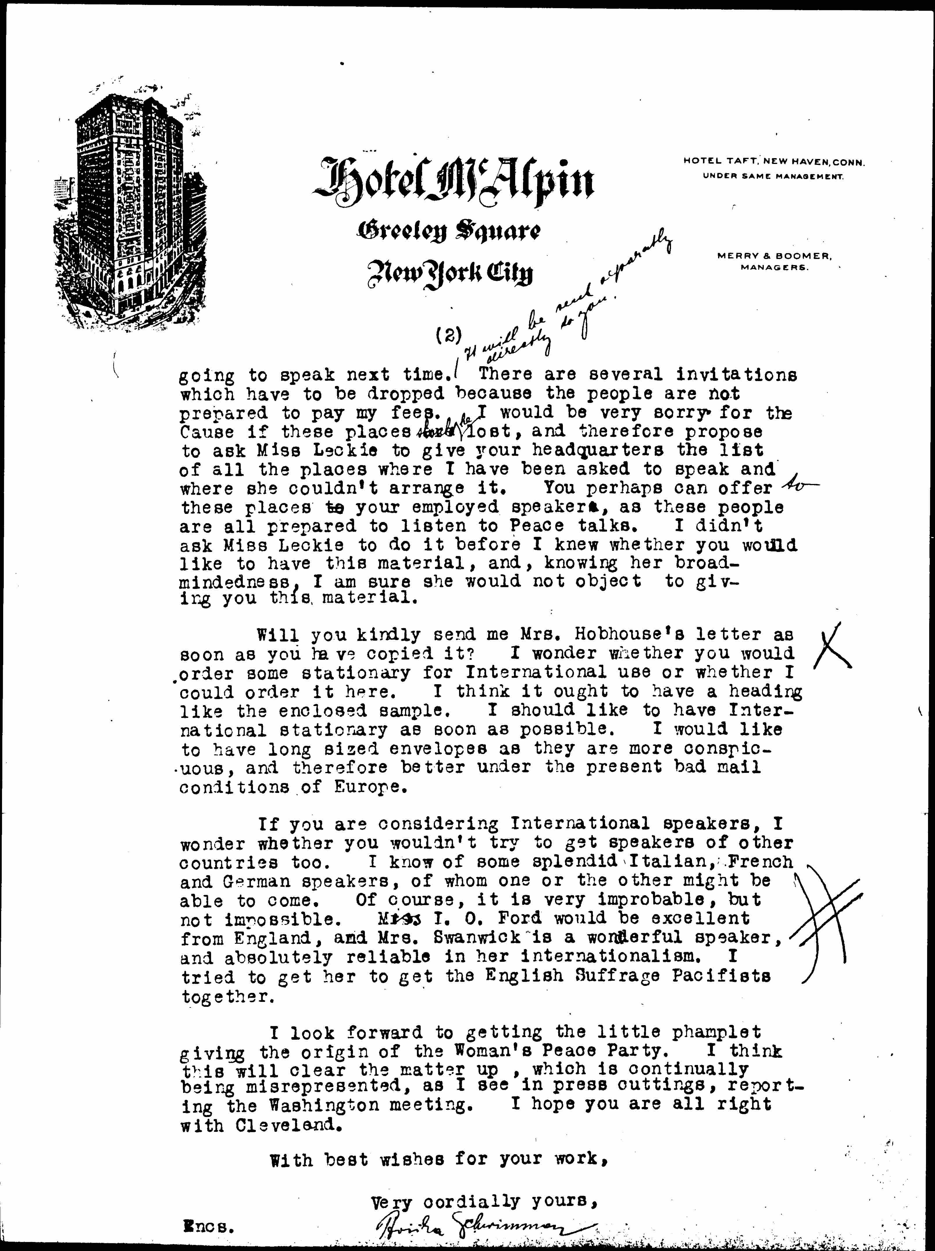 Will you kindly send me Mrs. Hobhouse's letter as soon as you have copied it? I wonder whether you would order some [stationery] for International use or whether I could order it here. I think it ought to have a heading like the enclosed sample. I should like to have International [stationery] as soon as possible. I would like to have long sized envelopes as they are more conspicuous, and therefore better under the present bad mail conditions of Europe.