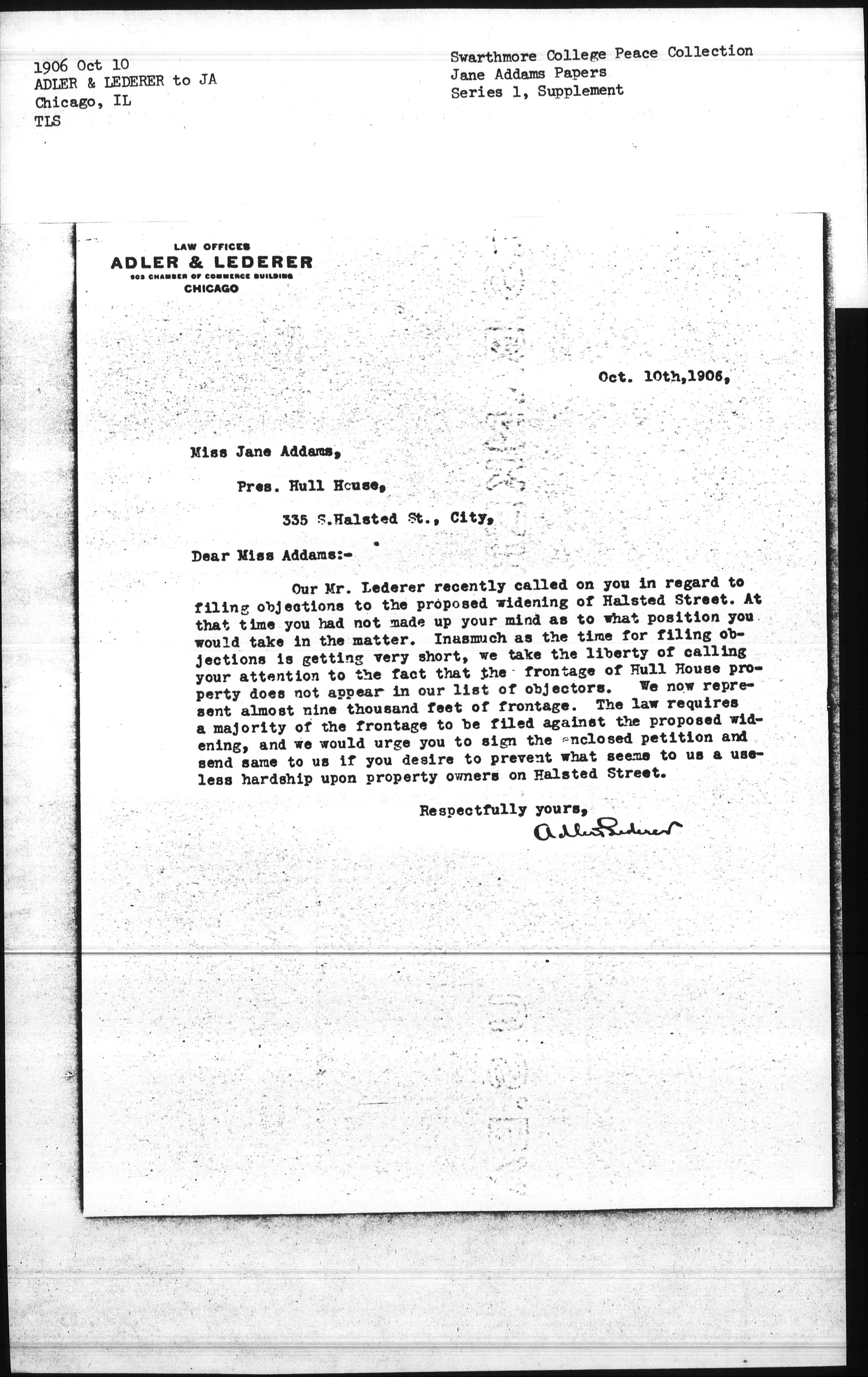 Our Mr. Lederer recently called on you in regard to filing objections to the proposed widening of Halsted Street. At that time you had not made up your mind as to what position you would take in the matter. Inasmuch as the time for filing objections is getting very short, we take the liberty of calling your attention to the fact that the frontage of Hull House property does not appear in our list of objectors. We now represent almost nine thousand feet of frontage. The law requires a majority of the frontage to be filed against the proposed widening, and we would urge you to sign the enclosed petition and send same to us if you desire to prevent what seems to us a useless hardship upon property owners on Halsted Street.