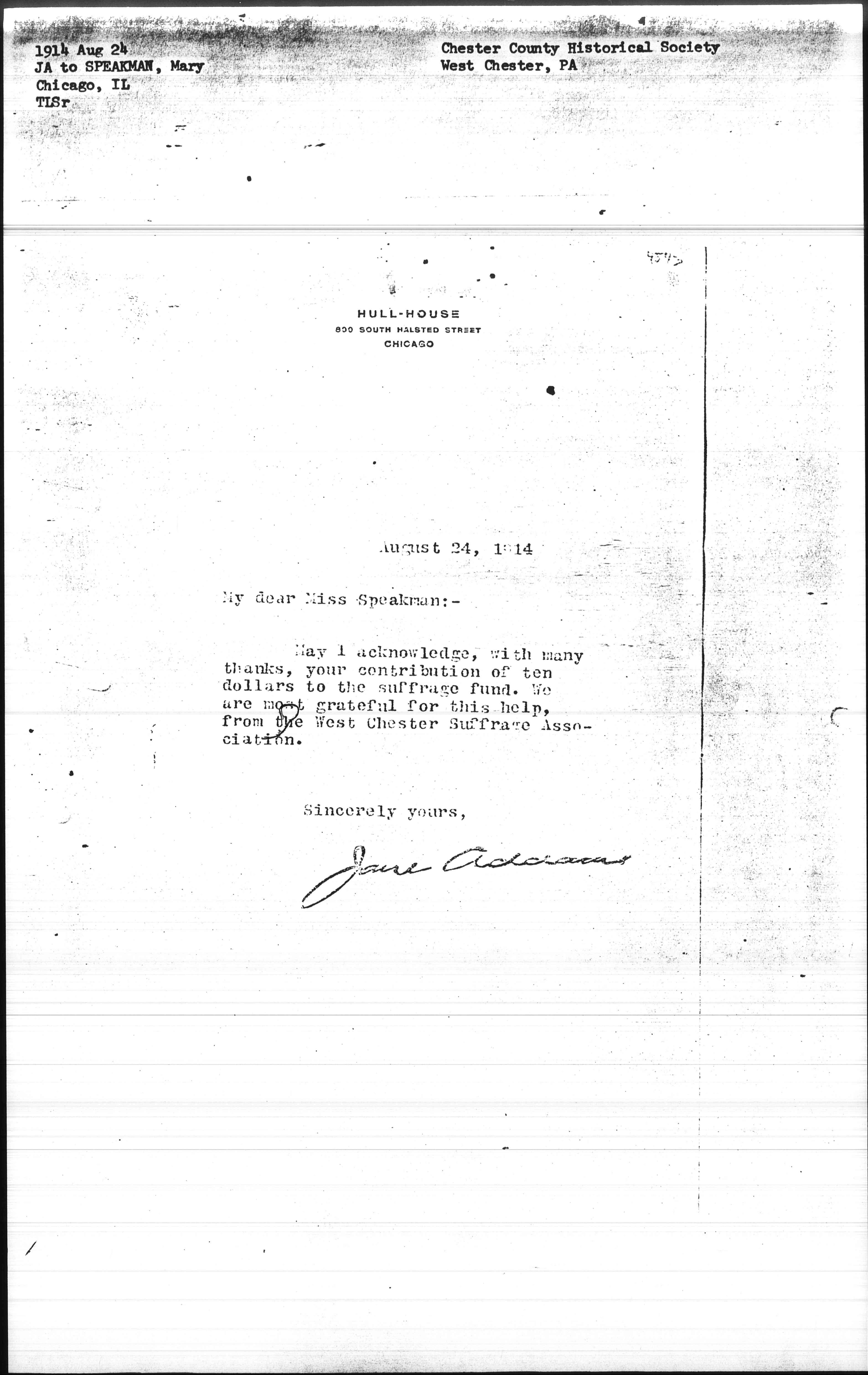 May I acknowledge, with many thanks, your contribution of ten dollars to the suffrage fund. We are most grateful for this help, from the West Chester Suffrage Association.