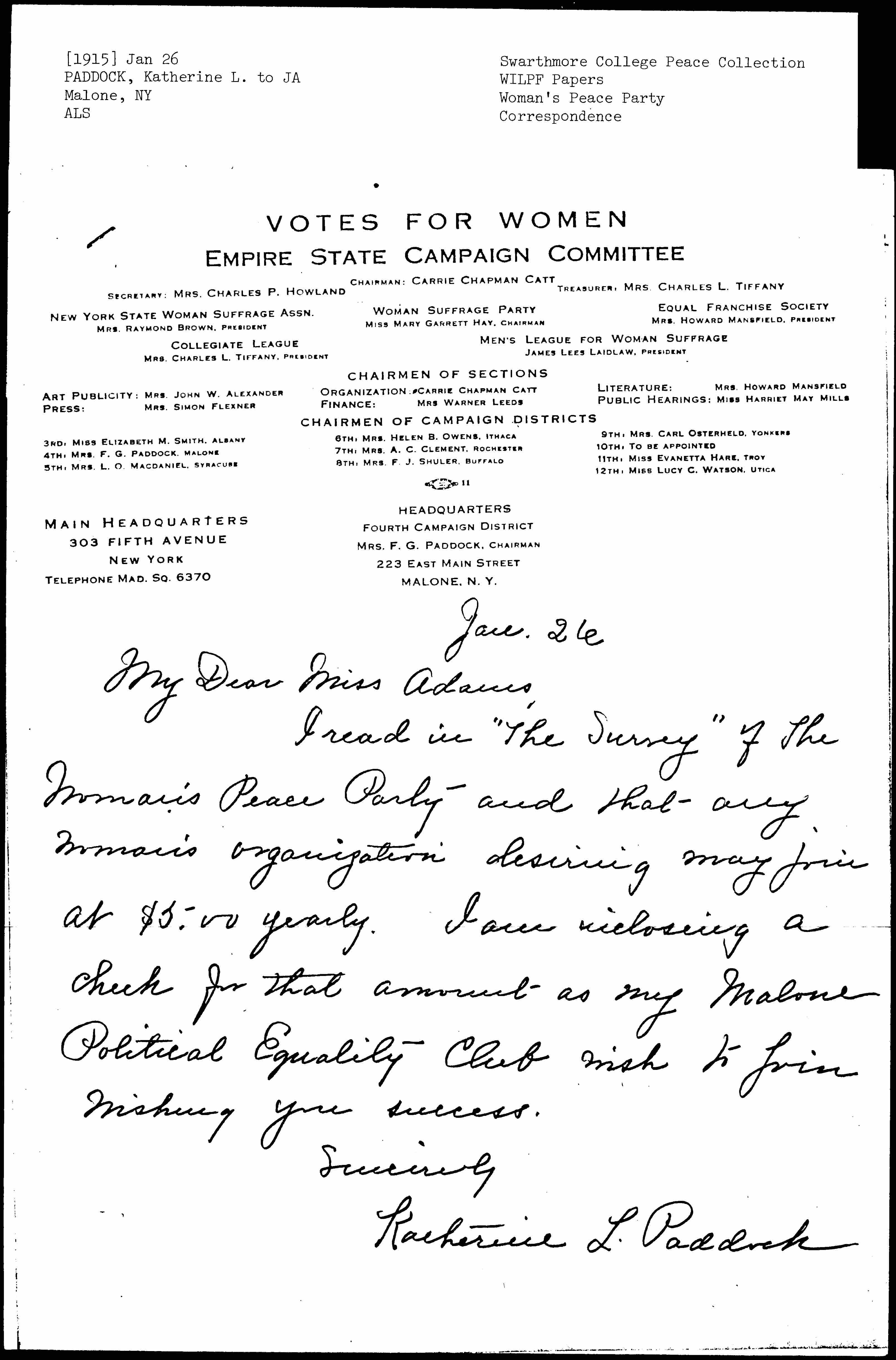 I read in "The Survey" of the Woman's Peace Party and that any woman's organization desiring may join at $5.00 yearly. I am [enclosing] a check for that amount as my Malone Political Equality Club wish to join.