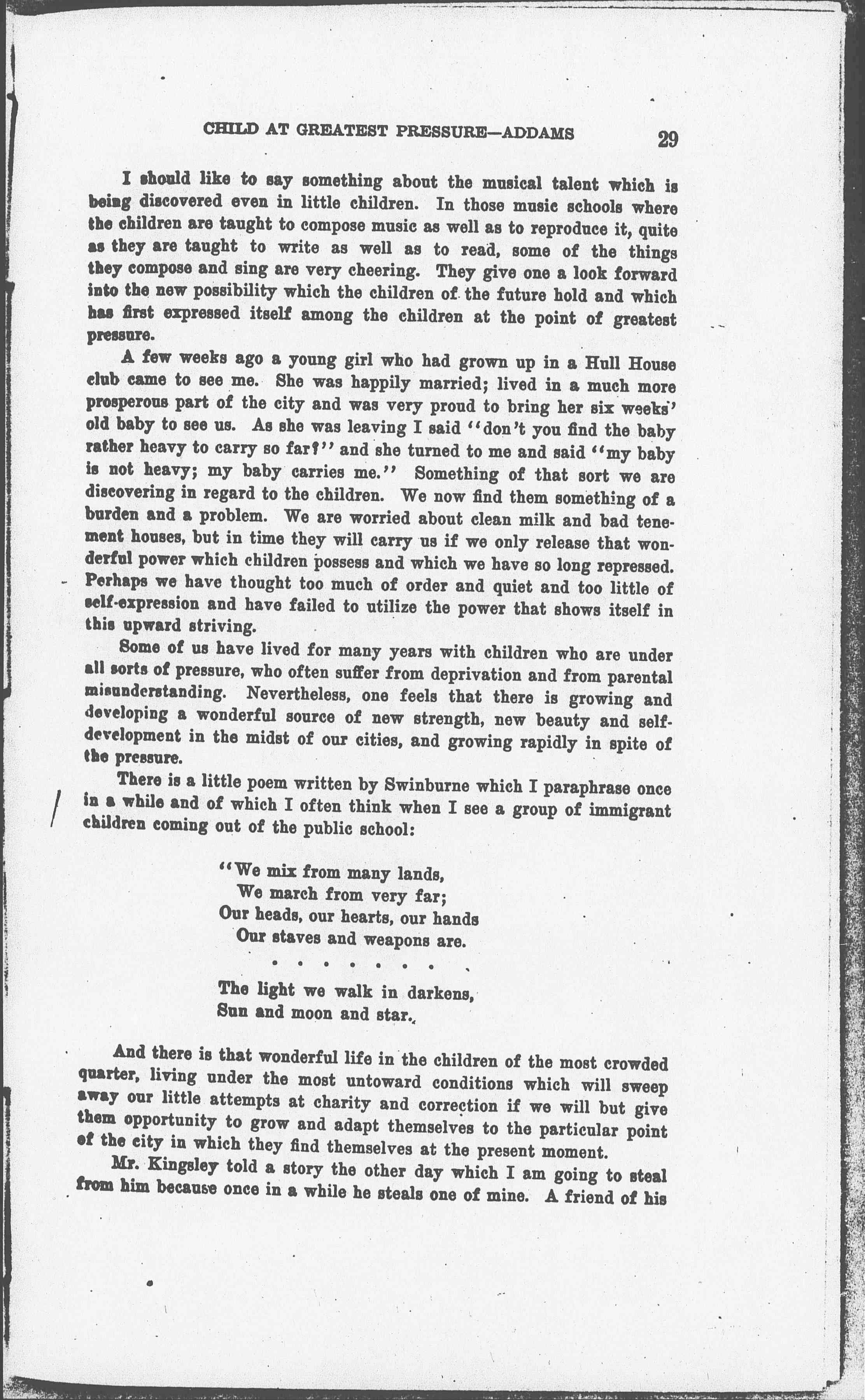 A few weeks ago a young girl who had grown up in a Hull House club came to see me. She was happily married; lived in a much more prosperous part of the city and was very proud to bring her six weeks' old baby to see us. As she was leaving I said "don't you find the baby rather heavy to carry so far?" and she turned to me and said "my baby is not heavy; my baby carries me." Something of that sort we are discovering in regard to the children. We now find them something of a burden and a problem. We are worried about clean milk and bad tenement houses, but in time they will carry us if we only release that wonderful power which children possess and which we have so long repressed. Perhaps we have thought too much of order and quiet and too little of self-expression and have failed to utilize the power that shows itself in this upward striving.