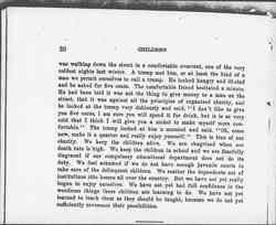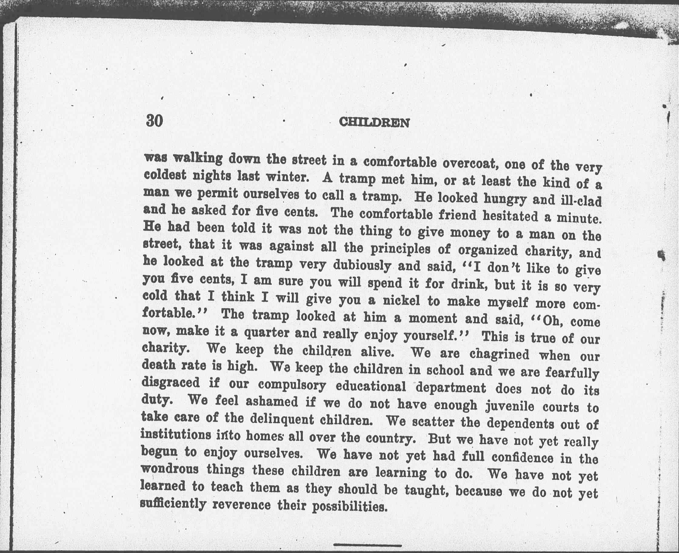 Mr. Kingsley told a story the other day which I am going to steal from him because once in a while he steals one of mine. A friend of his [Page 5] was walking down the street in a comfortable overcoat, one of the very coldest nights last winter. A tramp met him, or at least the kind of a man we permit ourselves to call a tramp. He looked hungry and ill-clad and he asked for five cents. The comfortable friend hesitated a minute. He had been told it was not the thing to give money to a man on the street, that it was against all the principles of organized charity, and he looked at the tramp very dubiously and said, "I don't like to give you five cents, I am sure you will spend it for drink, but it is so very cold that I think I will give you a nickel to make myself more comfortable." The tramp looked at him a moment and said, "Oh, come how, make it a quarter and really enjoy yourself." This is true of our charity. We keep the children alive. We are chagrined when our death rate is high. We keep the children in school and we are fearfully disgraced if our compulsory educational department does not do its duty. We feel ashamed if we do not have enough juvenile courts to take care of the delinquent children. We scatter the dependents out of institutions into homes all over the country. But we have no yet really begun to enjoy ourselves. We have not yet had full confidence in the wondrous things these children are learning to do. We have not yet learned to teach them as they should be taught, because we do not yet sufficiently reverence their possibilities.