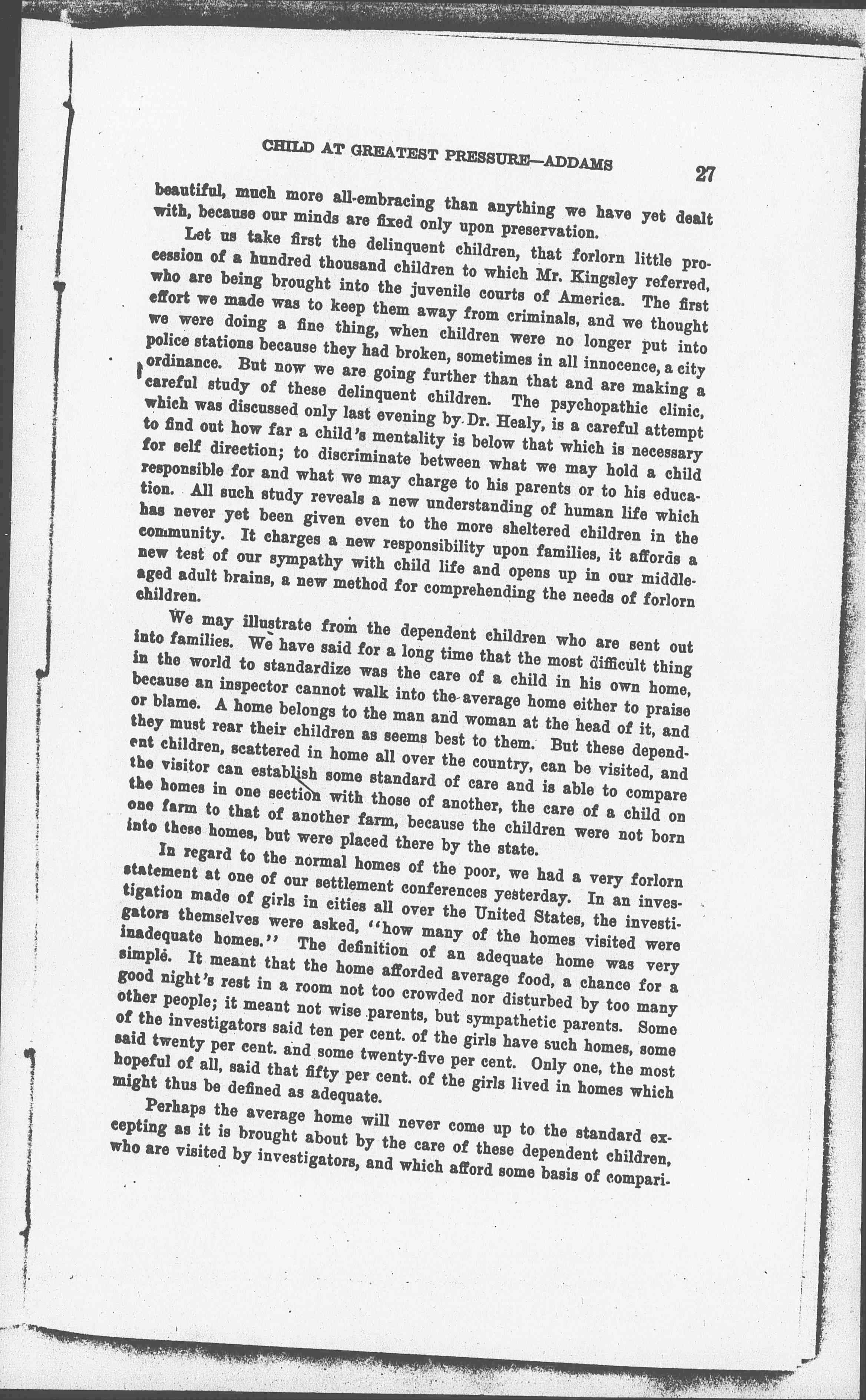 Let us take first the delinquent children, that forlorn little procession of a hundred thousand children to which Mr. Kingsley referred, who are being brought into the juvenile courts of America. The first effort we made was to keep them away from criminals, and we thought we were doing a fine thing, when children were no longer put into police stations because they had broken, sometimes in all innocence, a city ordinance. But now we are going further than that and are making a careful study of these delinquent children. The psychopathic clinic, which was discussed only last evening by Dr. Healy, is a careful attempt to find out how far a child's mentality is below that which is necessary for self direction; to discriminate between what we may hold a child responsible for and what we may charge to his new parents or to his education. All such study reveals a new understanding of human life which has never yet been given even to the more sheltered children in the community. It charges a new responsibility upon families, it affords a new test of our sympathy with child life and opens up in our middle-aged adult brains, a new method for comprehending the needs of forlorn children.