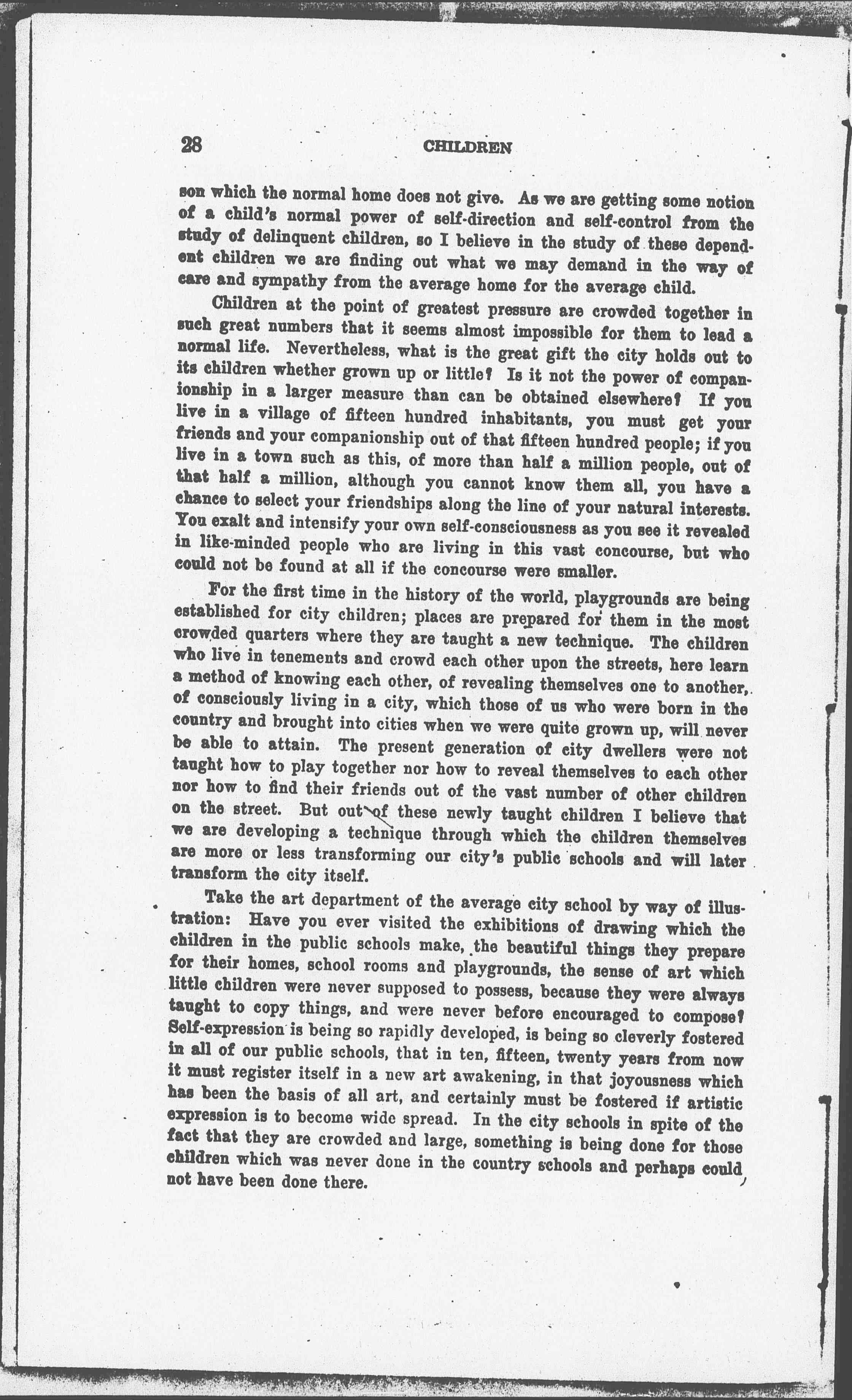 For the first time in the history of the world, playgrounds are being established for city children; places are prepared for them in the most crowded quarters where they are taught a new technique. The children who live in tenements and crowd each other upon the streets, here learn a method of knowing each other, of revealing themselves one to another, of consciously living in a city, which those of us who were born in the country and brought into cities when were quite grown up, will never be able to attain. The present generation of city dwellers were not taught how to play together nor how to reveal themselves to each other nor how to find their friends out of the vast number of other children on the street. But out of these newly taught children I believe that we are developing a technique through which the children themselves are more or less transforming our city's public schools and will later transform the city itself.