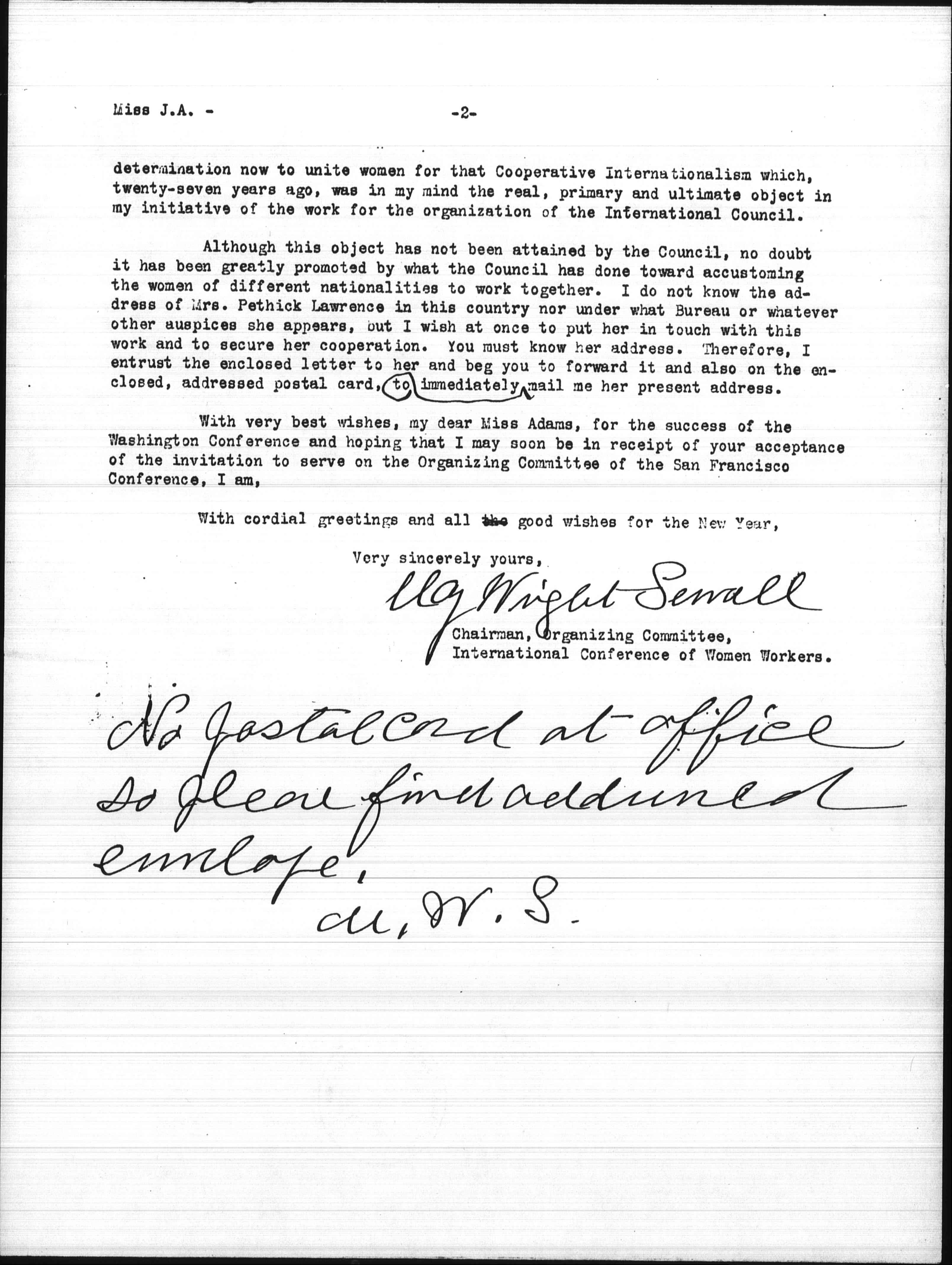 Although this object has not been attained by the Council, no doubt it has been greatly promoted by what the Council has done toward accustoming the women of different nationalities to work together. I do not know the address of Mrs. Pethick Lawrence in this country nor under what Bureau or whatever other auspices she appears, but I wish at once to put her in touch with this work and to secure her cooperation. You must know her address. Therefore, I entrust the enclosed letter to her and beg you to forward it and also on the enclosed, addressed postal card, immediately to mail me her present address.