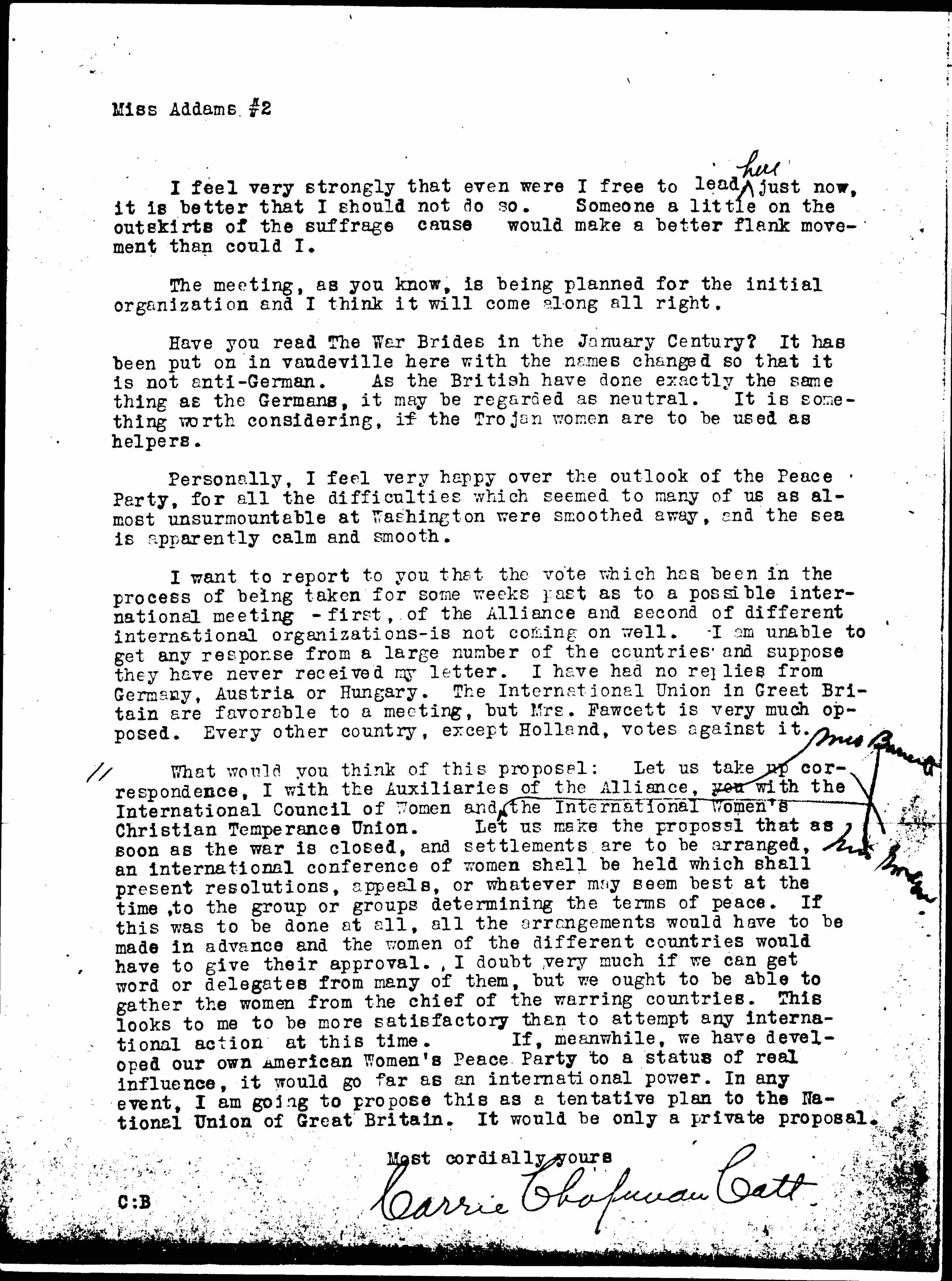 What would you think of this proposal: Let us take up correspondence, I with the Auxiliaries of the Alliance, you <Mrs Barrett> with the International Council of Women and <Miss Gordon> the International Women's Christian Temperance Union. Let us make the proposal that as soon as the war is closed, and settlements are to be arranged, an international conference of women shall be held which shall present resolutions, appeals, or whatever may seem best at the time, to the group or groups determining the terms of peace. If this was to be done at all, all the arrangements would have to be made in advance and the women of the different countries would have to give their approval. I doubt very much if we can get word or delegates from many of them, but we ought to be able to gather the women from the chief of the warring countries. This looks to me to be more satisfactory than to attempt any international action at this time. If, meanwhile, we have developed our own American Women's Peace Party to a status of real influence, it would go far as an international power. In any event, I am going to propose this as a tentative plan to the National Union of Great Britain. It would be only a private proposal.
