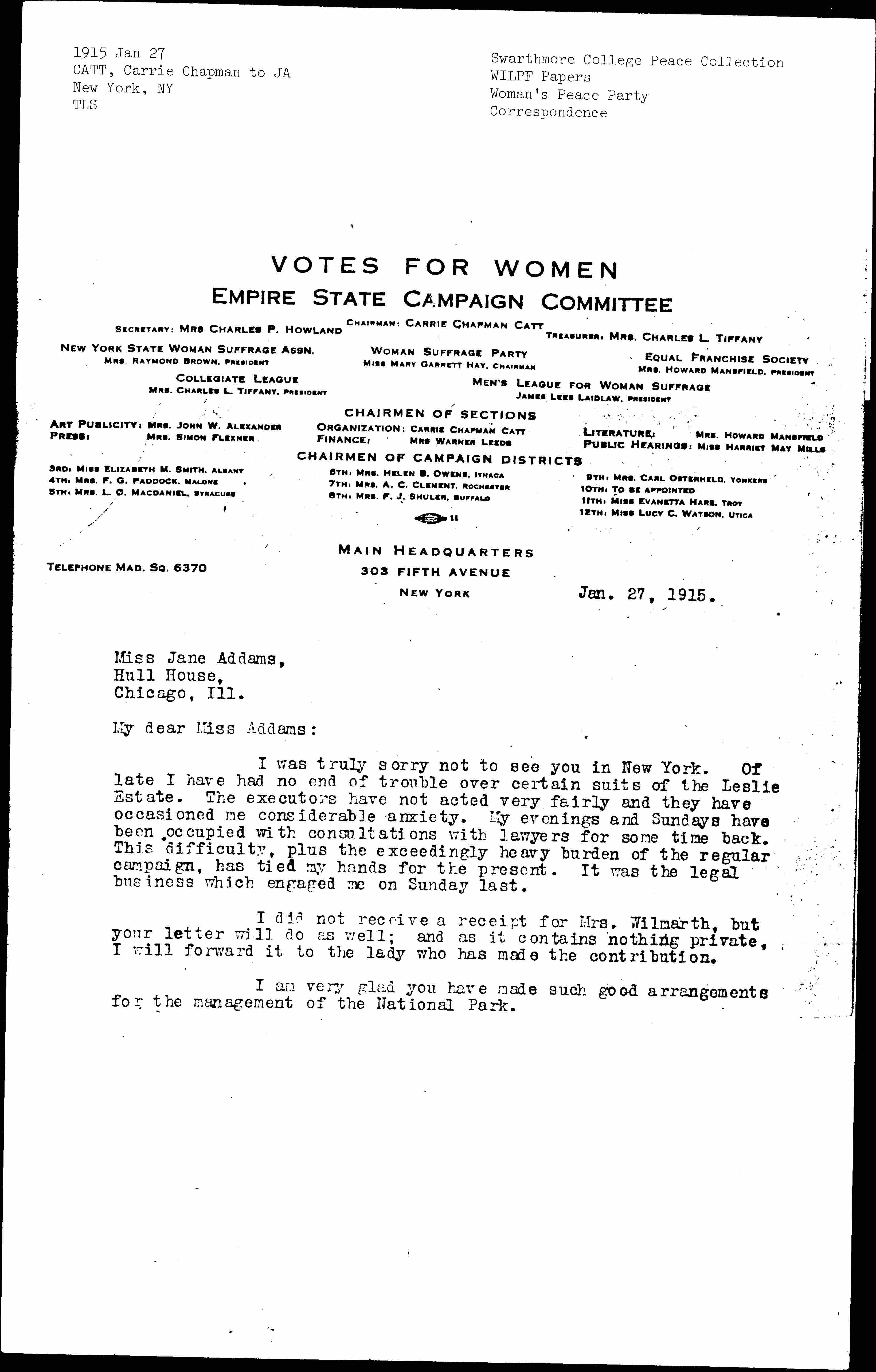 I was truly sorry not to see you in New York. Of late I have had no end of trouble over certain suits of the Leslie Estate. The executors have not acted very fairly and they have occasioned me considerable anxiety. My evenings and Sundays have been occupied with consultations with lawyers for some time back. This difficulty, plus the exceedingly heavy burden of the regular campaign, has tied my hands for the present. It was the legal business which engaged me on Sunday last.
