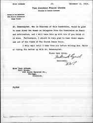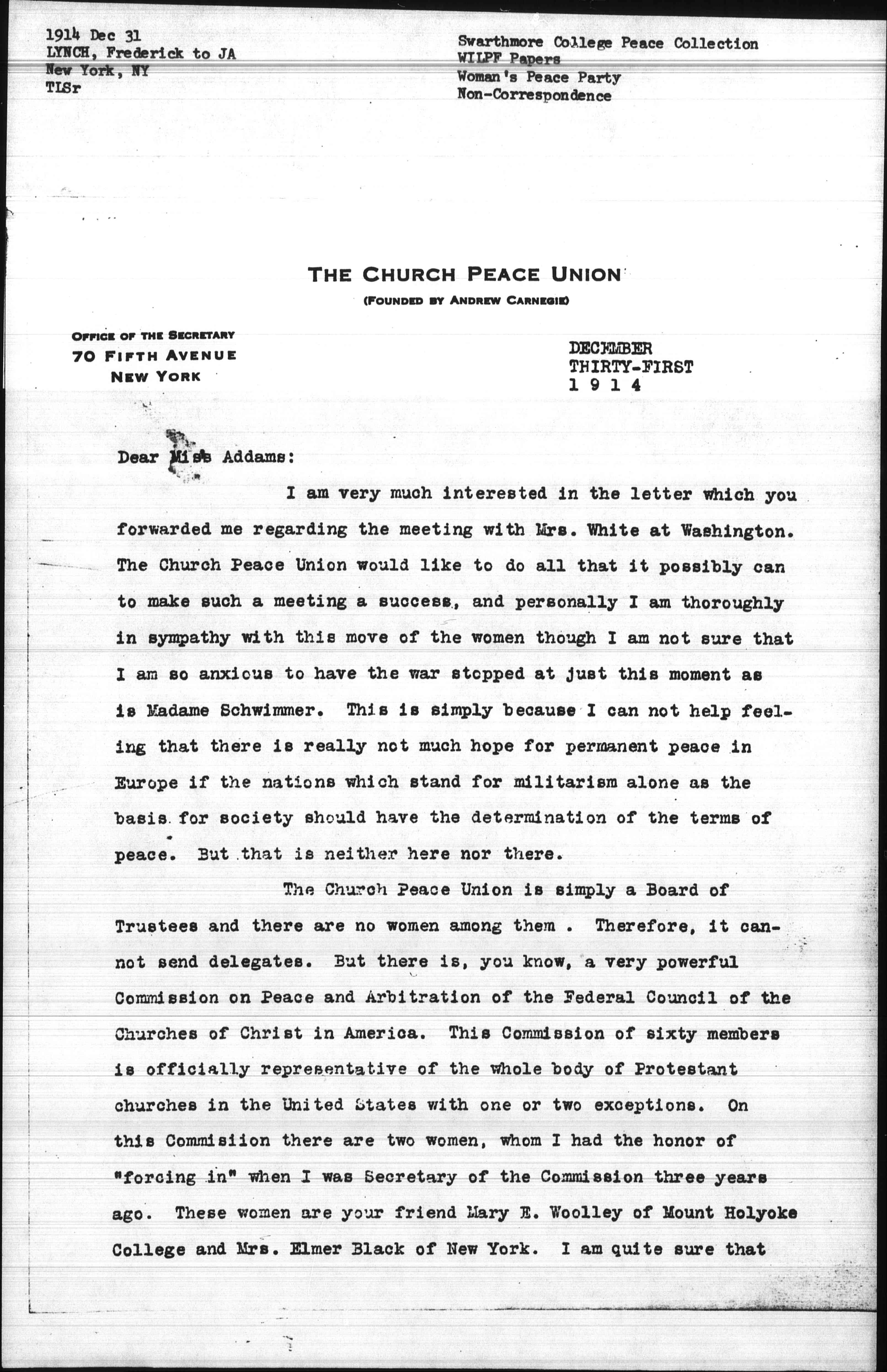 The Church Peace Union is simply a Board of Trustees and there are no women among them. Therefore, it cannot send delegates. But there is, you know, a very powerful Commission on Peace and Arbitration of the Federal Council of the Churches of Christ in America. This Commission of sixty members is officially representative of the whole body of Protestant churches in the United States with one or two exceptions. On this Commission there are two women, whom I had the honor of "forcing in" when I was Secretary of the Commission three years ago. These women are your friend Mary E. Woolley of Mount Holyoke College and Mrs. Elmer Black of New York. I am quite sure that [page 2] Dr. Remensnyder, who is Chairman of this Commission, would be glad to name these two women as delegates from the Commission on Peace and Arbitration, and I will take this up with him if you think it is wise. Furthermore, I should be very glad to bear their expenses out of the funds of The Church Peace Union.