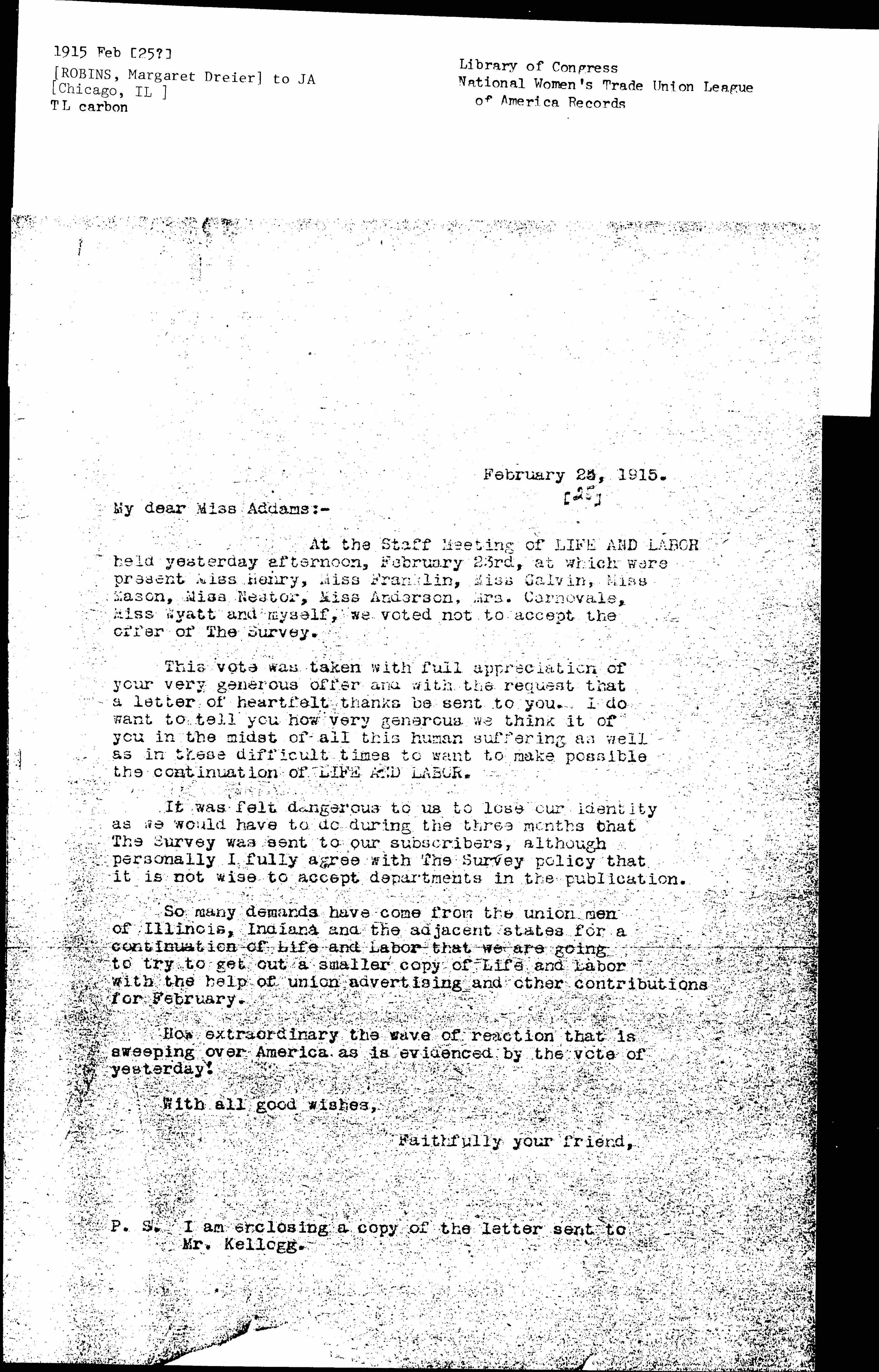 At the Staff Meeting of LIFE AND LABOR held yesterday afternoon, February 23rd, Miss Galvin, Miss Mason, Miss Nestor, Miss Anderson, Mrs. Carnevale, Miss Wyatt and myself, we voted not to accept the offer of The Survey.