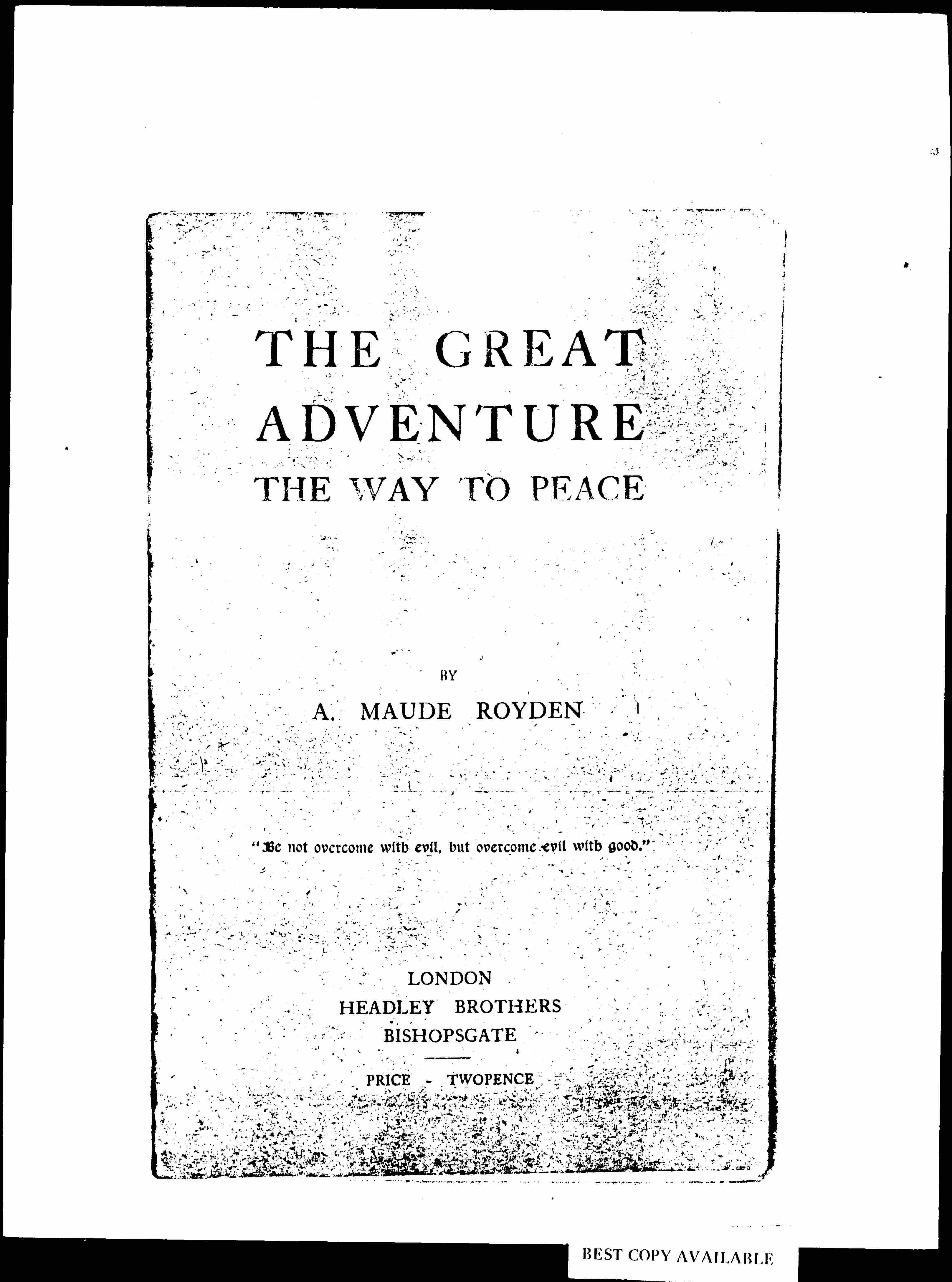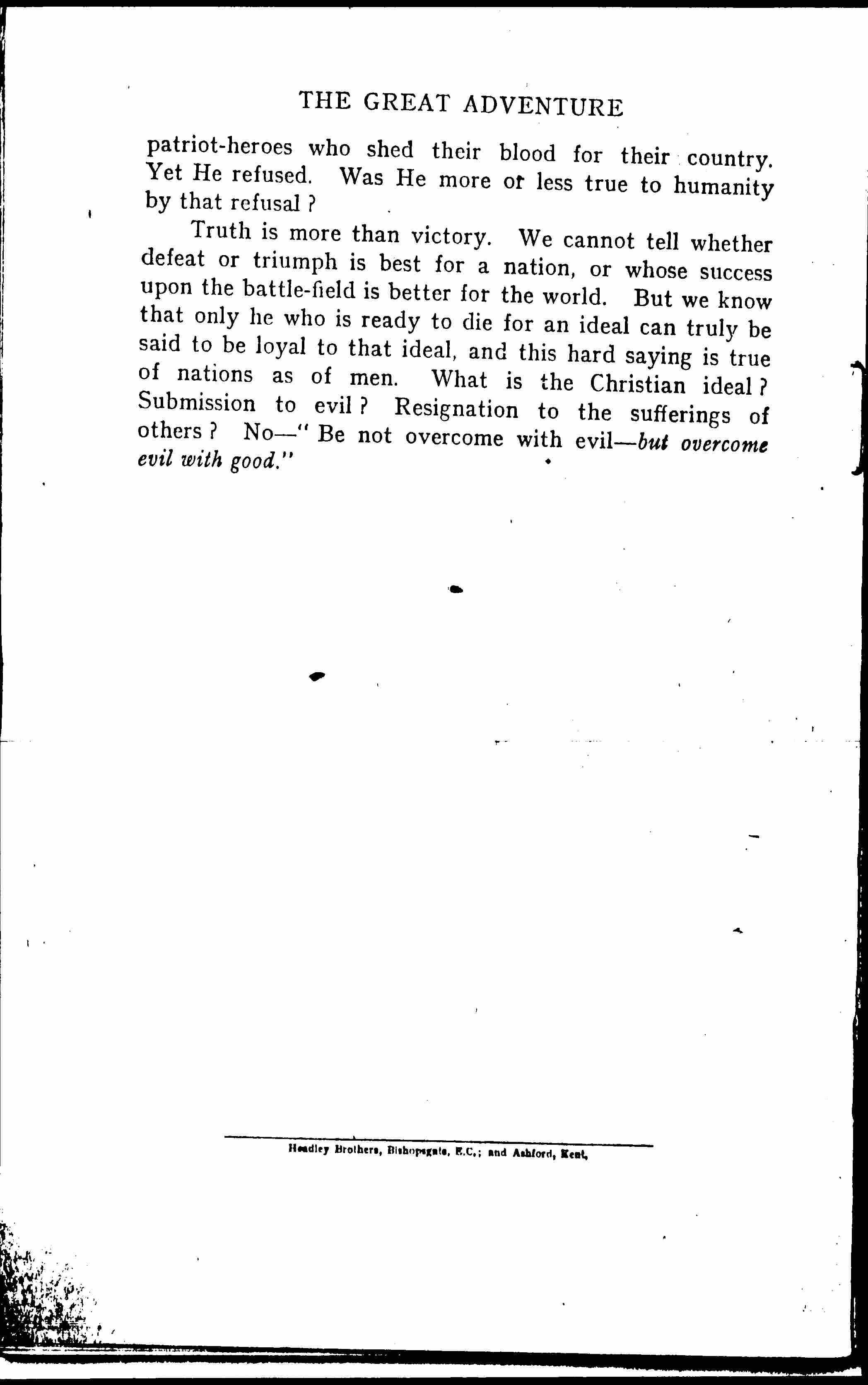 Truth is more than victory. We cannot tell whether defeat or triumph is best for a nation, or whose success upon the battle-field is better for the world. But we know that only he who is ready to die for an ideal can truly be said to be loyal to that ideal, and this hard saying is true of nations as of men. What is the Christian ideal? Submission to evil? Resignation to the sufferings of others? No -- "Be not overcome with evil -- but overcome evil with good." [page 18]