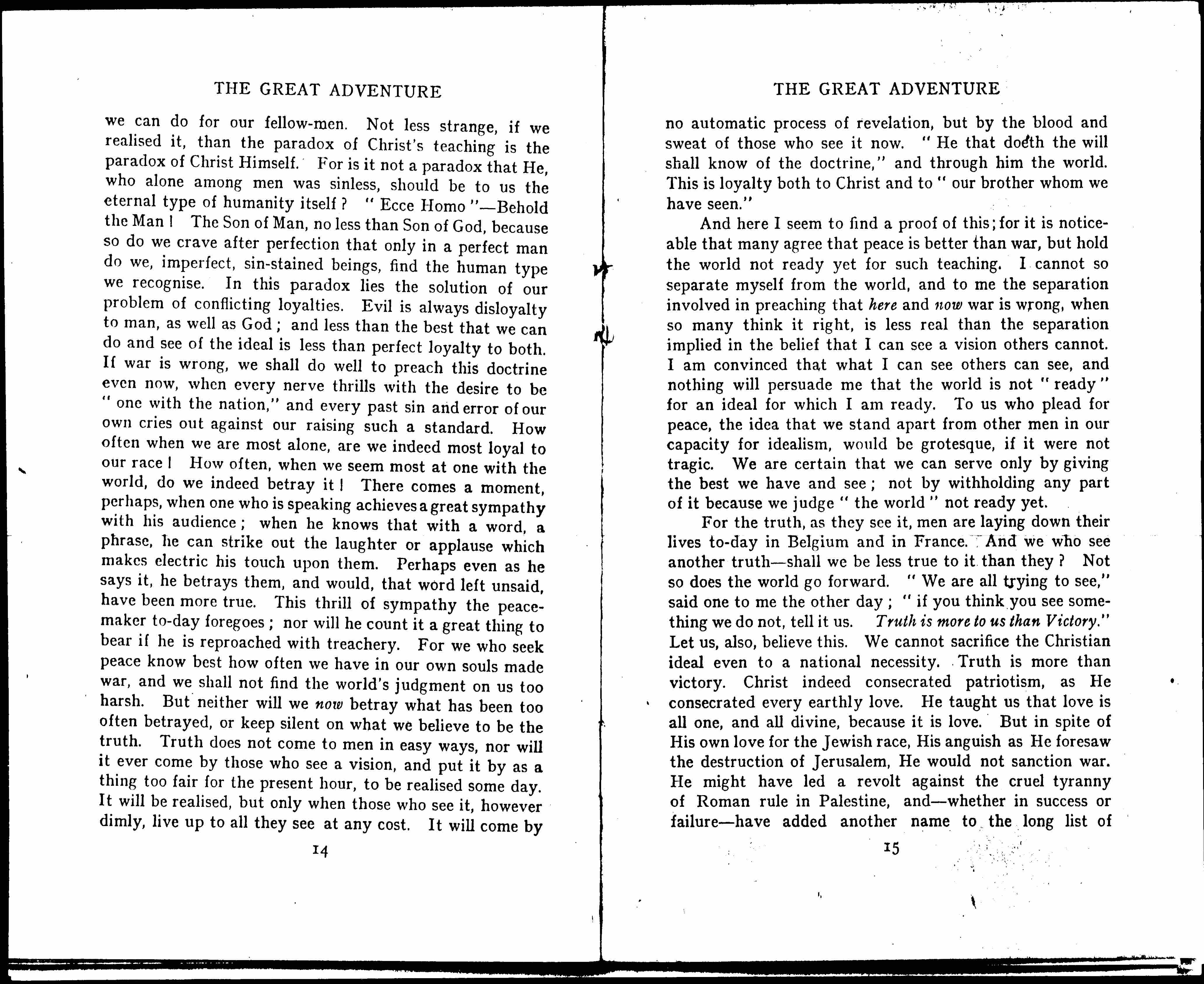 I think we shall be true to men when we are true to Christ, and that by no conceivable tragedy shall we ever find that to do less than the best we can see, is the best that [page 15] we can do for our fellow-men. Not less strange, if we [realized] it, than the paradox of Christ's teaching is the paradox of Christ Himself. For it is not a paradox that He, who alone among men was sinless, should be to us the eternal type of humanity itself? "Ecce Homo" -- Behold the Man! The Son of Man, no less than Son of God, because so do we crave after perfection that only in a perfect man do we, imperfect, sin-stained beings, find the human type we [recognize]. In this paradox lies the solution of our problem of conflicting loyalties. Evil is always disloyalty to man, as well as God; and less than the best that we can do and see of the ideal is less than perfect loyalty to both. If war is wrong, we shall do well to preach this doctrine even now, when every nerve thrills with the desire to be "one with the nation," and every past sin and error of our own cries out against our raising such a standard. How often when we are most alone, are we indeed most loyal to our race! How often, when we seem most at one with the world, do we indeed betray it! There comes a moment, perhaps, when one who is speaking achieves a great sympathy with his audience; when he knows that with a word, a phrase, he can strike out the laughter or applause which makes electric his touch upon them. Perhaps even as he says it, he betrays them, and would, that word left unsaid, have been more true. This thrill of sympathy the peacemaker [today] foregoes; nor will he count it a great thing to bear if he is reproached with treachery. For we who seek peace know best how often we have in our own souls made war, and we shall not find the world's judgment on us too harsh. But neither will we now betray what has been too often betrayed, or keep silent on what we believe to be the truth. Truth does not come to men in easy ways, nor will it ever come by those who see a vision, and put it by as a thing too fair for the present hour, to be [realized] some day. It will be [realized], but only when those who see it, however dimly, live up to all they see at any cost. It will come by [page 16] no automatic process of revelation, but by the blood and sweat of those who see it now. "He that doeth the will shall know of the doctrine," and through him the world. This is loyalty both to Christ and to "our brother whom we have seen."
