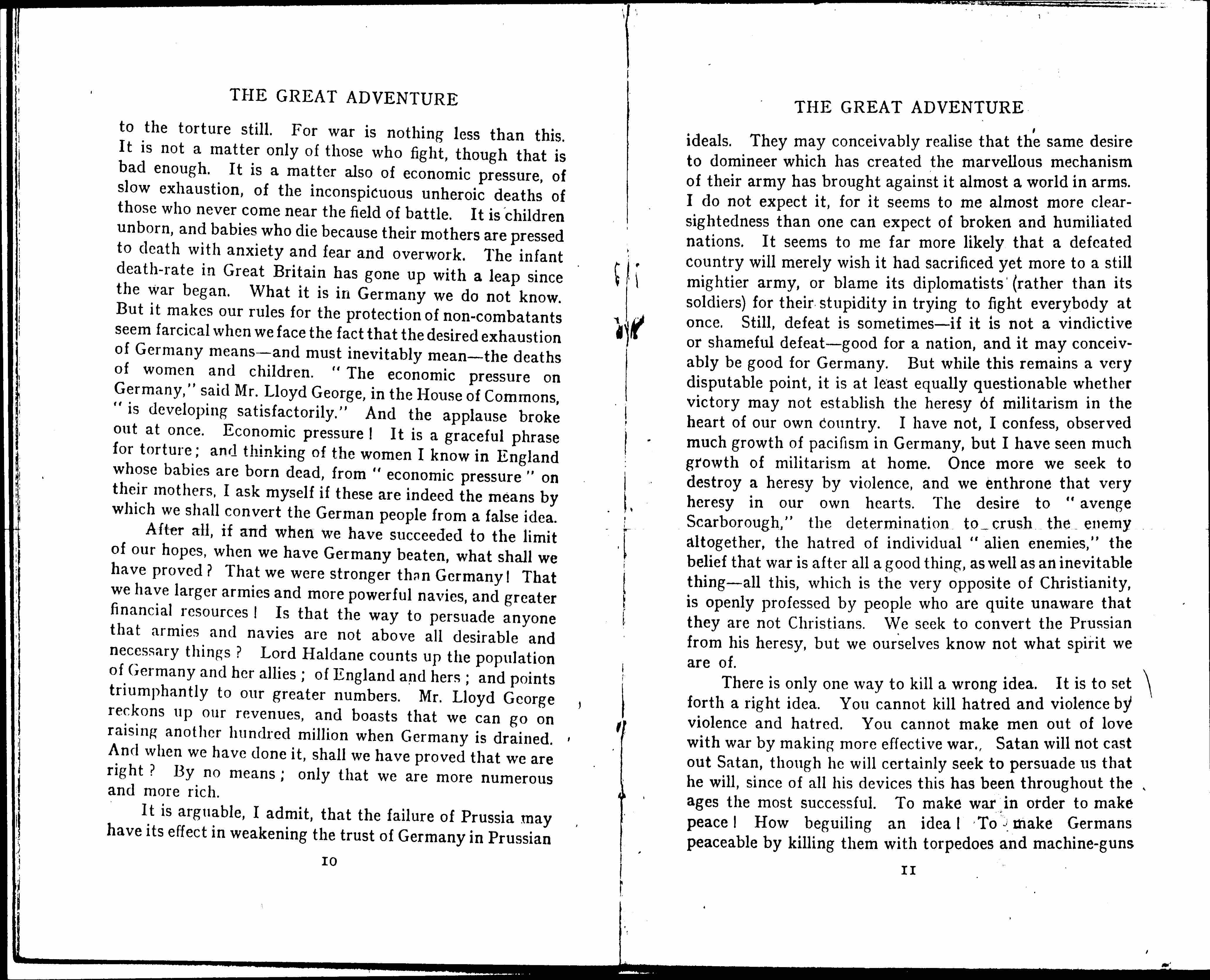 But is it not time that we abandoned the hope of exterminating heresies by killing heretics? The history of the Christian Church is stained with blood shed in this belief. And it is true that, though very rarely, "heresies" have sometimes been for a time crushed out in blood. But to do this is to fall into a worse heresy -- it is to believe that such cruelty is justifiable. We no longer torture those who disagree with us theologically; but we seek to put a nation [page 11] to the torture still. For war is nothing less than this. It is not a matter only of those who fight, though that is bad enough. It is a matter also of economic pressure, of slow exhaustion, of the inconspicuous unheroic deaths of those who never come near the field of battle. It is children unborn, and babies who die because their mothers are pressed to death with anxiety and fear and overwork. The infant death-rate in Great Britain has gone up with a leap since the war began. What it is in Germany we do not know. But it makes our rules for the protection of non-combatants seem farcical when we face the fact that the desired exhaustion of Germany means -- and must inevitably mean -- the deaths of women and children. "The economic pressure on Germany," said Mr. Lloyd George, in the House of Commons, "is developing satisfactorily." And the applause broke out at once. Economic pressure! It is a graceful phrase for torture; and thinking of the women I know in England whose babies are born dead, from "economic pressure" on their mothers, I ask myself if these are indeed the means by which we shall convert the German people from a false idea.
