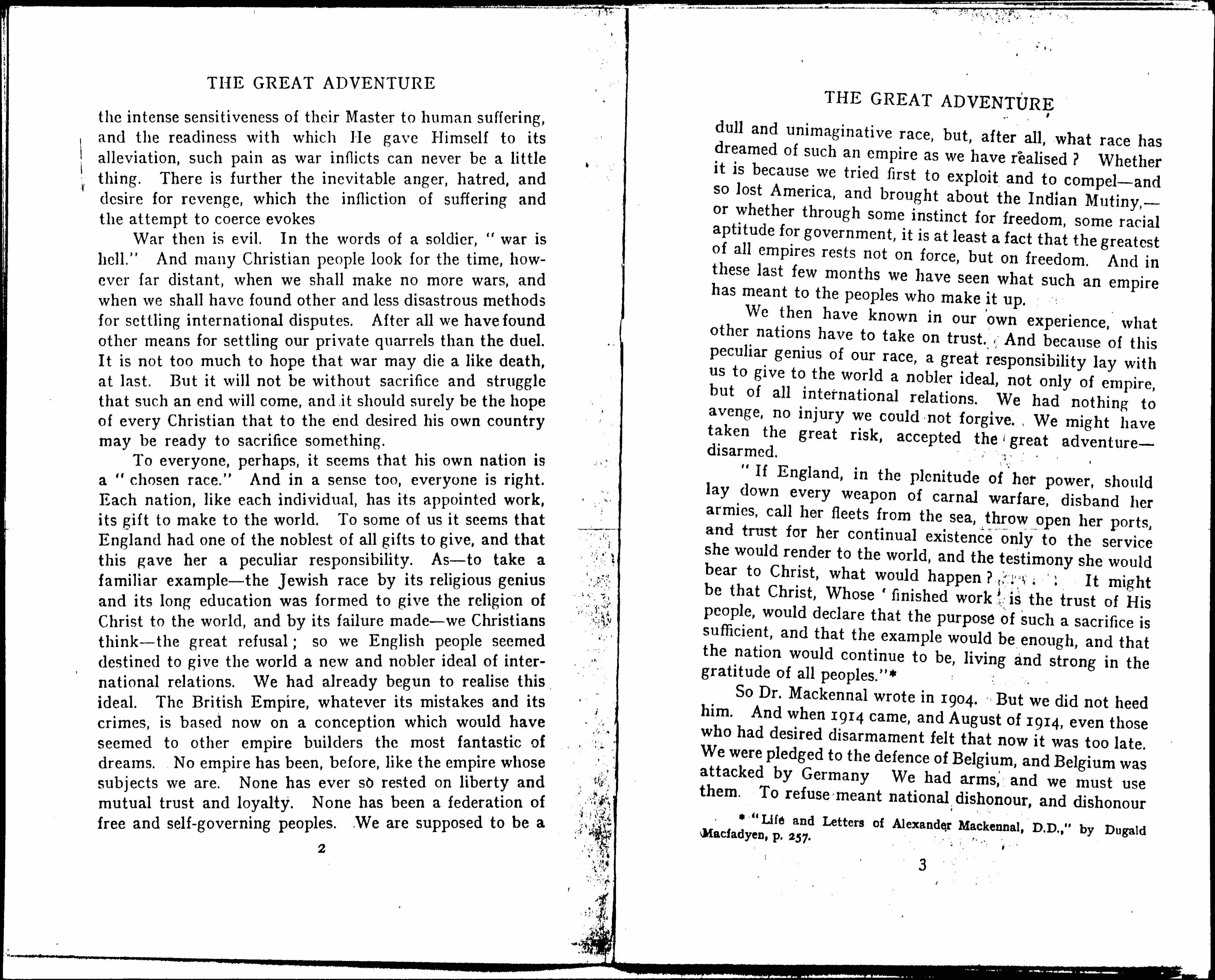 So Dr. Mackennal wrote in 1904. But we did not heed him. And when 1914 came, and August of 1914, even those who had desired disarmament felt that now it was too late. We were pledged to the [defense] of Belgium, and Belgium was attacked by Germany. We had arms, and we must use them. To refuse meant national [dishonor], and [dishonor] [page 5] is worse than the worst of wars. And so it followed that in going to war Sir Edward Grey had behind him the whole weight of the nation, not only his own party, not only the war-lovers -- if any love war -- but those who hate and loathe war, those who have toiled for peace, those who are the best Christians as well as the wisest statesmen, and the bravest soldiers among us.