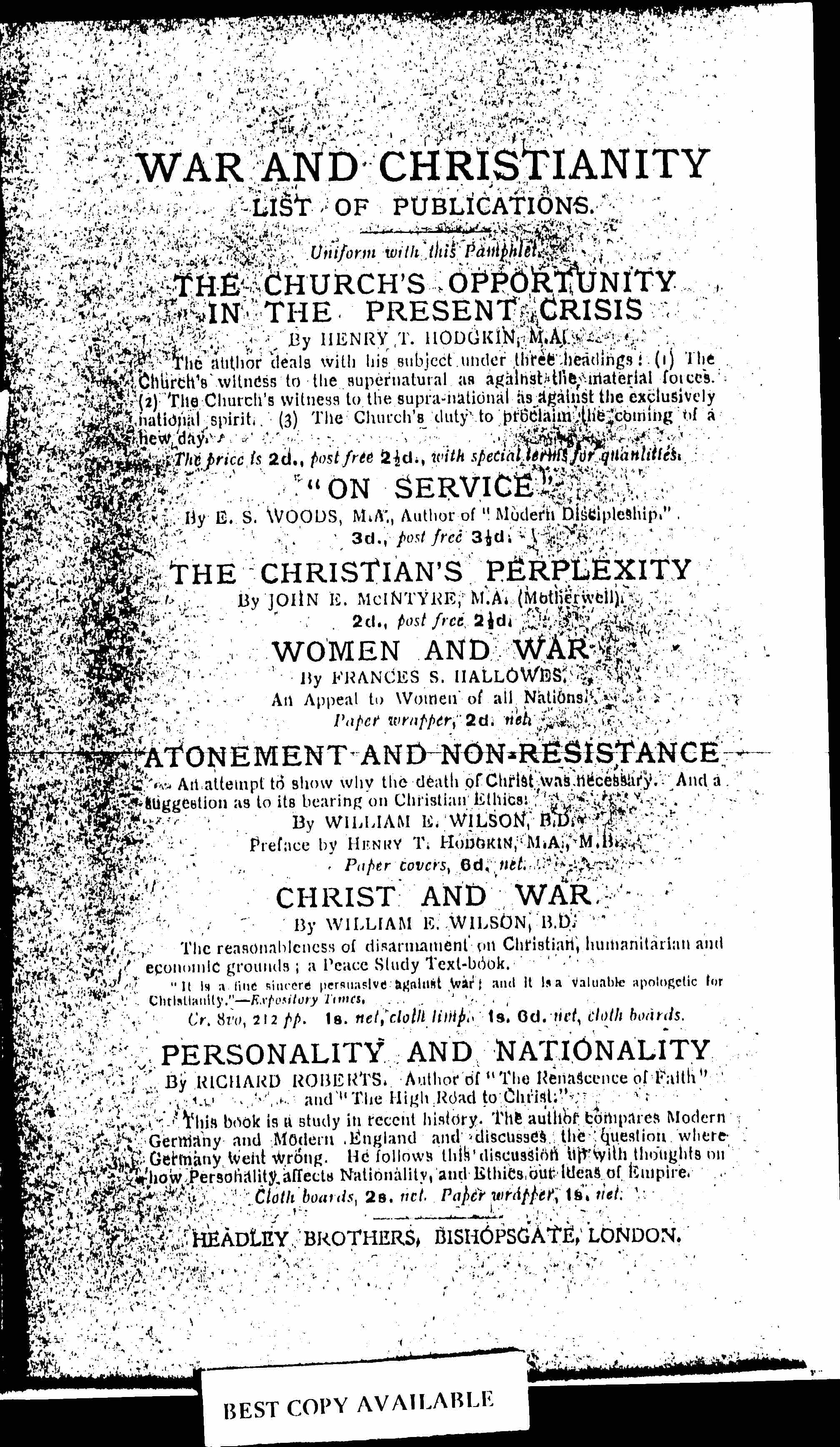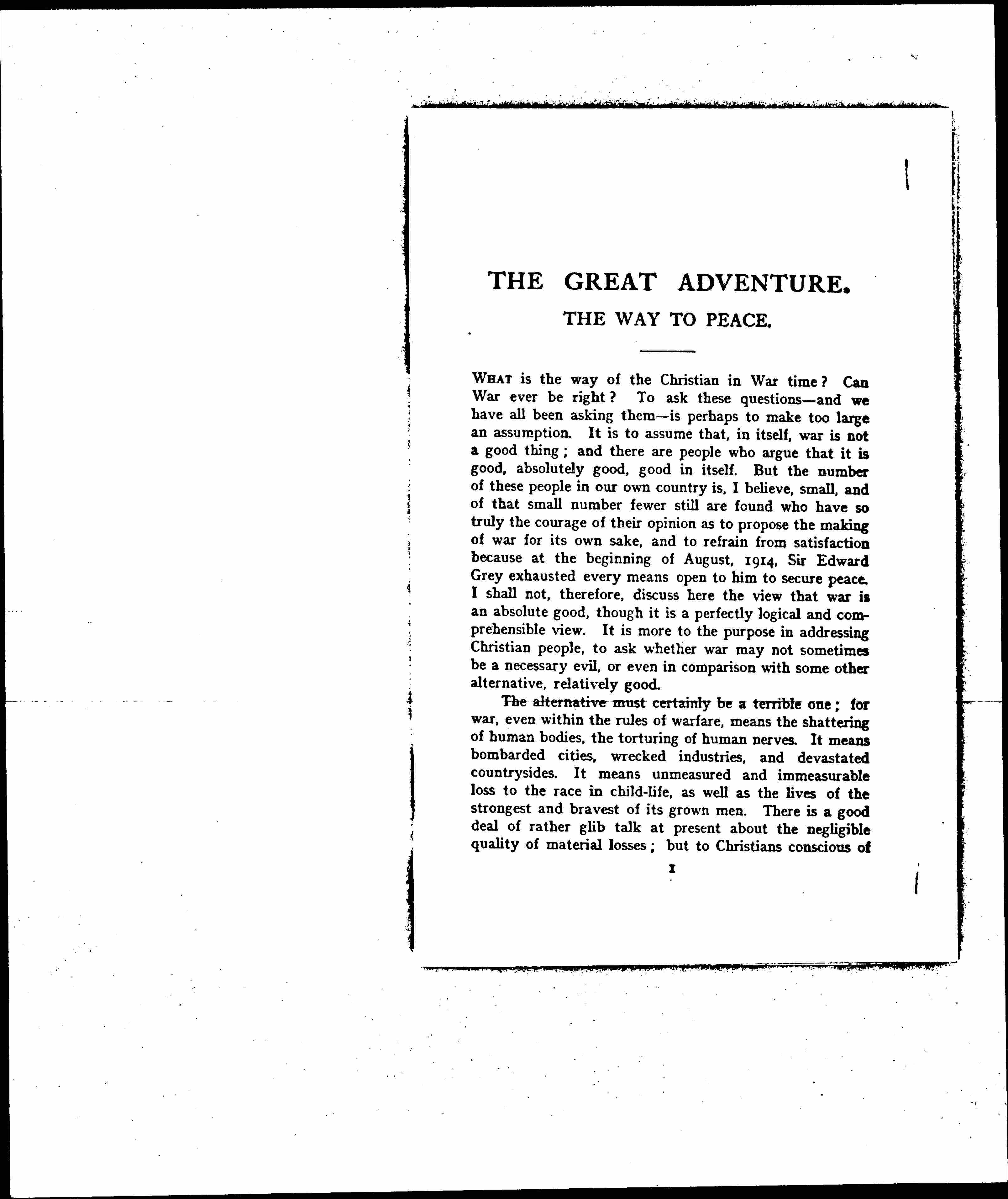 The alternative must certainly be a terrible one; for war, even within the rules of warfare, means the shattering of human bodies, the torturing of human nerves. It means bombarded cities, wrecked industries, and devastated countrysides. It means unmeasured and immeasurable loss to the race in child-life, as well as the lives of the strongest and bravest of its grown men. There is a good deal of rather glib talk at present about the negligible quality of material losses; but to Christians conscious of [page 3] the intense sensitiveness of their Master to human suffering, and the readiness with which He gave Himself to its alleviation, such pain as war inflicts can never be a little thing. There is further the inevitable anger, hatred, and desire for revenge, which the infliction of suffering and the attempt to coerce evokes.