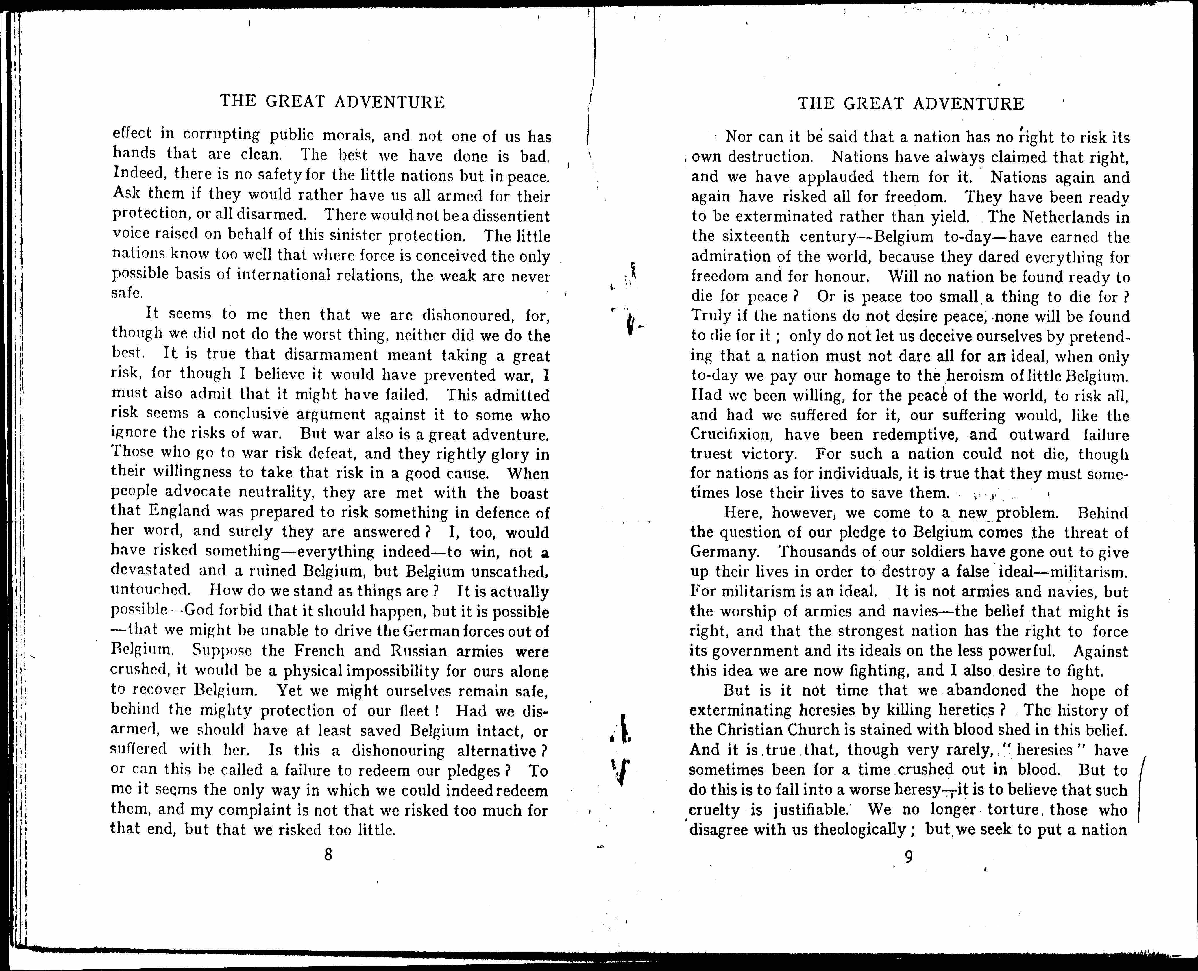 It seems to me then that we are [dishonured], for, though we did not do the worst thing, neither did we do the best. It is true that disarmament meant taking a great risk, for though I believe it would have prevented war, I must also admit that it might have failed. This admitted risk seems a conclusive argument against it to some who ignore the risks of war. But war also is a great adventure. Those who go to war risk defeat, and they rightly glory in their willingness to take that risk in a good cause. When people advocate neutrality, they are met with the boast that England was prepared to risk something in [defense] of her word, and surely they are answered? I, too, would have risked something -- everything indeed -- to win, not a devastated and a ruined Belgium, but Belgium unscathed, untouched. How do we stand as things are? It is actually possible -- God forbid that it should happen, but it is possible -- that we might be unable to drive the German forces out of Belgium. Suppose the French and Russian armies were crushed, it would be a physical impossibility for ours alone to recover Belgium. Yet we might ourselves remain safe, behind the mighty protection of our fleet! Had we disarmed, we should have at least saved Belgium intact, or suffered with her. Is this a [dishonoring] alternative? Or can this be called a failure to redeem our pledges? To me it seems the only way in which we could indeed redeem them, and my complaint is not that we risked too much for that end, but that we risked too little. [page 10]