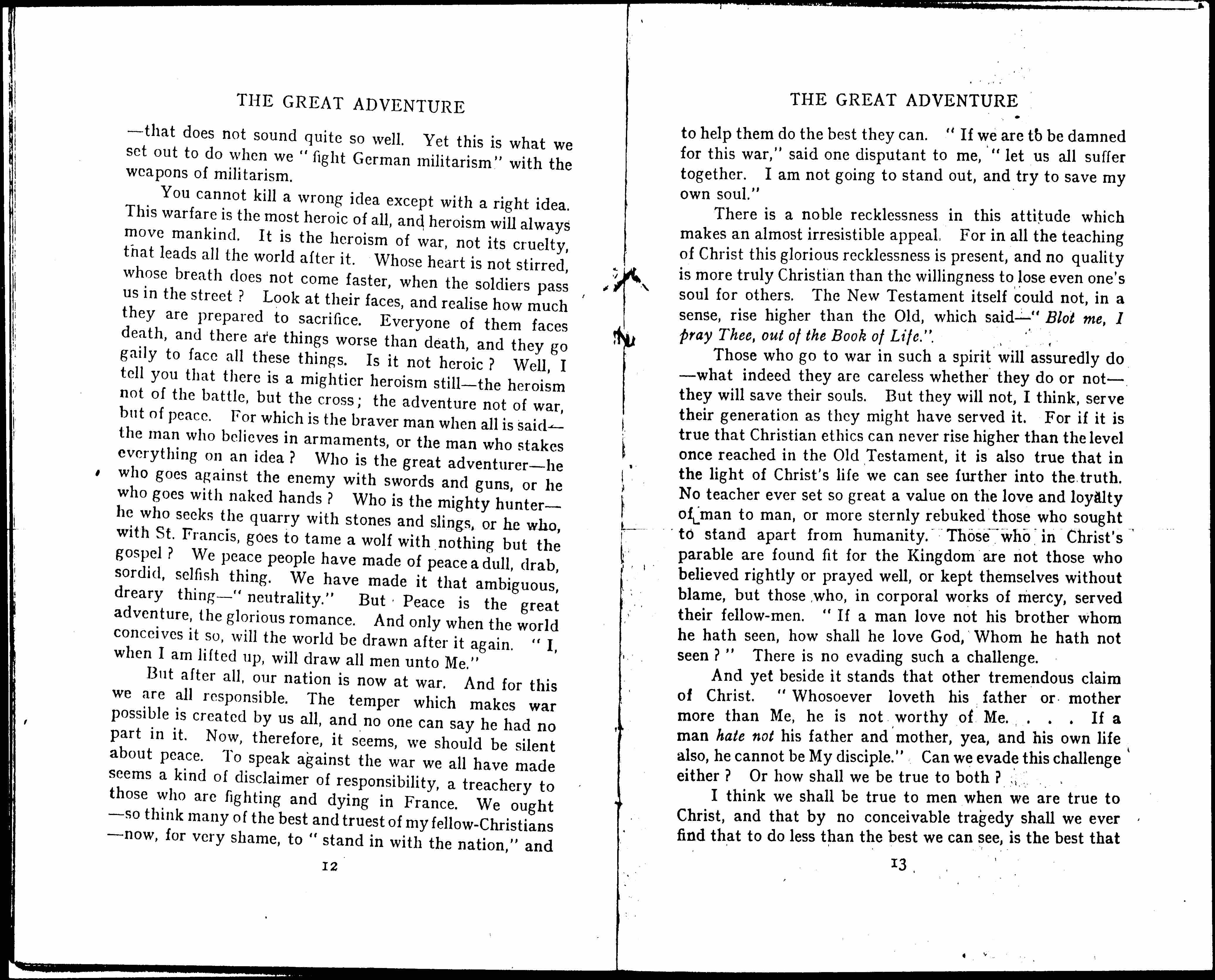 You cannot kill a wrong idea except with a right idea. This warfare is the most heroic of all, and heroism will always move mankind. It is the heroism of war, not its cruelty, that leads all the world after it. Whose heart is not stirred, whose breath does not come faster, when the soldiers pass us in the street? Look at their faces, and [realize] how much they are prepared to sacrifice. [Every one] of them faces death, and there are things worse than death, and they go gaily to face all these things. Is it not heroic? Well, I tell you that there is a mightier heroism still -- the heroism not of the battle, but the cross; the adventure not of war, but of peace. For which is the braver man when all is said -- the man who believes in armaments, or the man who stakes everything on an idea? Who is the great adventurer -- he who goes against the enemy with swords and guns, or he who goes with naked hands? Who is the mighty hunter -- he who seeks the quarry with stones and slings, or he who, with St. Francis, goes to tame a wolf with nothing but the gospel? We peace people have made of peace a dull, drab, sordid, selfish thing. We have made it that ambiguous, dreary thing -- "neutrality." But Peace is the great adventure, the glorious romance. And only when the world conceives it so, will the world be drawn after it again. "I, when I am lifted up, will draw all men unto Me."