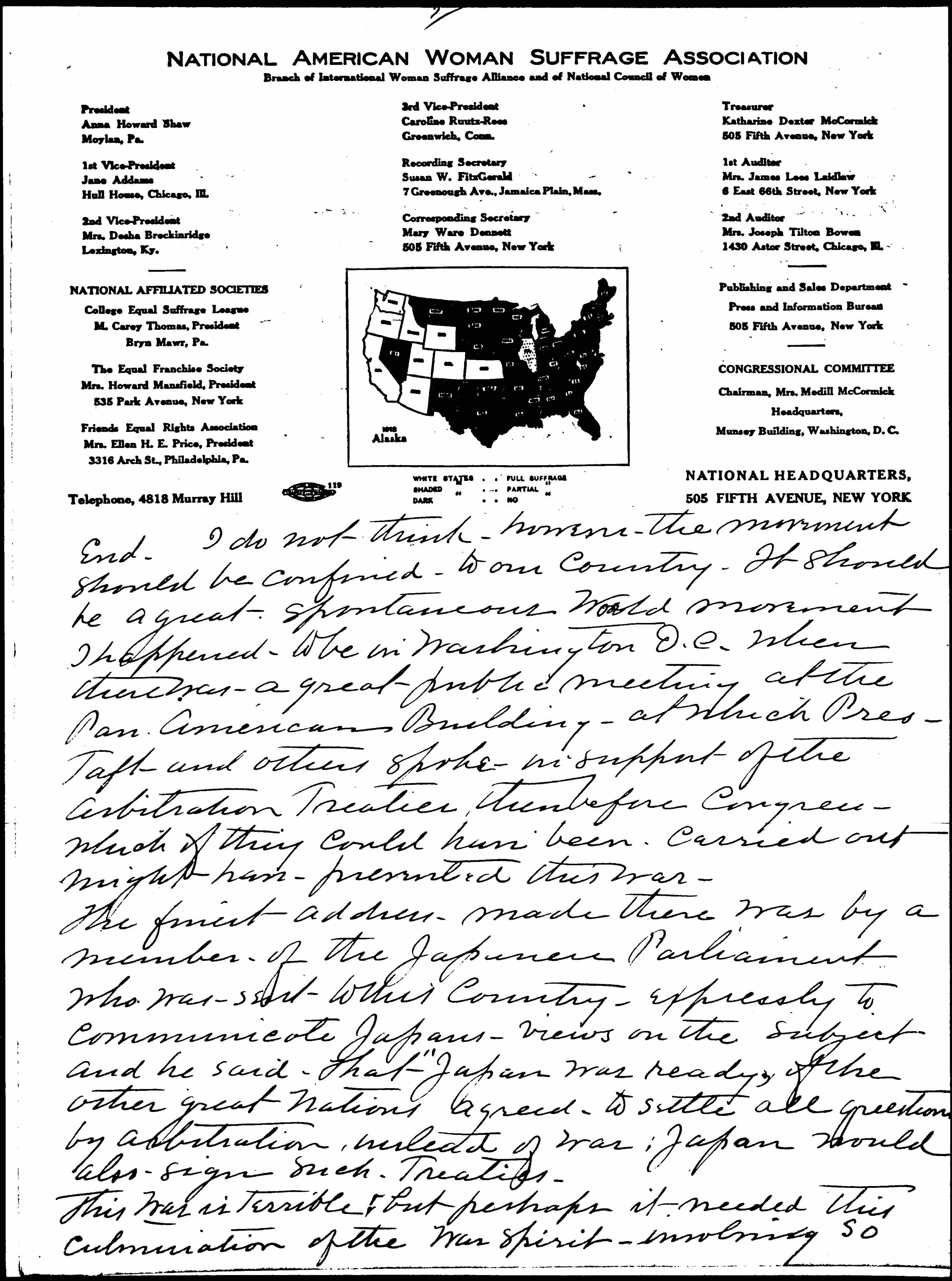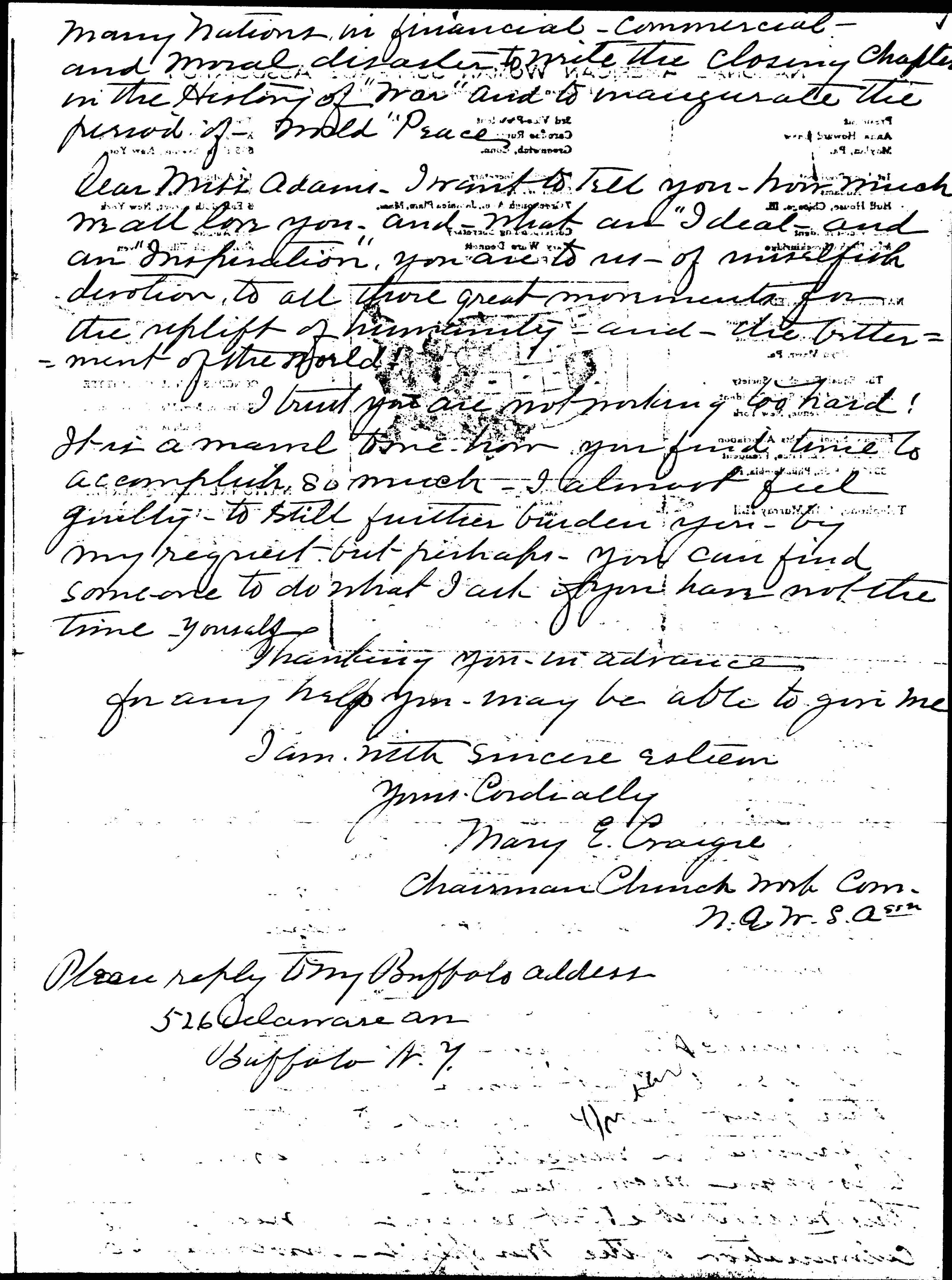 I have been interested in reading of the meetings in the interest of Peace you have been having in Chicago. I belong to the Buffalo Peace Society <and the Am. Peace Soc> and think efforts to procure not only a cessation of war at present but disarmament and an agreement among the nations to settle their difficulties through arbitration is the most important question before the world today. I wish you all success in any new plans or efforts that may be made toward that [page 3] end. I do not think, however, the movement should be confined to our country. It should be a great spontaneous world movement. I happened to be in Washington D.C. when there was a great public meeting at the Pan-American Building at which Pres. Taft and others spoke in support of the arbitration Treaties, then before Congress, which if they could have been carried out might have prevented this war.
