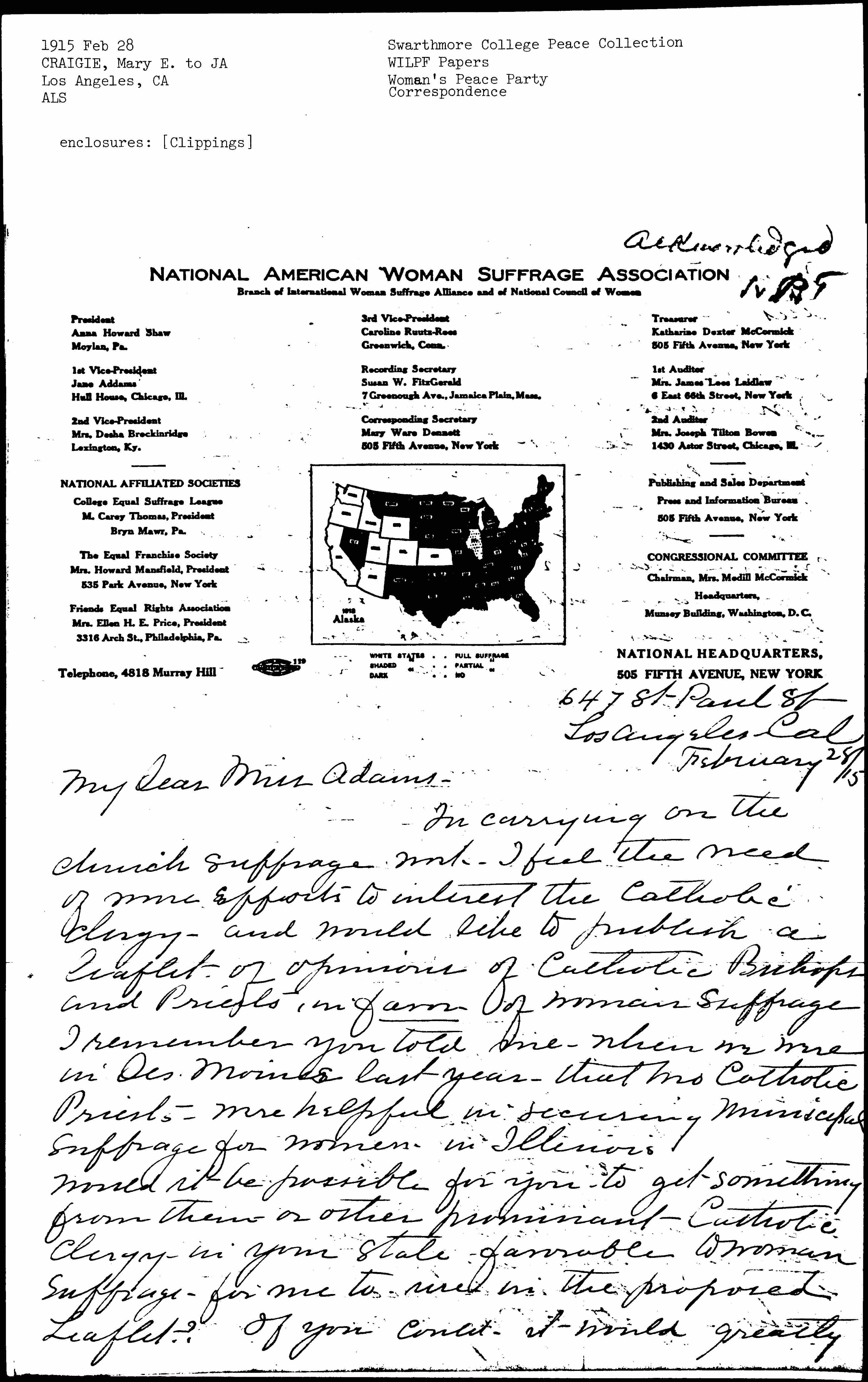 Would it be possible for you to get something from them or other [prominent] Catholic clergy in your state favorable to woman suffrage for me to use in the proposed Leaflet? If you could it would greatly [page 2] help me and I would appreciate it.
