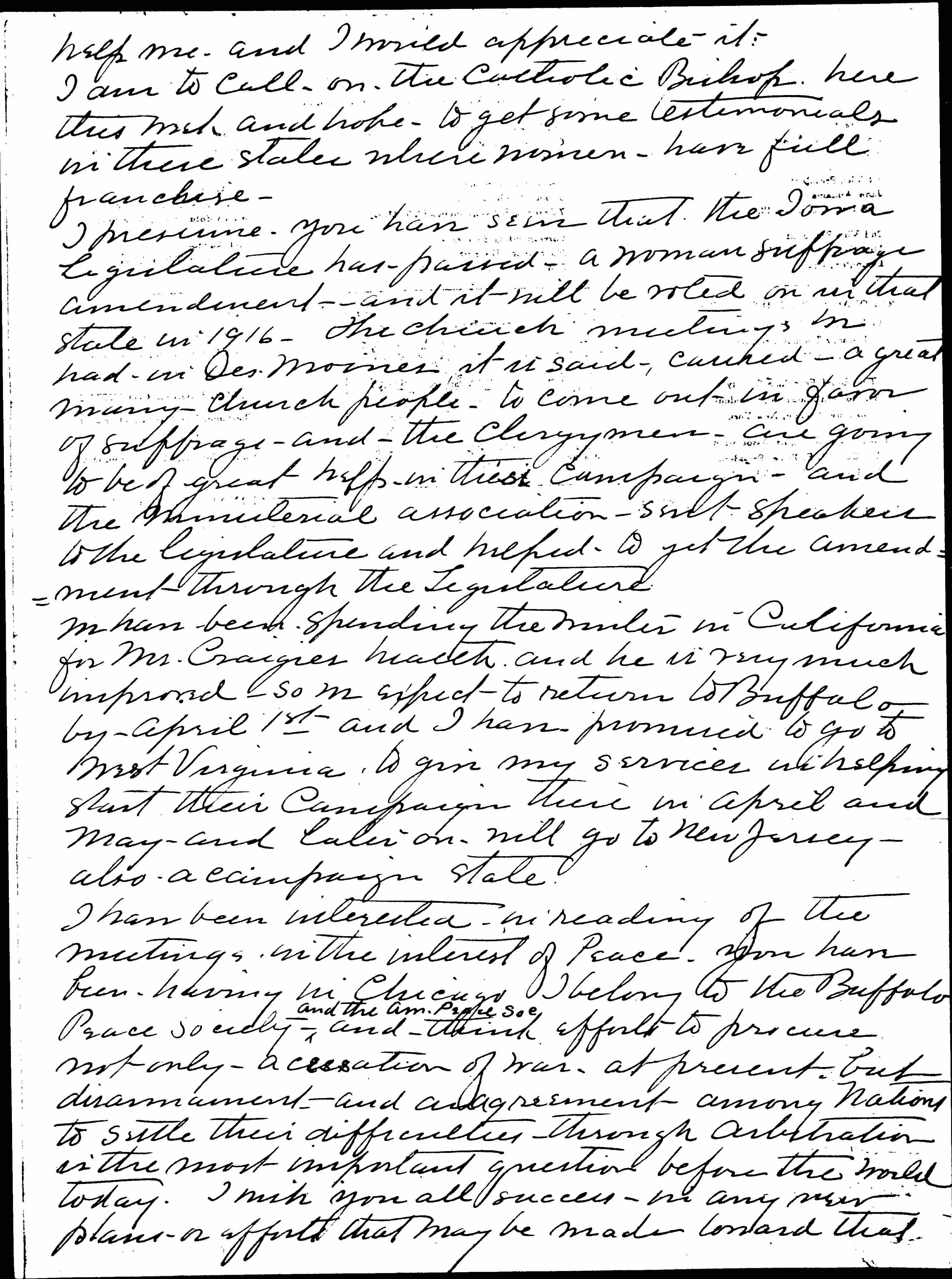 I presume you have seen that the Iowa legislature has passed a woman suffrage amendment and it will be voted on in that state in 1916. The church meetings we had in Des Moines it is said, carried a great many church people to come out in favor of suffrage and the clergymen are going to be of great help in this campaign and the ministerial association sent speakers to the legislature and helped to get the amendment through the Legislature.