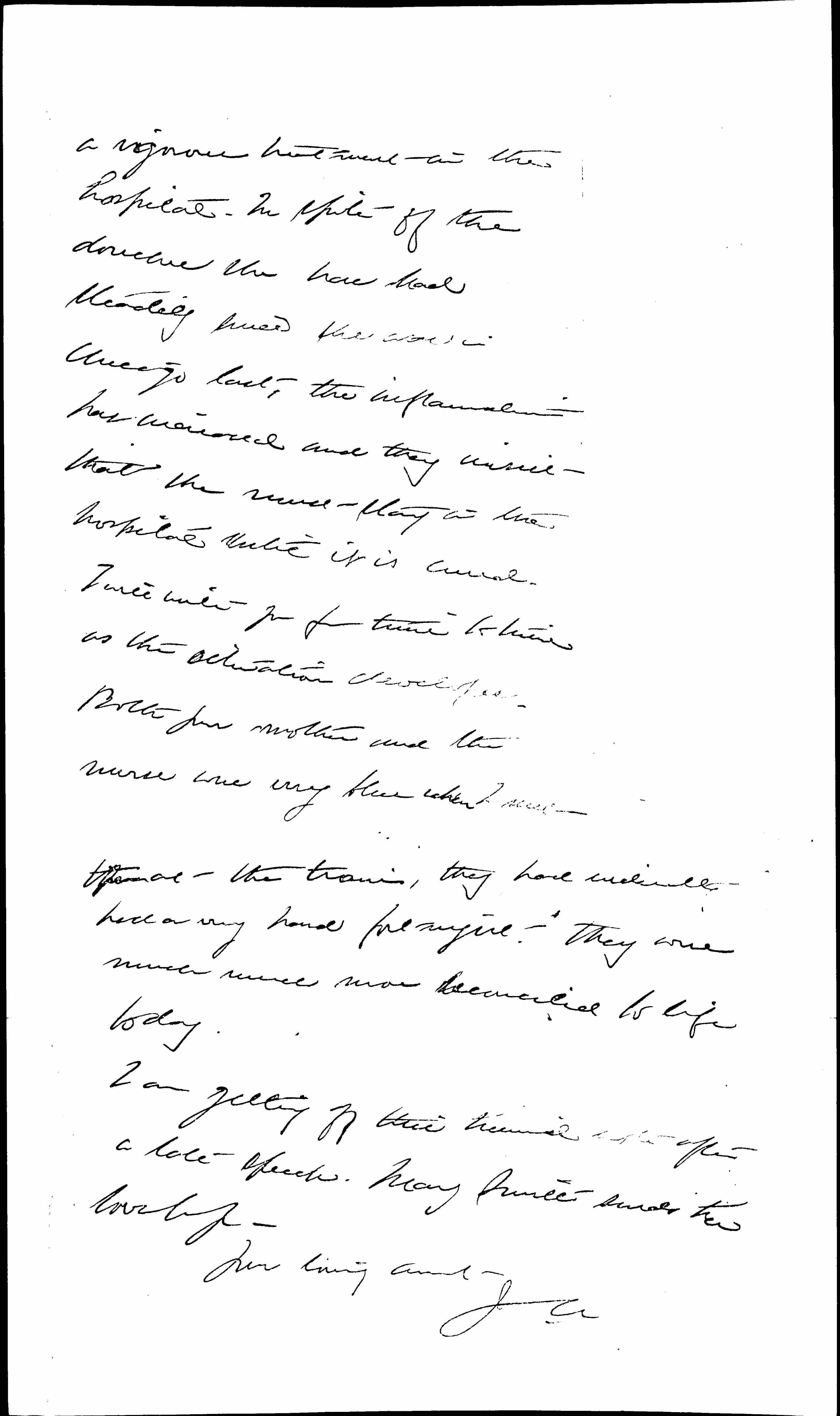 Your mother suffered a good deal from the examination yesterday, but seemed so much better today that I am quite cheered. The doctors insist that there is no new growth, but a great deal of inflammation which they hope to allay by [page 2] a vigorous treatment in the hospital. In spite of the douches she has had steadily since she was in Chicago last, the inflammation has increased and they insist that she must stay in the hospital until it is cured. I will write you from time to time as the situation develops. Both your mother and the nurse were very blue when I met them at the train, they had evidently had a very hard fortnight. They were much much more reconciled to life today.