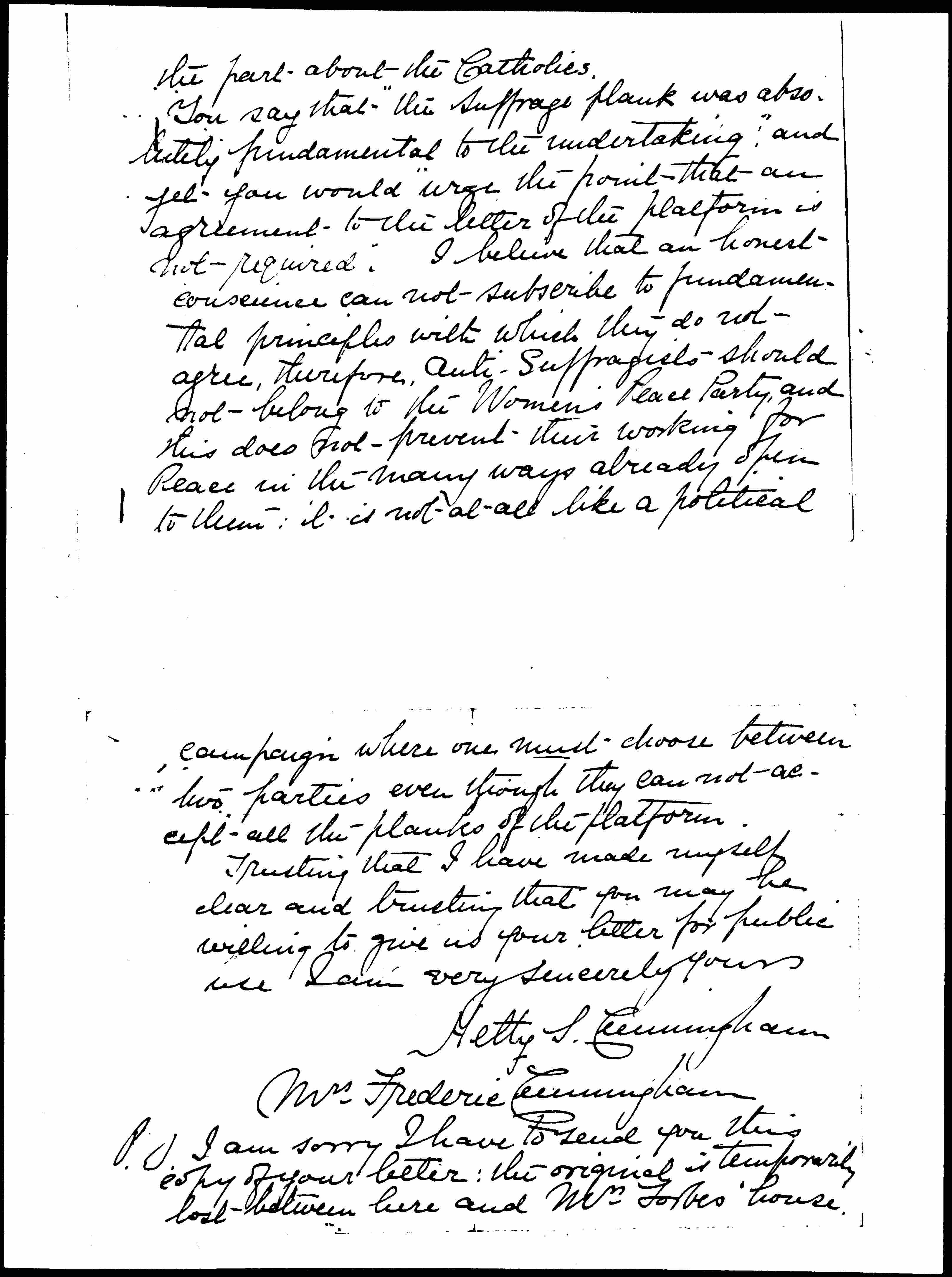 You say that "the Suffrage plank was absolutely fundamental to the undertaking;" and yet you would "urge the point that an agreement to the letter of the platform is not required." I believe that an honest conscience [cannot] subscribe to fundamental principles with which they do not agree, therefore, Anti-Suffragists should not belong to the [Woman's] Peace Party, and this does not prevent their working for Peace in the many ways already open to them: it is not at all like a political [page 4] campaign where one must choose between two parties even though they [cannot] accept all the planks of the platform.