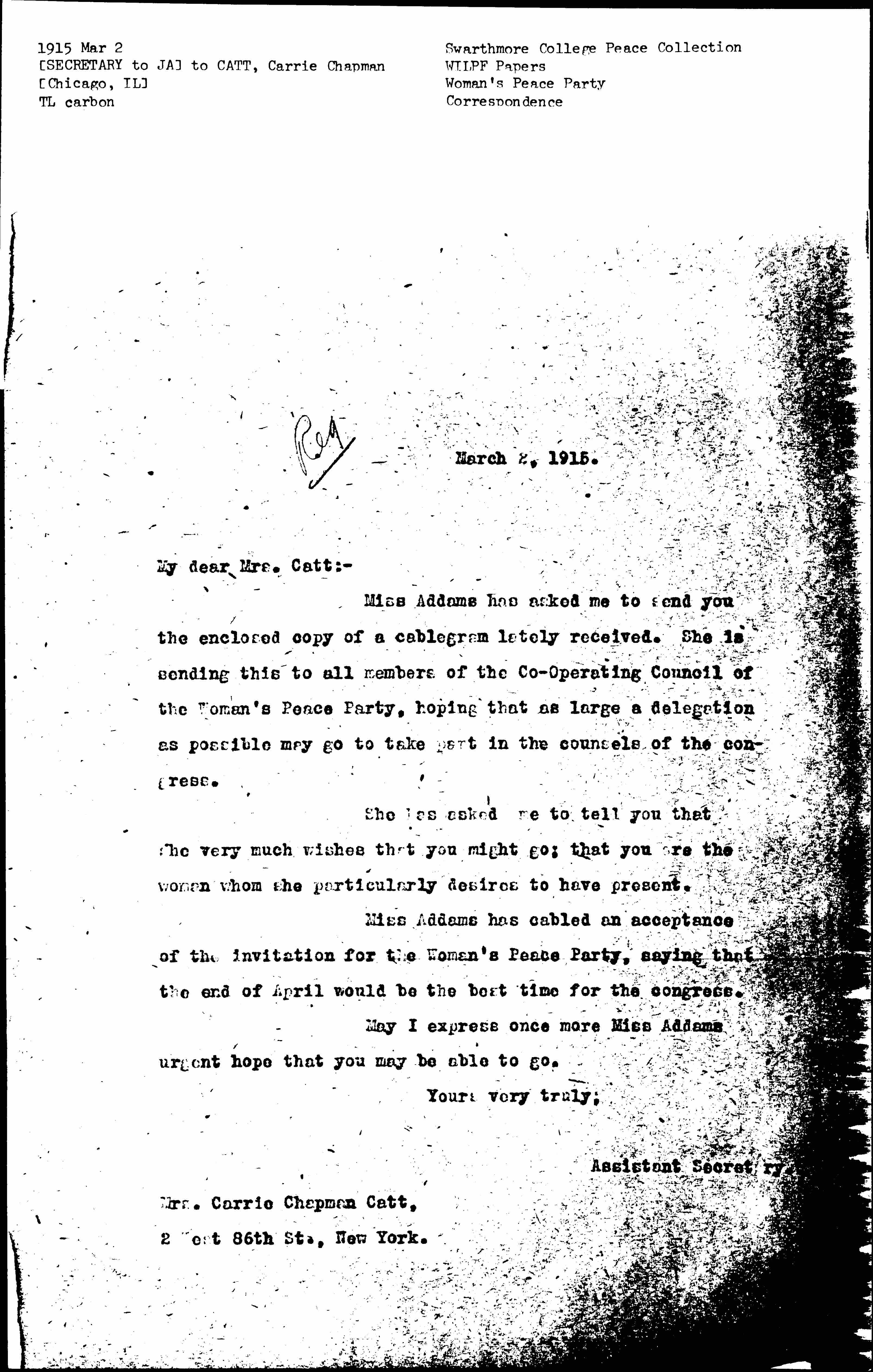 Miss Addams has asked me to send you the enclosed copy of a cablegram lately received. She is sending this to all members of the [Cooperating] Council of the Woman's Peace Party, hoping that as large a delegation as possible may go to take part in the counsels of the congress.