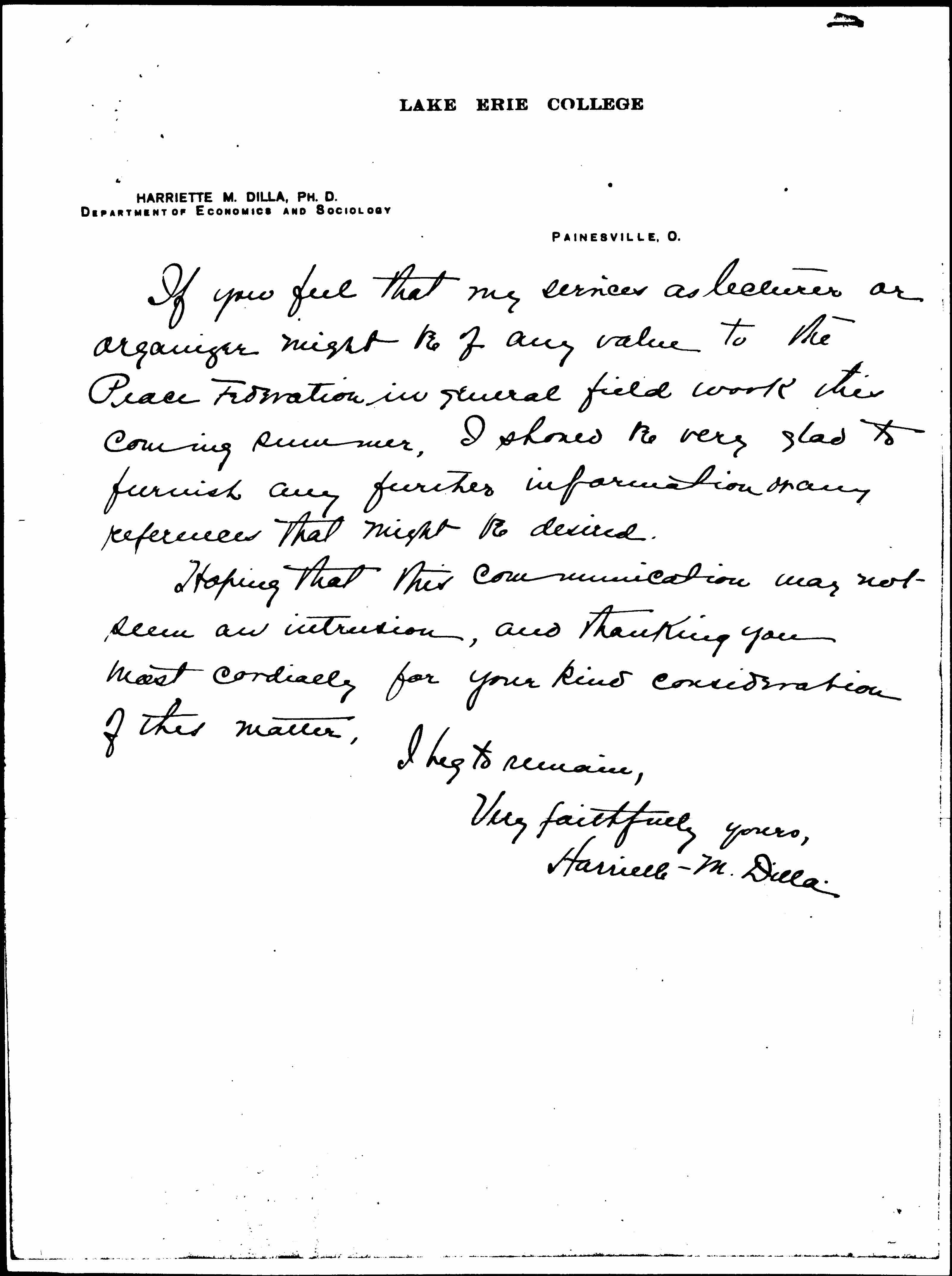 If you feel that my services as lecturer or organizer might be of any value to the Peace Federation in general field work this coming summer, I should be very glad to furnish any further information or any references that might be desired.