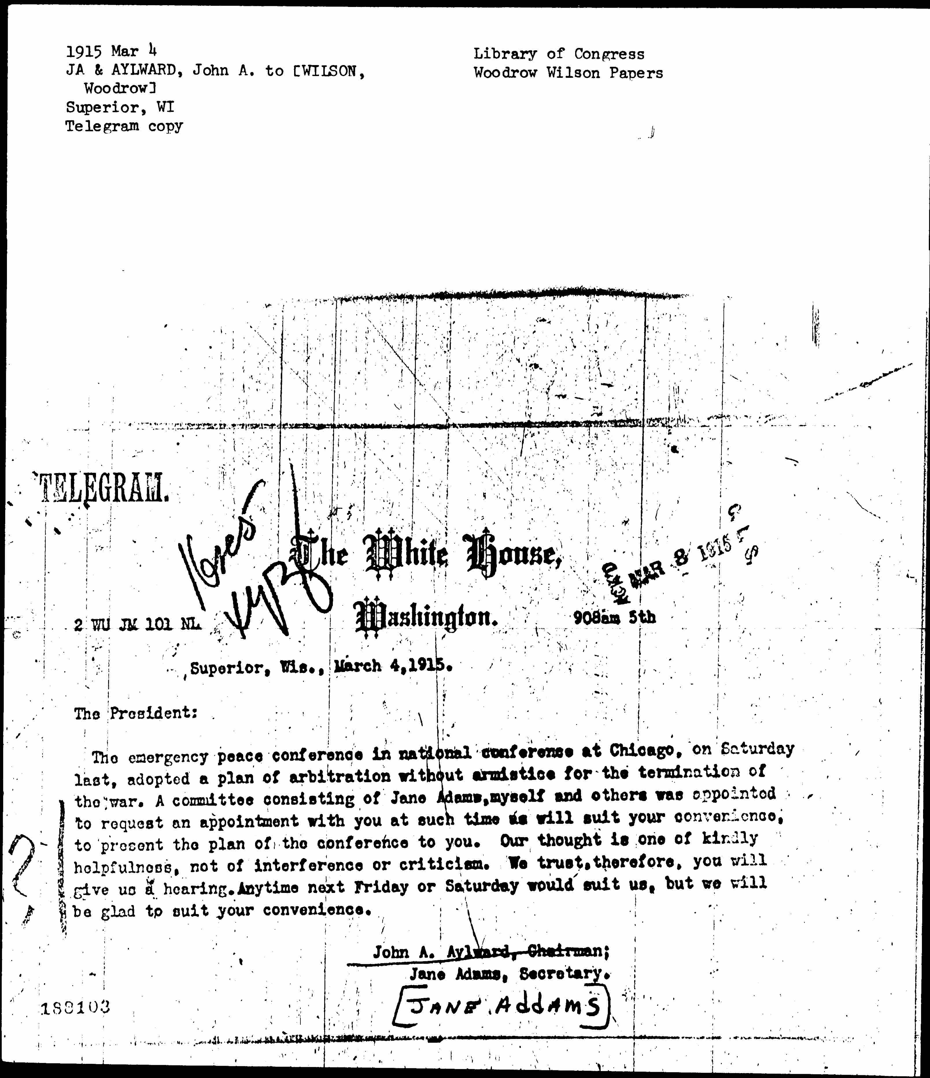 The emergency peace conference in national conference at Chicago, on Saturday last, adopted a plan of arbitration without armistice for the termination of the war. A committee consisting of Jane [Addams], myself and others was appointed to request an appointment with you at such time as will suit your convenience, to present the plan of the conference to you. Our thought is one of kindly helpfulness, not of interference or criticism. We trust, therefore, you will give us a hearing. Anytime next Friday or Saturday would suit us, but we will be glad to suit your convenience.