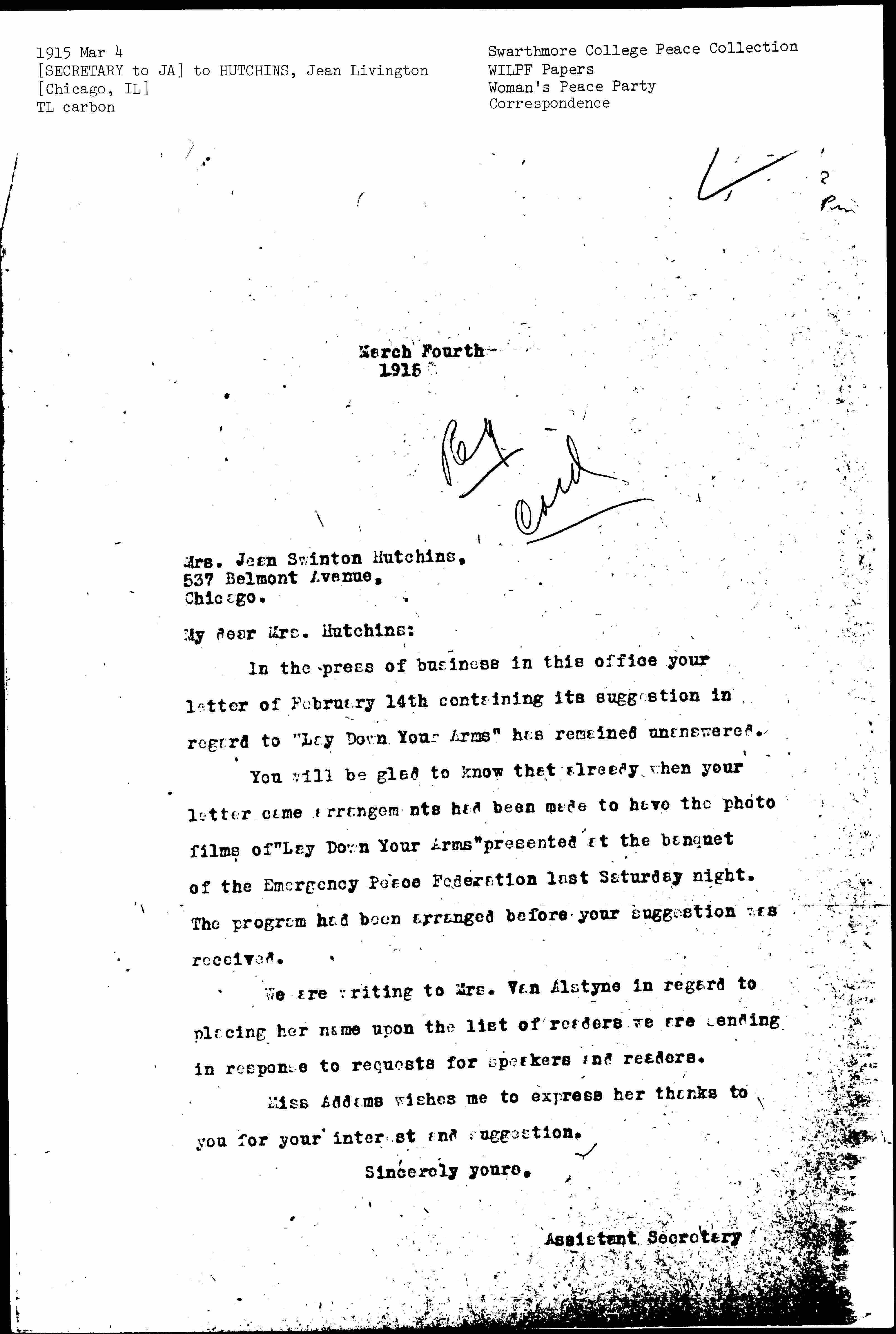 Miss Addams wishes me to express her thanks to you for your interest and suggestion.