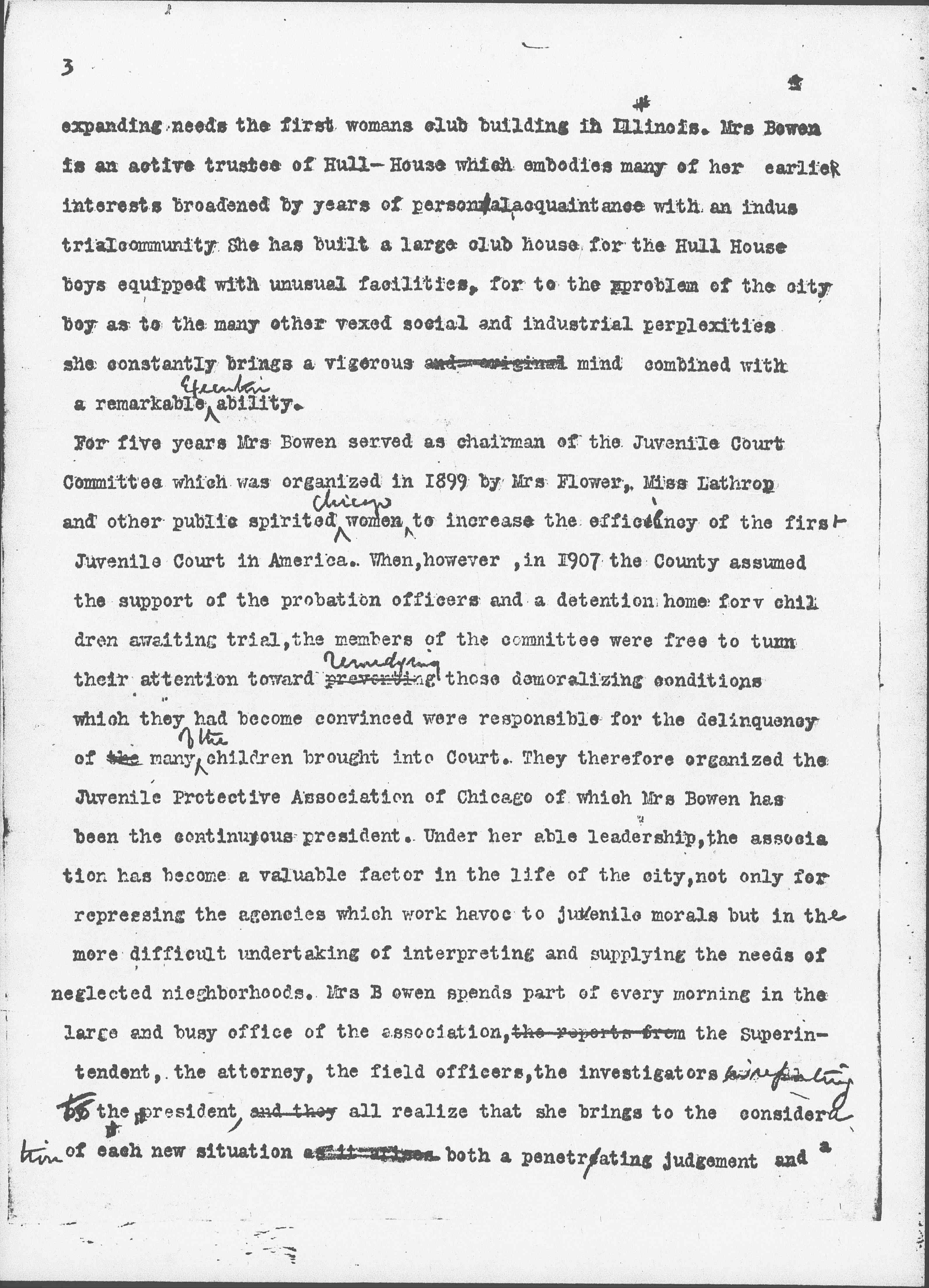 For five years Mrs. Bowen served as chairman of the Juvenile Court Committees which was organized in 1899 by Mrs. Flower, Miss Lathrop and other public spirited <Chicago> women to increase the efficiency of the first Juvenile Court in America. When, however, in 1907 the County assumed the support of the probation officers and a detention home for children awaiting trial, the members of the committee were free to turn their attention toward <remedying> preventing those demoralizing conditions which they had become convinced were responsible for the delinquency of the many <of the> children brought into Court. They therefore organized the Juvenile Protective Association of Chicago of which Mrs. Bowen has been the continuous president. Under her able leadership, the association has become a valuable factor in the life of the city, not only for repressing the agencies which work havoc to juvenile morals but in the more difficult undertaking of interpreting and supplying the needs of neglected neighborhoods. Mrs. Bowen spends part of every morning in the large and busy office of the association, the reports from the Superintendent, the attorney, the field officers, the investigators <[illegible] to> the president, and they all realize that she brings to the consideration of each new situation as it arises both a penetrating judgement and a [page 4] courage which is undaunted by the apathy of city officials or by the indifference of public opinion. Mrs. Bowen is active in the United Charities of Chicago, the Visiting Nurse Association, the Immigrants Protective League and in a dozen other organizations which not only endeavor to practice the charity of today but would as speedily as <possible [illegible] that> tomorrow in which it shall be justice. In fact the keen sense of justice which Mrs. Bowen possesses expresses itself in many ways, quite recently in bringing the management of a huge corporation in which she is a large stockholder, to a fairer treatment of its employees.