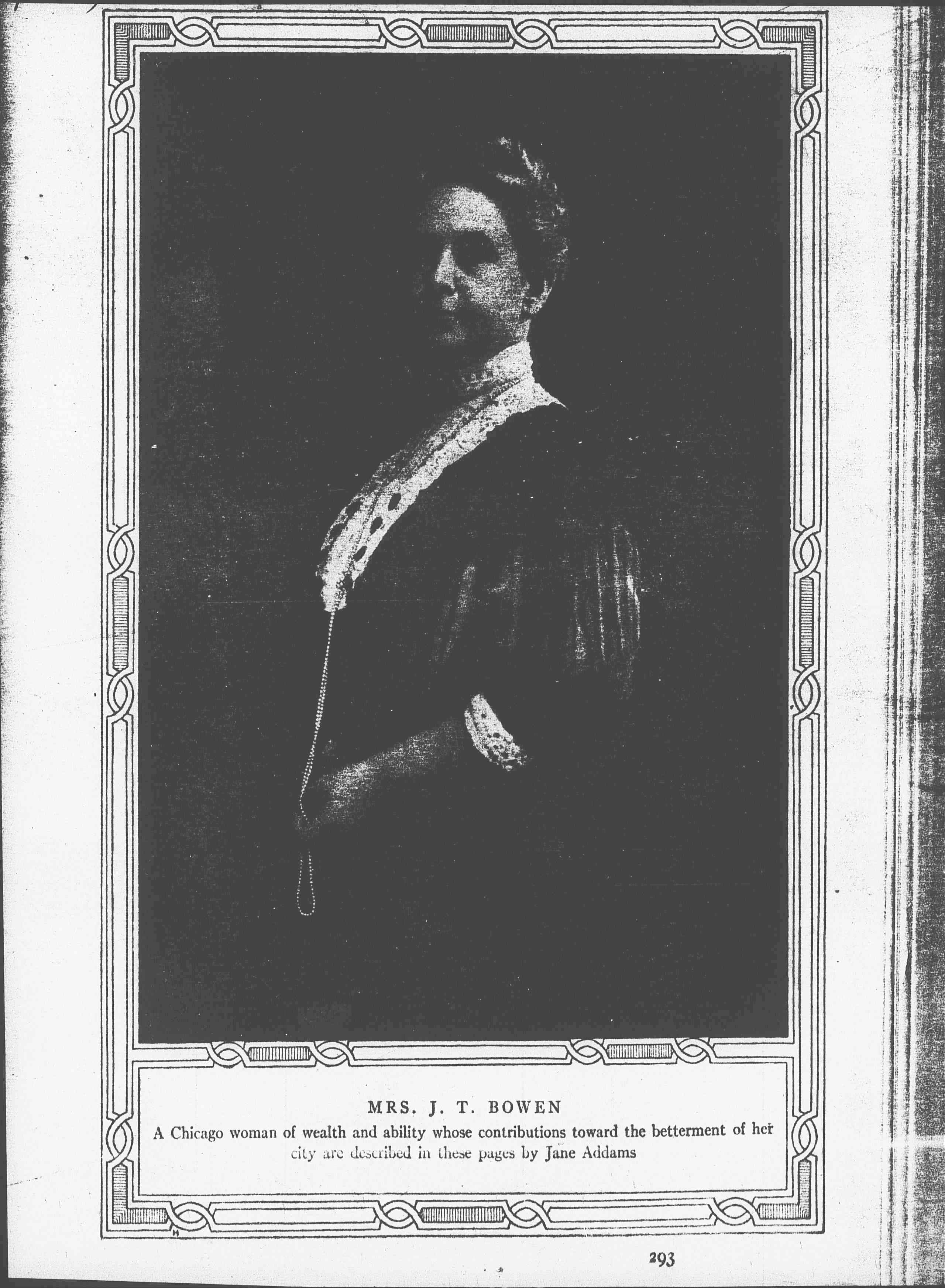 Young Chicago was in fact striving in many ways to be "more fashionable" and Miss de Koven at the age of fifteen assumed her obligation in this direction by appearing in the first high dogcart which the city had ever seen. Both she and the liveried man behind her were at times vigorously stoned as a demonstration of democracy, and on one occasion the groom, exasperated by these missiles and holding democratic principles of his own, jumped down from the cart as it was crossing Rush Street Bridge, flinging his despised coat and high hat into the back of it as he hotly announced, "You can take this livery over town if you want to, but you can't take me." The undaunted young girl drove on without looking back, sustained by the reflection that the incident only made clearer the necessity for metropolitan standards in Chicago. She was not however so totally absorbed in this perilous undertaking but that she expended much youthful energy and humanitarian enthusiasm upon a hundred boys and young men who formed a well remembered Sunday-school class in St. James' church, and when their increasing numbers finally overcrowded the billiard room in her father's house, she established a club house for them and for their friends, defraying its expenses from the goodly allowance given her by her grandfather. This club house, like the dogcart, was the first of its kind in Chicago. For ten years, in spite of much social gayety, she sustained many similar undertakings, until her marriage in 1886 to Mr. Joseph T. Bowen, a promising young business man from Providence, who represented an Eastern firm in Chicago. Even during the years when her four children were young Mrs. Bowen was president of a children's hospital and was closely identified with her husband's activities on the board of St. Luke's and in the Church Club. Her interest in Hull-House began sixteen years ago, when she became a member of its then new woman's club and later erected for its expanding needs the first woman's club building in Illinois. Mrs. Bowen is an active trustee of Hull-House, which embodies many of her earlier interests broadened by years of personal acquaintance with an industrial community. She has built a large club house for the Hull-House boys equipped with unusual facilities, for to the problem of the city boy as to the many other vexed social and industrial perplexities she constantly brings a vigorous mind combined with a remarkable executive ability.