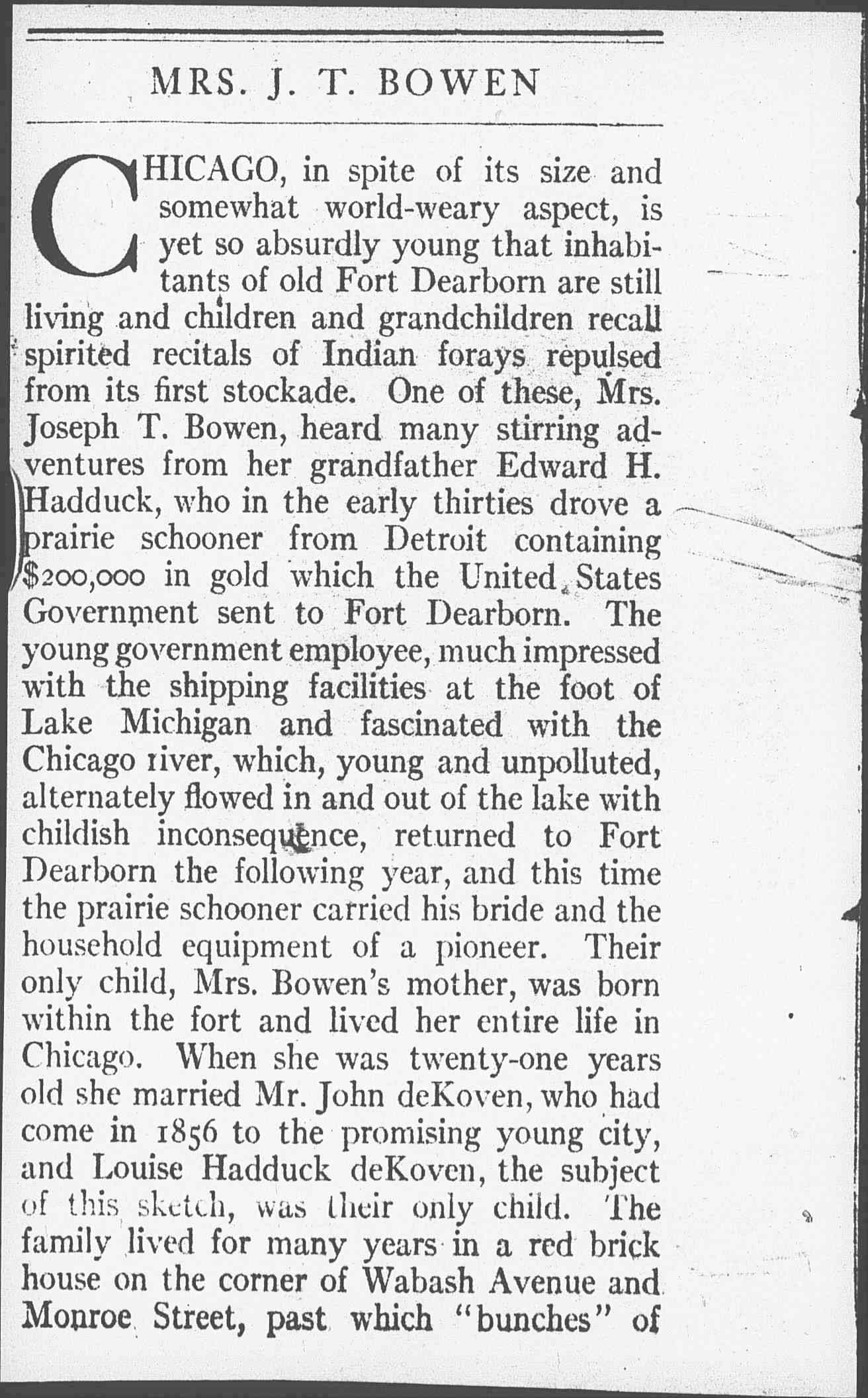 CHICAGO, in spite of its size and somewhat world-weary aspect, is yet so absurdly young that inhabitants of old Fort Dearborn are still living and children and grandchildren recall spirited recitals of Indian forays repulsed from its first stockade. One of these, Mrs. Joseph T. Bowen, heard many stirring adventures from her grandfather Edward H. Hadduck, who in the early thirties drove a prairie schooner from Detroit containing $200,000 in gold which the United States Government sent to Fort Dearborn. The young government employee, much impressed with the shipping facilities at the foot of Lake Michigan and fascinated with the Chicago river, which, young and unpolluted, alternately flowed in and out of the lake with childish inconsequence, returned to Fort Dearborn the following year, and this time the prairie schooner carried his bride and the household equipment of a pioneer. Their only child, Mrs. Bowen's mother, was born within the fort and lived her entire life in Chicago. When she was twenty-one years old she married Mr. John de Koven, who had come in 1856 to the promising young city, and Louise Hadduck de Koven, the subject of this sketch, was their only child. The family lived for many years in a red brick house on the corner of Wabash Avenue and Monroe Street, past which "bunches" of [page 2]