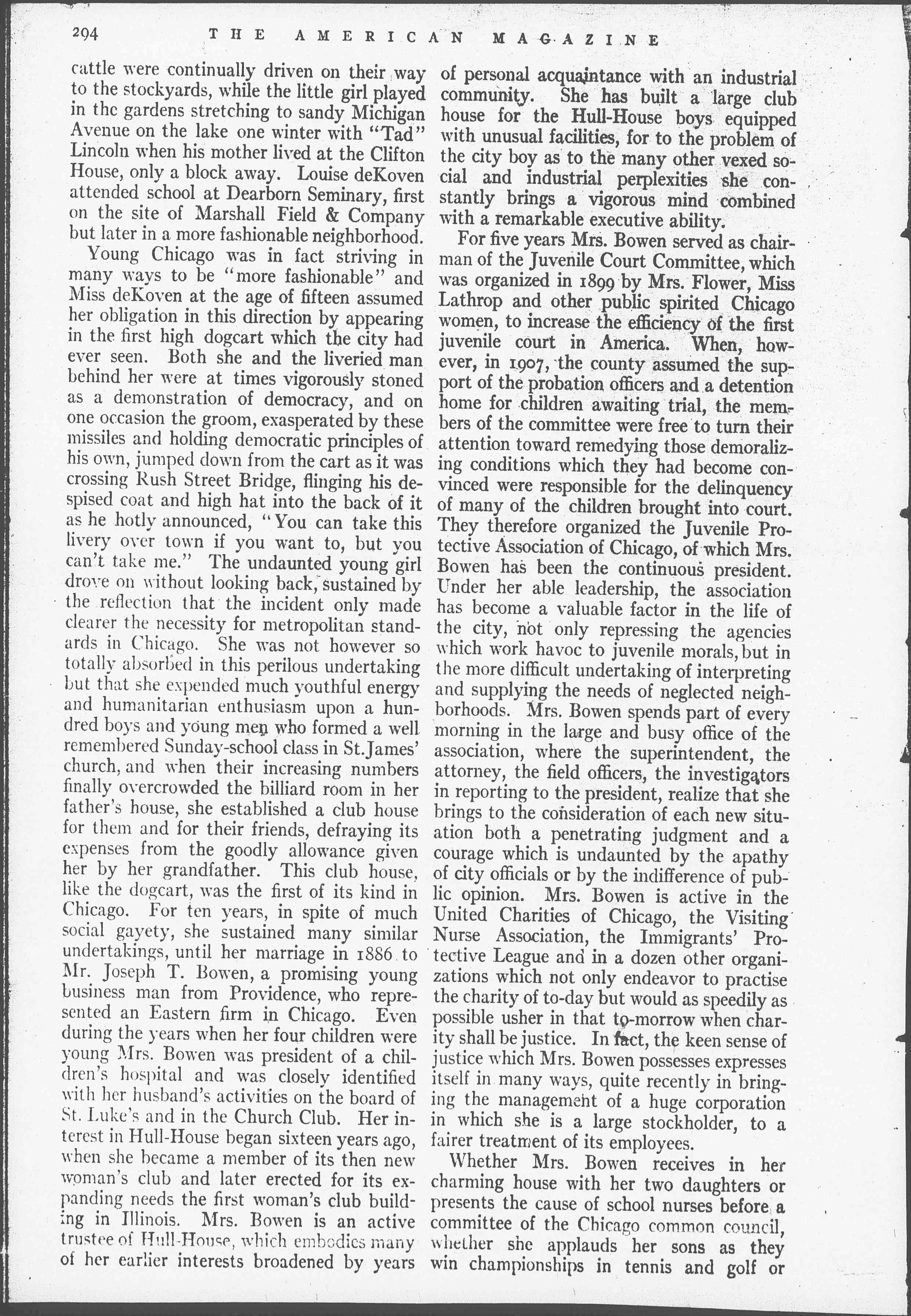 For five years Mrs. Bowen served as chairman of the Juvenile Court Committee, which was organized in 1899 by Mrs. Flower, Miss Lathrop and other public spirited Chicago women, to increase the efficiency of the first juvenile court in America. When, however, in 1907, the county assumed the support of the probation officers and a detention home for children awaiting trial, the members of the committee were free to turn their attention toward remedying those demoralizing conditions which they had become convinced were responsible for the delinquency of many of the children brought into court. They therefore organized the Juvenile Protective Association of Chicago, of which Mrs. Bowen has been the continuous president. Under her able leadership, the association has become a valuable factor in the life of the city, not only repressing the agencies which work havoc to juvenile morals, but in the more difficult undertaking of interpreting and supplying the needs of neglected neighborhoods. Mrs. Bowen spends part of every morning in the large and busy office of the association, where the superintendent, the attorney, the field officers, the investigators in reporting to the president, realize that she brings to the consideration of each new situation both a penetrating judgement and a courage which is undaunted by the apathy of city officials or by the indifference of public opinion. Mrs. Bowen is active in the United Charities of Chicago, the Visiting Nurse Association, the Immigrants' Protective League and in a dozen other organizations which not only endeavor to practice the charity of today but would as speedily as possible usher in that to-morrow when charity shall be justice. In fact, the keen sense of justice which Mrs. Bowen possesses expresses itself in many ways, quite recently in bringing the management of a huge corporation in which she is a large stockholder, to a fairer treatment of its employees.