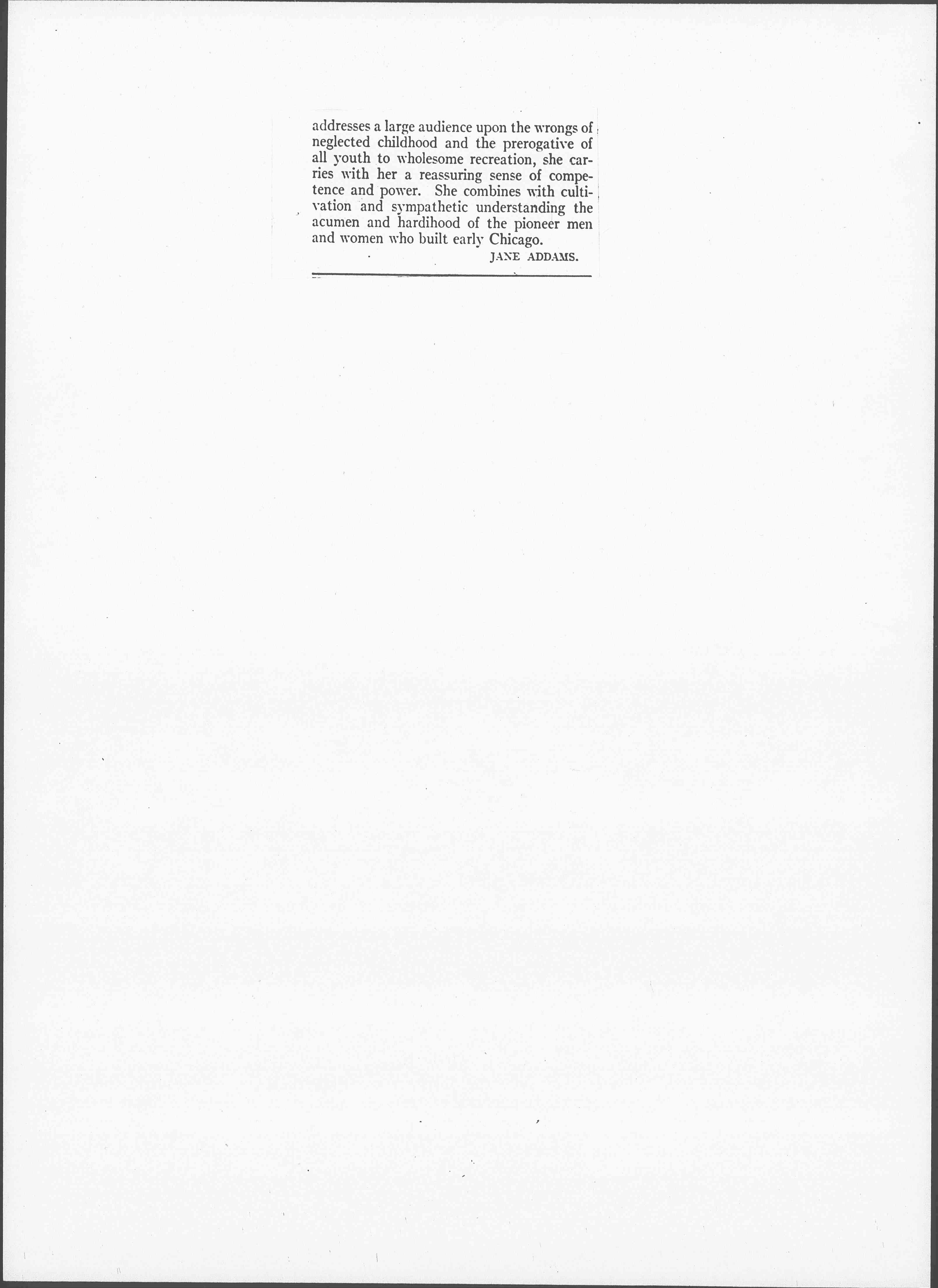 Whether Mrs. Bowen receives in her charming house with her two daughters or presents the cause of school nurses before a committee of the Chicago common council, whether she applauds her sons as they win championships in tennis and golf or [page 4] addresses a large audience upon the wrongs of neglected childhood and the prerogative of all youth to wholesome recreation, she carries with her a reassuring sense of competence and power. She combines with cultivation and sympathetic understanding the acumen and hardihood of the pioneer men and women who built early Chicago.