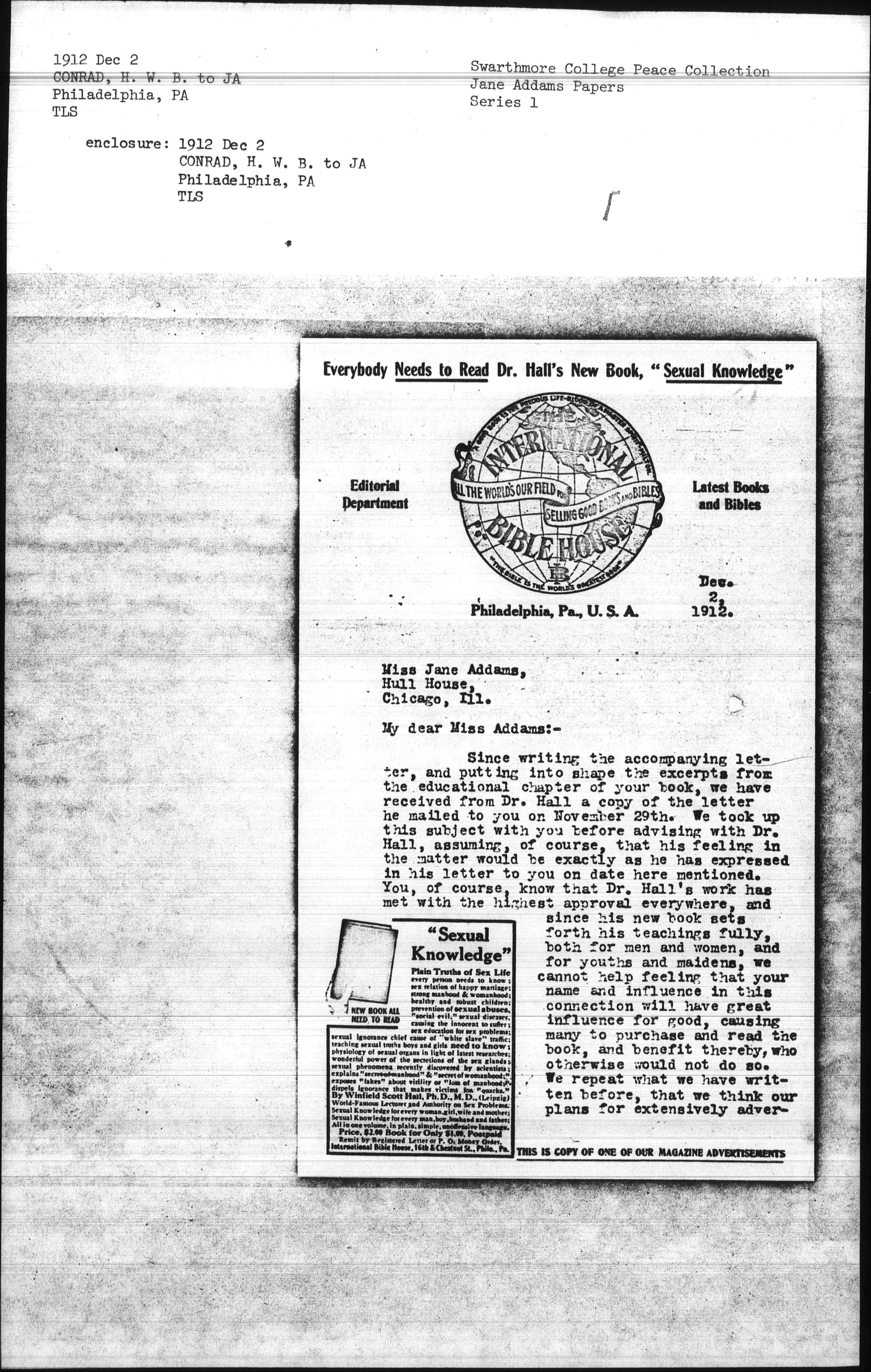 Since writing the accompanying letter, and putting into shape the excerpts from the educational chapter of your book, we have received from Dr. Hall a copy of the letter he mailed to you on November 29th. We took up this subject with you before advising with Dr. Hall, assuming, of course, that his feeling in the matter would be exactly as he has expressed in his letter to you on date here mentioned. You, of course, know that Dr. Hall's work has met with the highest approval everywhere, and since his new book sets forth his teachings fully, both for men and maidens, we cannot help feeling that your name and influence in this connection will have great influence for good, causing many to purchase and read the book, and benefit thereby, who otherwise would not do so. We repeat what we have written before, that we think our plans for extensively [page 2] advertising and selling Dr. Hall's book mean to you an unusual opportunity for a message from your pen in this connection that will reach thousands upon thousands who will never otherwise have opportunity to read your message on this subject.