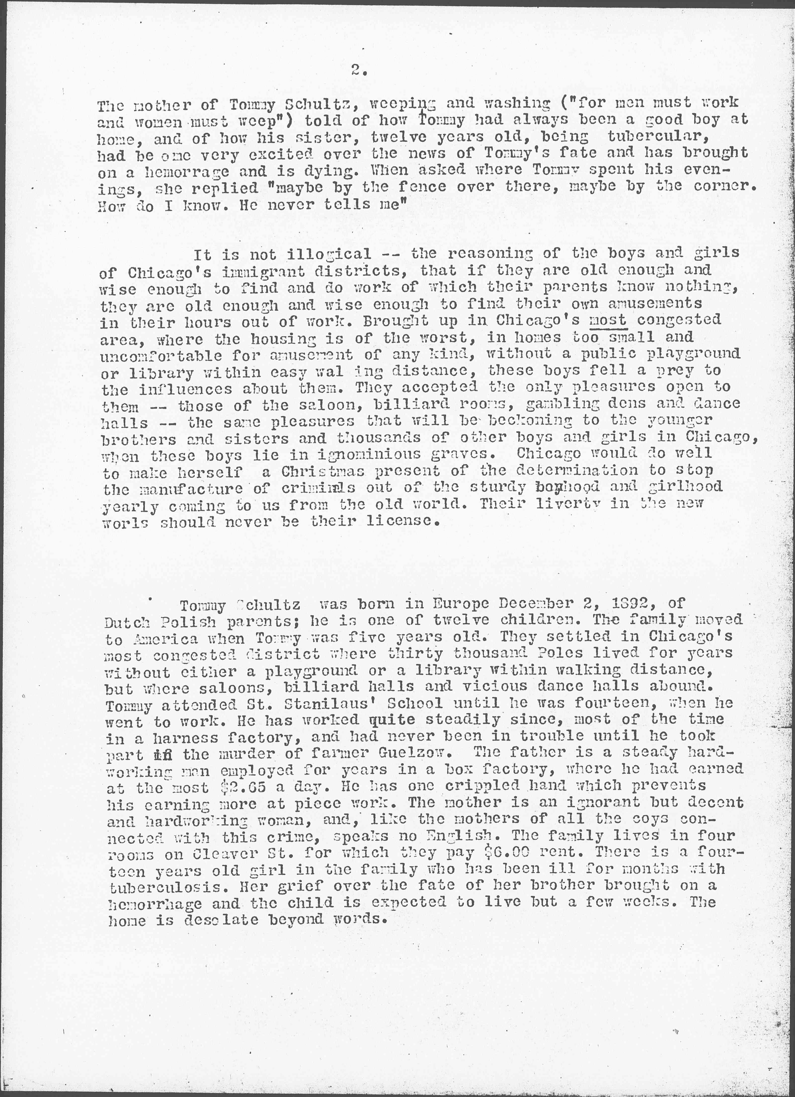 Tommy Schultz was born in Europe December 2, 1892, of Dutch Polish parents; he is one of twelve children. The family moved to America when Tommy was five years old. They settled in Chicago's most congested district where thirty thousand Poles lived for years without either a playground or a library within walking distance, but where saloons, billiard halls and vicious dance halls abound. Tommy attended St. Stanislaus' School until he was fourteen, when he went to work. He has worked quite steadily since, most of the time in a harness factory, and had never been in trouble until he took part in the murder of farmer Guelzow. The father is a steady hardworking man employed for years in a box factory, where he had earned at the most $2.65 a day. He has one crippled hand which prevents his earning more at piece work. The mother is an ignorant but decent and hardworking woman, and, like the mothers of all the [boys?] connected with this crime, speaks no English. The family lives in four rooms on Cleaver St. for which they pay $6.00 rent. There is a fourteen years old girl in the family who has been ill for months with tuberculosis. Her grief over the fate of her brother brought on a hemorrhage and the child is expected to live but a few weeks. The home is desolate beyond words.