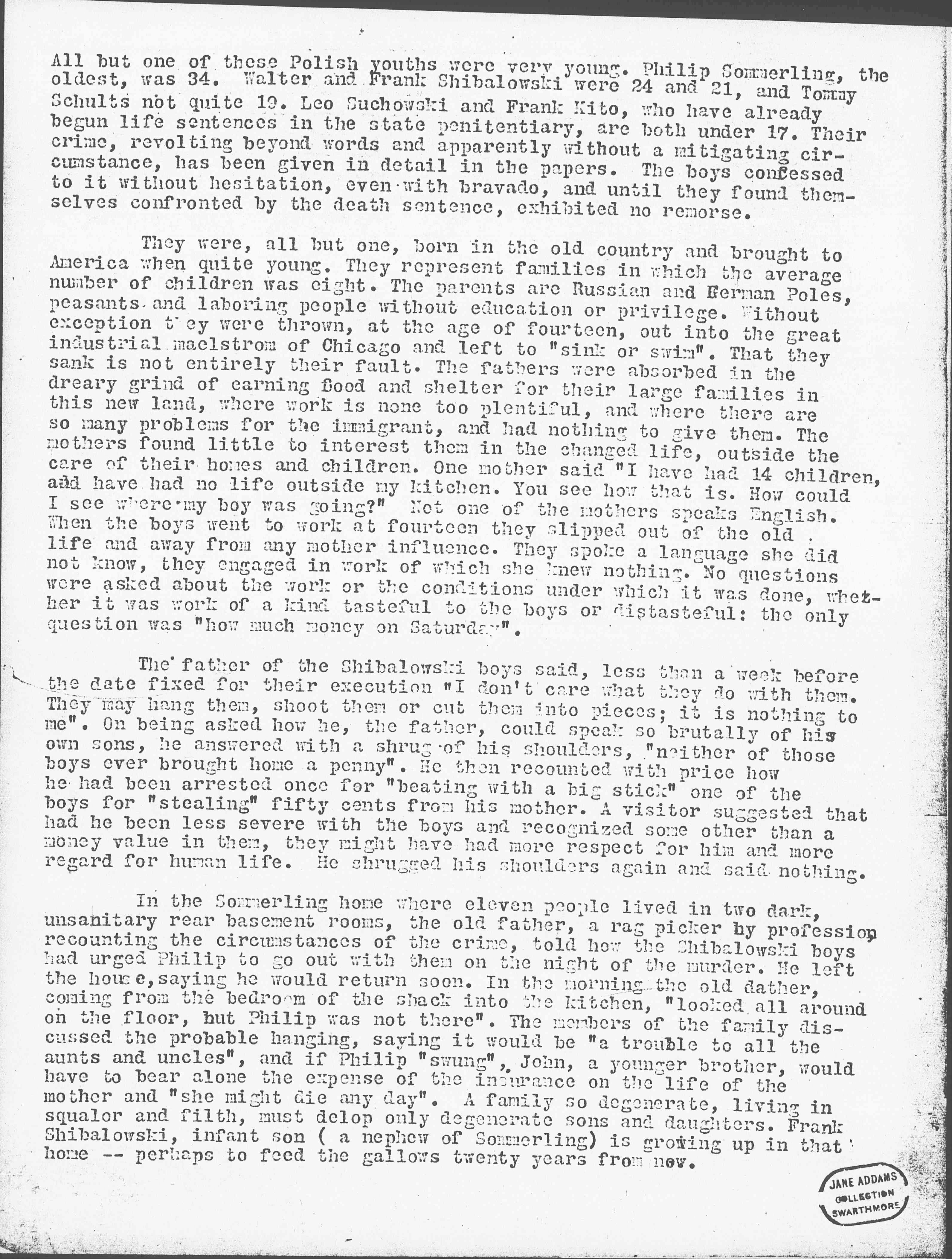 In the Sommerling home where eleven people lived in two dark, unsanitary rear basement rooms, the old father, a rag picker by profession recounting the circumstances of the crime, told how the Shibalowski boys had urged Philip to go out with them on the night of the murder. He left the house, saying he would return soon. In the morning the old [father], coming from the bedroom of the shack into the kitchen, "looked all around on the floor, but Philip was not there." The members of the family discussed the probable hanging, saying it would be "a trouble to all the aunts and uncles," and if Philip "swung," John, a younger brother, would have to bear alone the expense of the insurance on the life of the mother and "she might die any day." A family so degenerate, living in squalor and filth, must [develop?] only degenerate sons and daughters. Frank Shibalowski, infant son (a nephew of Sommerling) is growing up in that home -- perhaps to feed the gallows twenty years from now. [page 2]