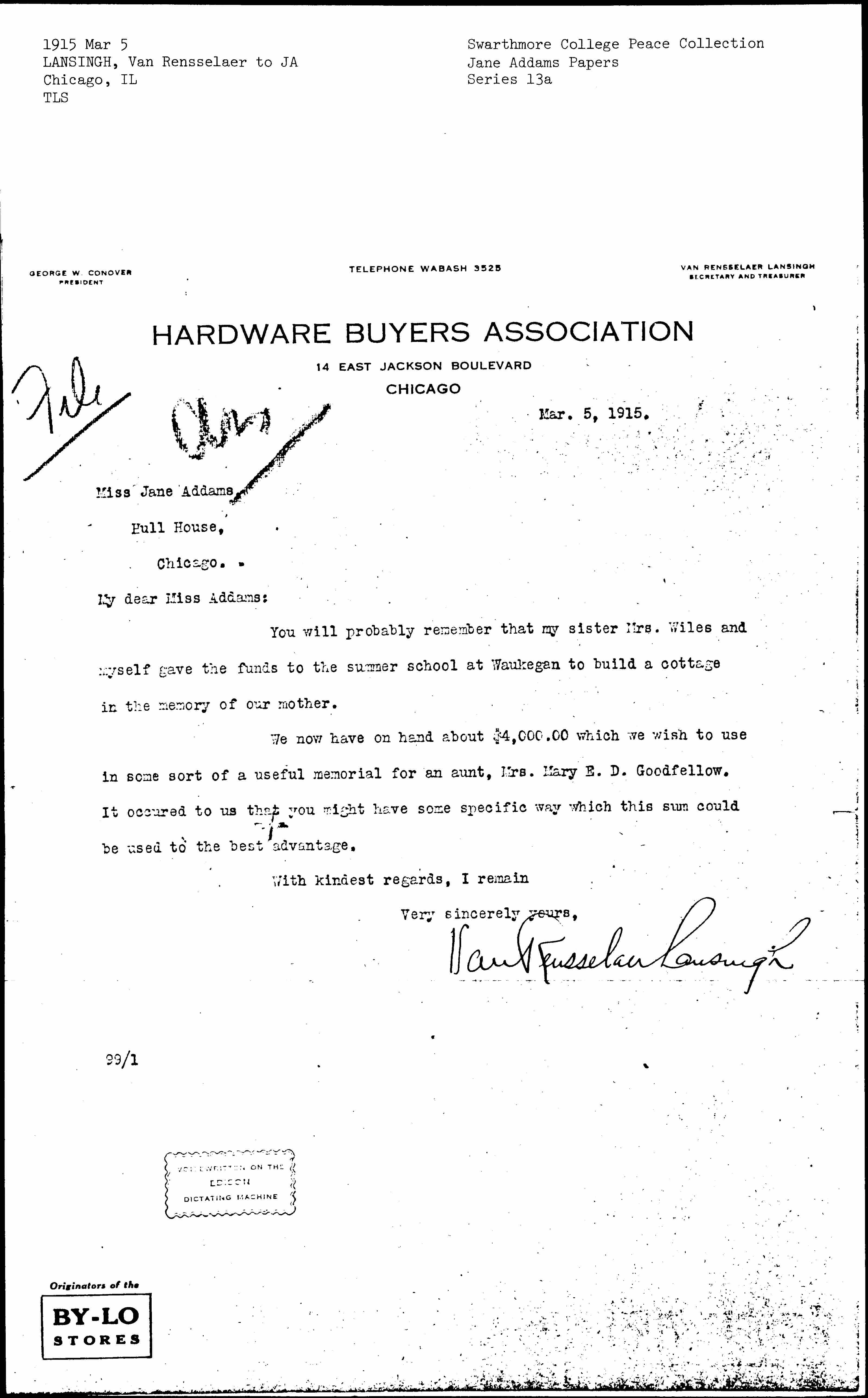 You will probably remember that my sister Mrs. Wiles and myself gave the funds to the summer school at Waukegan to build a cottage in the memory of our mother.