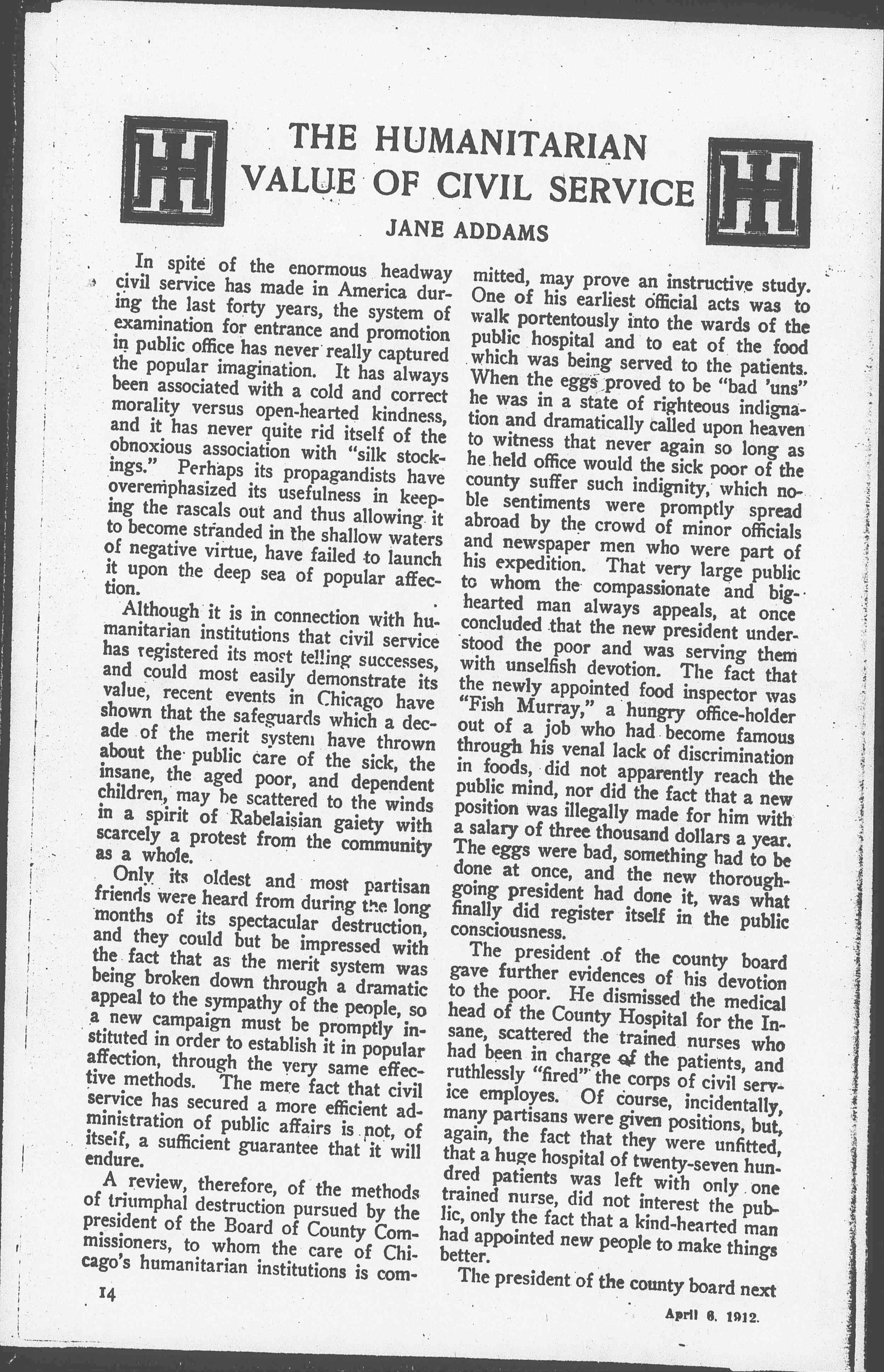 Although it is in connection with humanitarian institutions that civil service has registered its most telling successes, and could most easily demonstrate its value, recent events in Chicago have shown that the safeguards which a decade of the merit system have thrown about the public care of the sick, the insane, the aged poor, and dependent children, may be scattered to the winds in a spirit of Rabelaisian gaiety with scarcely a protest from the community as a whole.