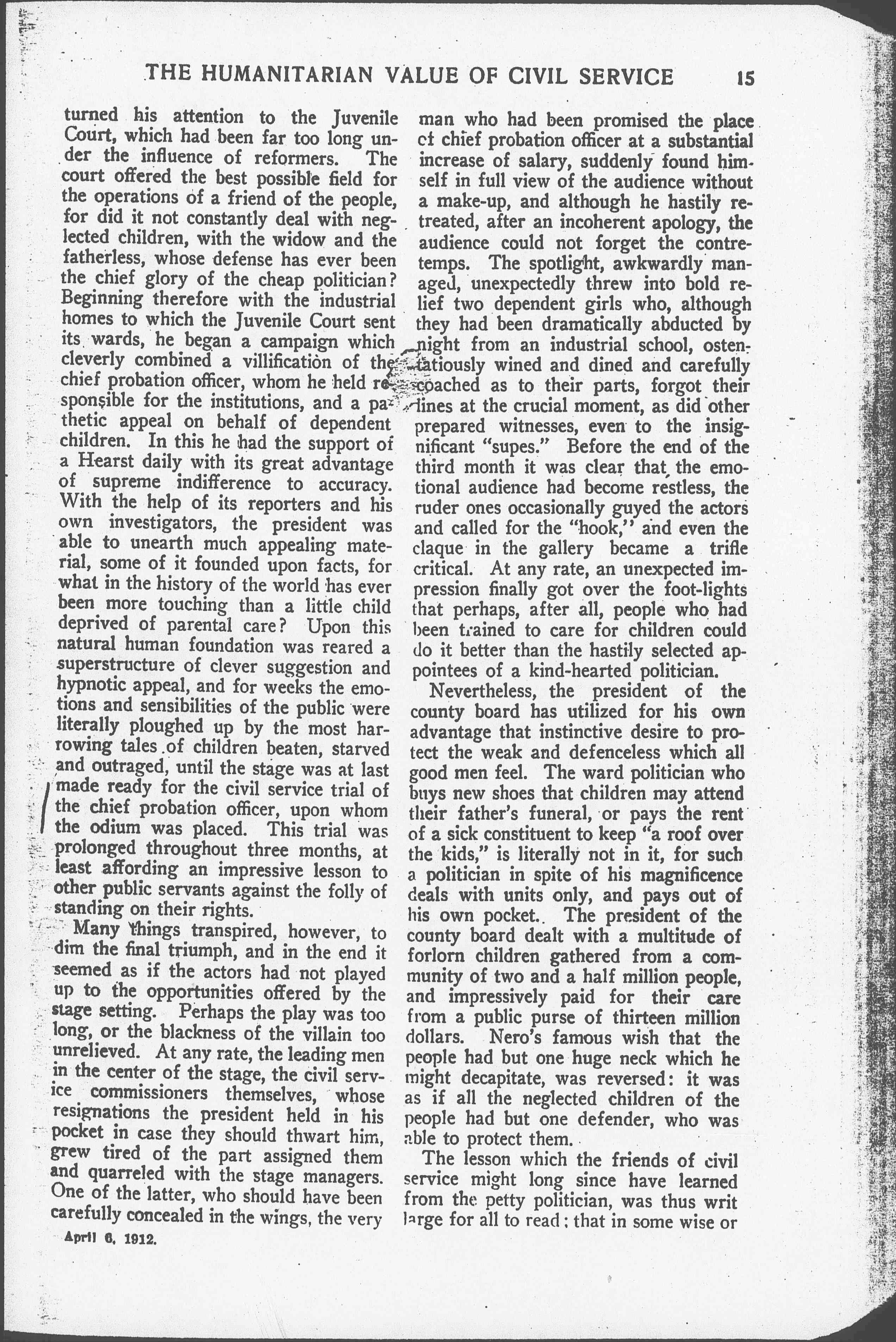 The president of the county board next [page 2] turned his attention to the Juvenile Court, which had been far too long under the influence of reformers. The court offered the best possible field for the operations of a friend of the people, for did it not constantly deal with neglected children, with the widow and the fatherless, whose defense has ever been the chief glory of the cheap politician? Beginning therefore with the industrial homes to which the Juvenile Court sent its wards, he began a campaign which cleverly combined a [vilification] of the chief probation officer, whom he held responsible for the institutions, and a pathetic appeal on behalf of dependent children. In this he had the support of a Hearst daily with its great advantage of supreme indifference to accuracy. With the help of its reporters and his own investigators, the president was able to unearth much appealing material, some of it founded upon facts, for what in the history of the world has ever been more touching than a little child deprived of parental care? Upon this natural human foundation was reared a superstructure of clever suggestion and hypnotic appeal, and for weeks the emotions and sensibilities of the public were literally ploughed up by the most harrowing tales of children beaten, starved and outraged, until the stage was at last made ready for the civil service trial of the chief probation officer, upon whom the odium was placed. This trial was prolonged throughout three months, at least affording an impressive lesson to other public servants against the folly of standing on their rights.