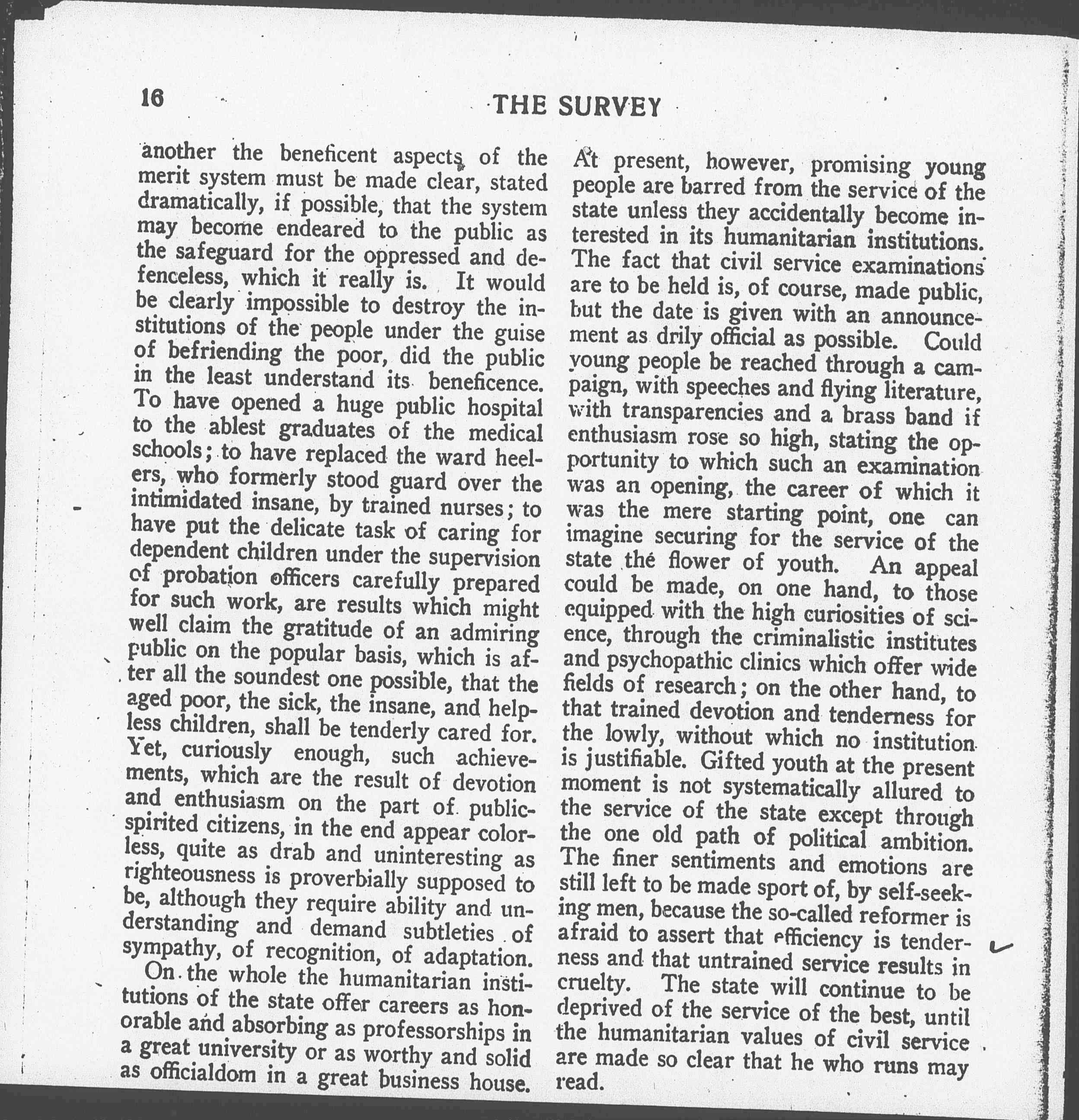 At present, however, promising young people are barred from the service of the state unless they accidentally become interested in its humanitarian institutions. The fact that civil service examinations are to be held is, of course, made public, but the date is given with an announcement as drily official as possible. Could young people be reached through a campaign, with speeches and flying literature, with transparencies and a brass band if enthusiasm rose so high, stating the opportunity to which such an examination was an opening, the career of which it was the mere starting point, one can imagine securing for the service of the state the flower of youth. An appeal could be made, on one hand, to those equipped with the high curiosities of science, through the criminalistic institutes and psychopathic clinics which offer wide fields of research; on the other hand, to that trained devotion and tenderness for the lowly, without which no institution is justifiable. Gifted youth at the present moment is not systematically allured to the service of the state except through the one old path of political ambition. The finer sentiments and emotions are still left to be made sport of, by self-seeking men, because the so-called reformer is afraid to assert that efficiency is tenderness and that untrained service results in cruelty. The state will continue to be deprived of the service of the best, until the humanitarian values of civil service are made so clear that he who runs may read.