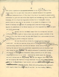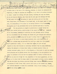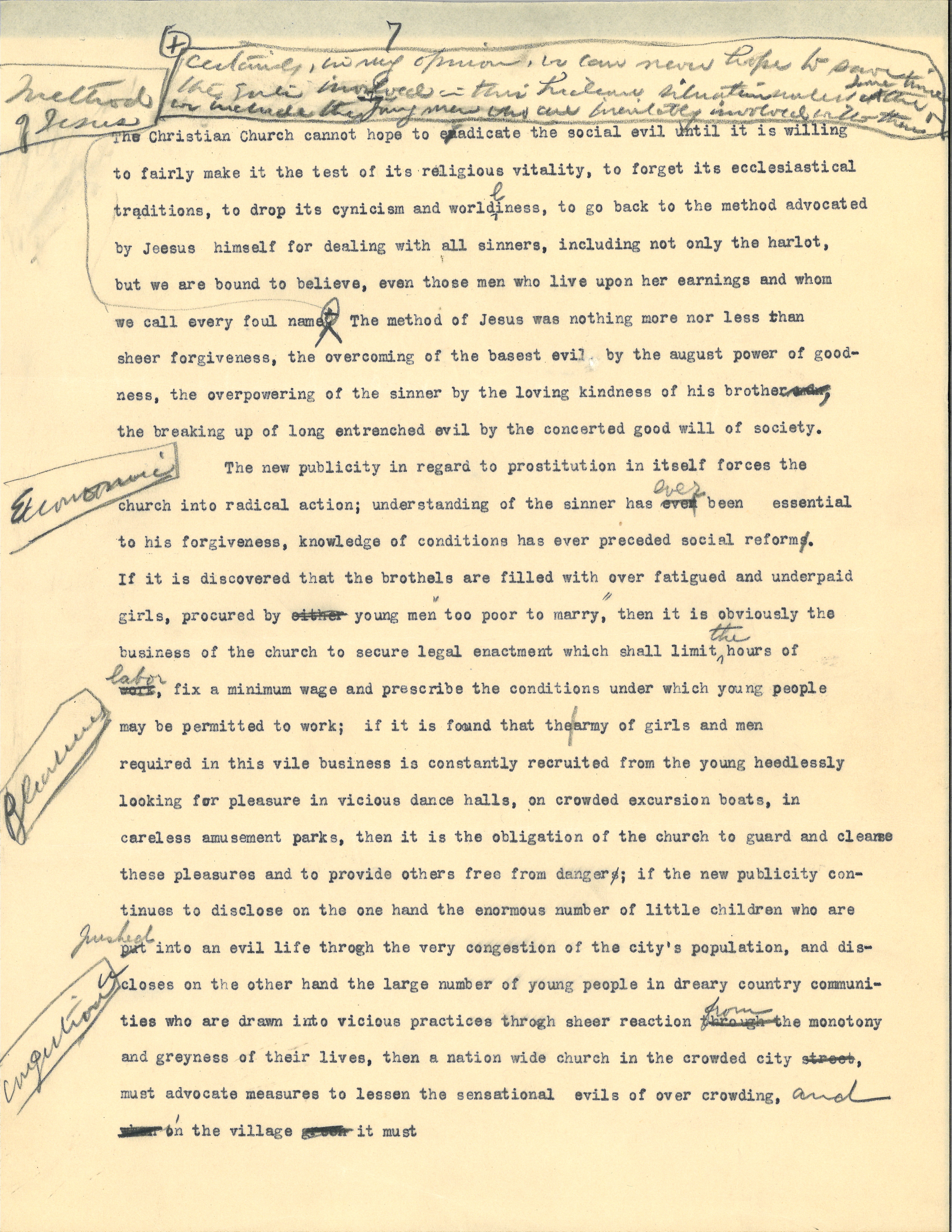 The Christian Church cannot hope to eradicate the social evil until it is willing to fairly make it the test of its religious vitality, to forget its ecclesiastical traditions, to drop its cynicism and worldliness, to go back to the method advocated by Jesus himself for dealing with all sinners, including not only the harlot, but we are bound to believe, even those men who live upon her earnings and whom we call every foul name, <certainly, in my opinion, we can never hope to save the girls involved in this hideous situation until at some time [that] we include the young men who are inevitably involved with them.> The method of Jesus was nothing more nor less than sheer forgiveness, the overcoming of the basest evil by the august power of goodness, the overpowering of the sinner by the loving kindness of his brother and, the breaking up of long entrenched evil by the concerted good will of society. [written in top left margin] method of Jesus