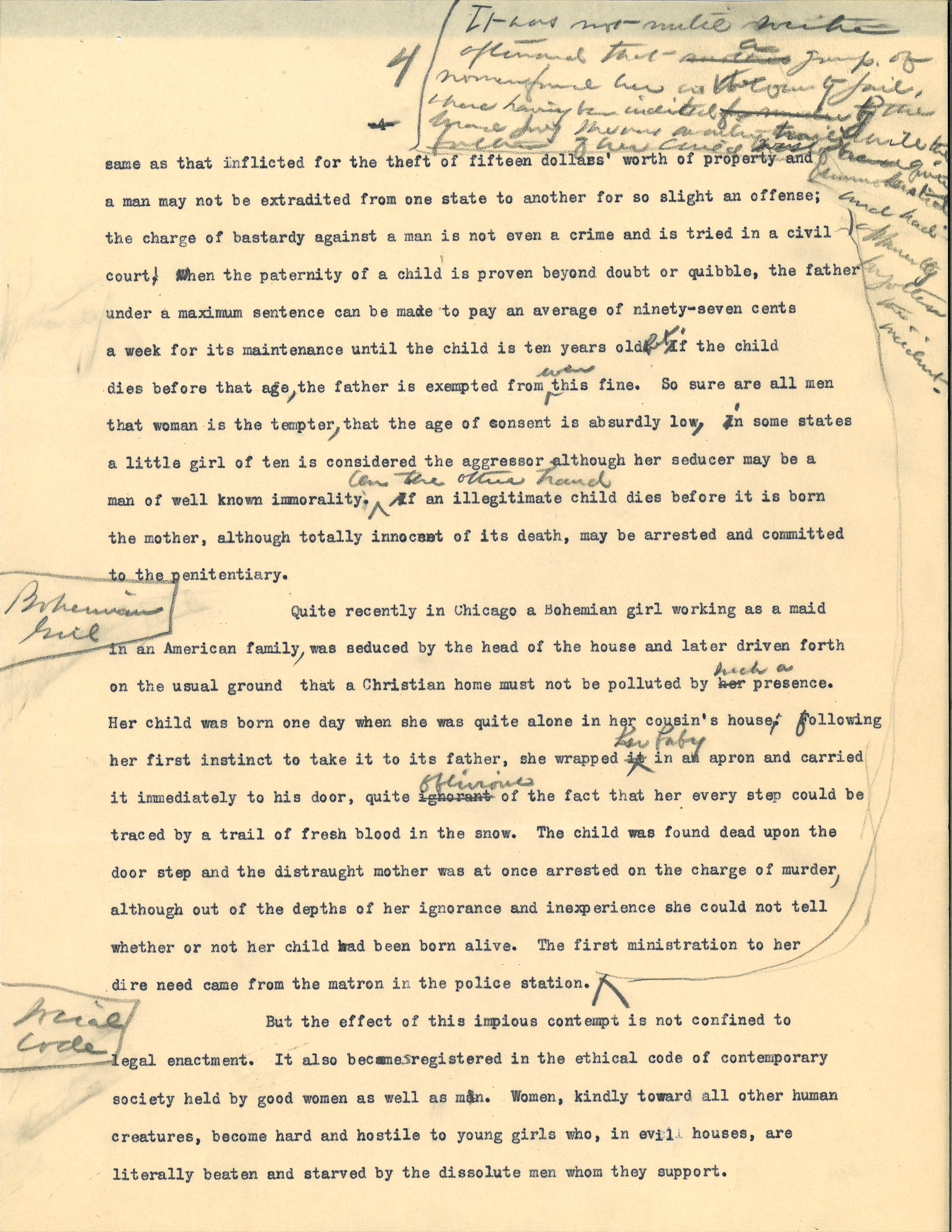 Quite recently in Chicago a Bohemian girl working as a maid in an American family, was seduced by the head of the house and later driven forth on the usual ground that a Christian home must not be polluted by her <such a> presence. Her child was born one day when she was quite alone in her cousin's house; following her first instinct to take it to its father, she wrapped it <her baby> in an apron and carried it immediately to his door, quite ignorant <oblivious> of the fact that her every step could be traced by a trail of fresh blood in the snow. The child was found dead upon the door step and the distraught mother was at once arrested on the charge of murder, although out of the depths of her ignorance and inexperience she could not tell whether or not her child had been born alive. The first ministration to her dire need came from the matron in the police station. <It was not until weeks afterward that [mothers?] <a> group of women found her in <the> county jail, where having been indicted for murder by the Grand Jury she was awaiting trial, while the father of her child was of course quite unmolested and had apparently forgotten the incident.> [written in left margin] Bohemian Girl