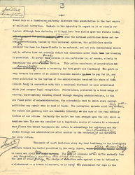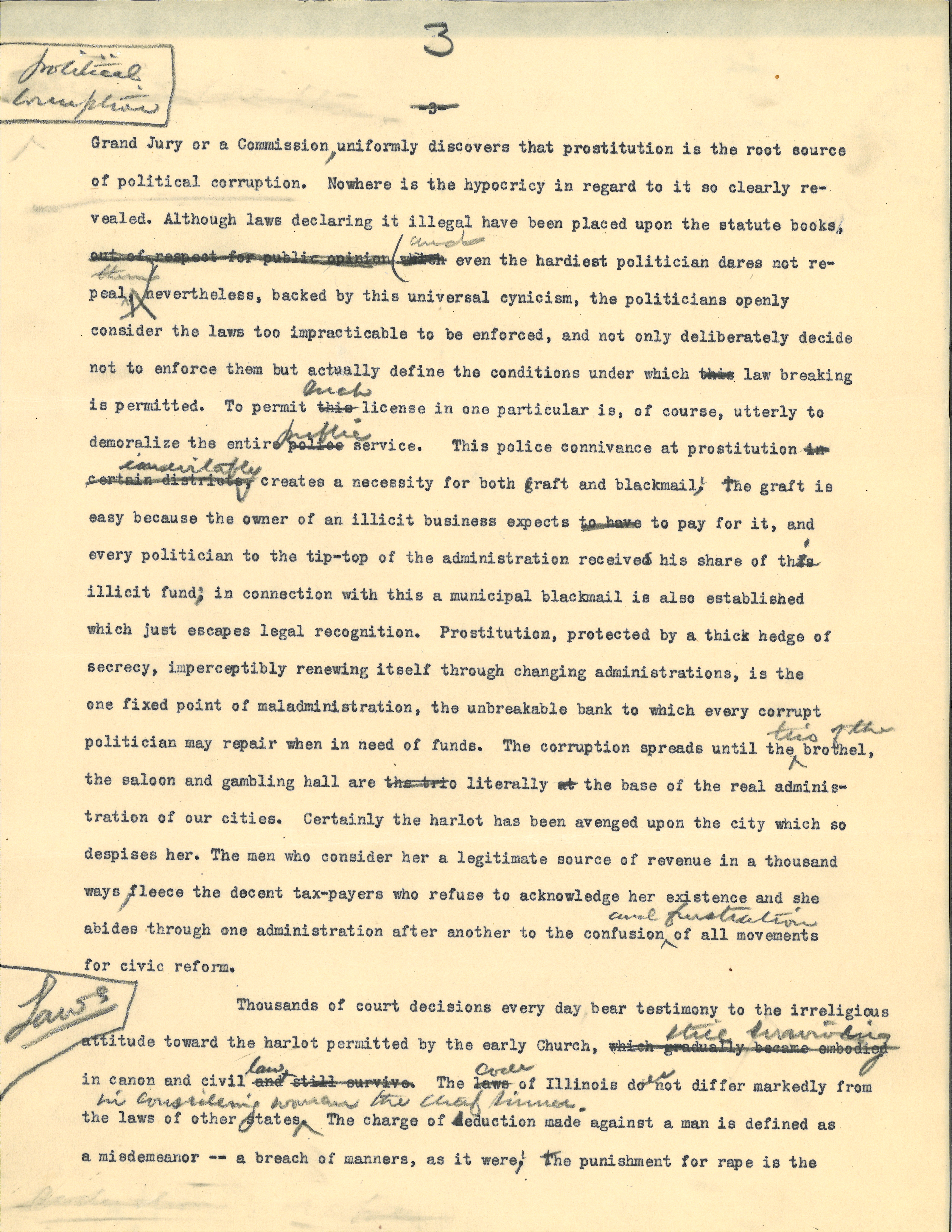 The result of This worldly cynicism has become so registered in our political affairs, that any probe into the vice conditions of a city, made by a [page 3] <[illegible]> Grand Jury or a Commission, uniformly discovers that prostitution is the root source of political corruption. Nowhere is the [hypocrisy] in regard to it so clearly revealed. Although laws declaring it illegal have been placed upon the statute books, out of respect for public opinion (which <and> even the hardest politician dares not repeal <them>) nevertheless, backed by this universal cynicism, the politicians openly consider the laws too impracticable to be enforced, and not only deliberately decide not to enforce them but actually define the conditions under which this law breaking is permitted. To permit this <such> license in one particular is, of course, utterly to demoralize the entire police <public> service. This police connivance at prostitution in certain districts <inevitably> creates a necessity for both graft and blackmail; the graft is easy because the owner of an illicit business expects to have to pay for it, and every politician to the tip-top of the administration receives his share of this illicit fund; in connection with this a municipal blackmail is also established which just escapes legal recognition. Prostitution, protected by a thick hedge of secrecy, imperceptibly renewing itself through changing administrations, is the one fixed point of maladministration, the unbreakable bank to which every corrupt politician may repair when in need of funds. The corruption spreads until the <trio of the> brothel, the saloon and gambling hall are the trio literally at the base of the real administration of our cities. Certainly the harlot has been avenged upon the city which so despises her. The men who consider her a legitimate source of revenue in a thousand ways, fleece the decent tax-payers who refuse to acknowledge her existence and she abides through one administration after another to the confusion <and frustration> of all movements for civic reform. [written in the top margin] political corruption