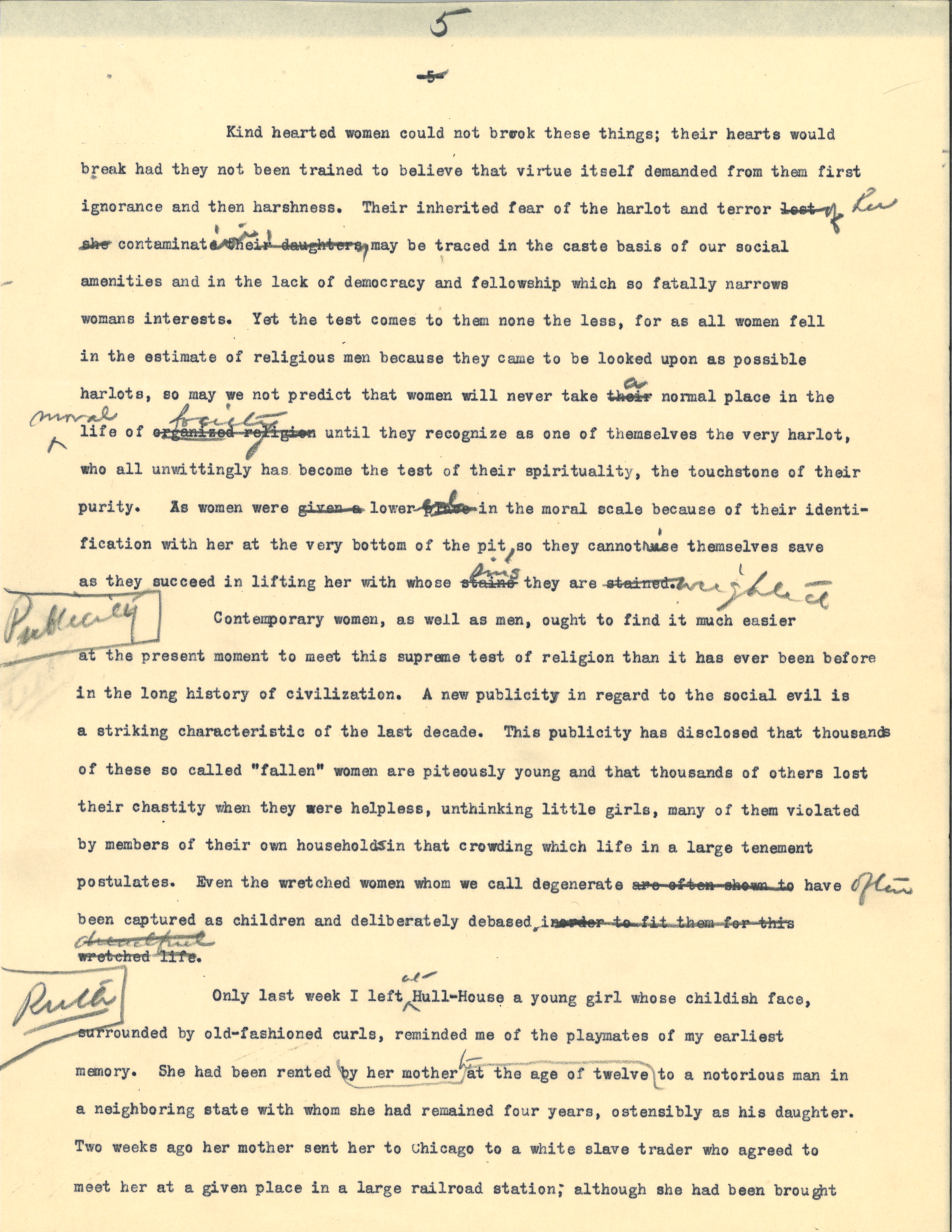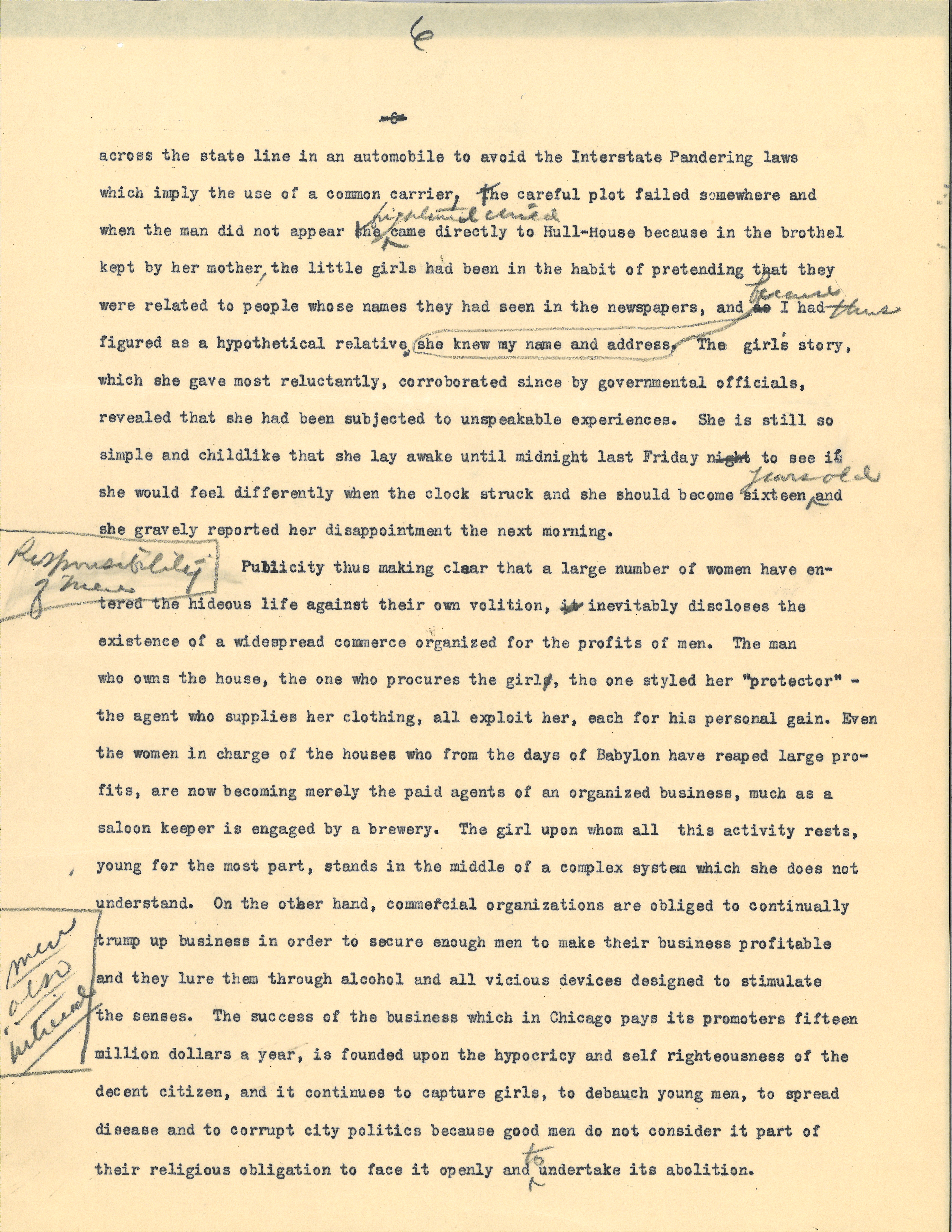 Only last week I left <at> Hull-House a young girl whose childish face, surrounded by old-fashioned curls, reminded me of the playmates of my earliest memory. She had been rented at the age of twelve by her mother to a notorious man in a neighboring state with whom she had remained four years, ostensibly as his daughter. Two weeks ago her mother sent her to Chicago to a white slave trader who agreed to meet her at a given place in a large railroad station; although she had been brought [page 6] across the state line in an automobile to avoid the Interstate Pandering laws which imply the use of a common carrier, the careful plot failed somewhere and when the man did not appear the <the frightened child> came directly to Hull-House because in the brothel kept by her mother, the little girls had been in the habit of pretending that they were related to people whose names they had seen in the newspapers, and <because> she knew my name and address as I had <thus> figured as a hypothetical relative. The girl's story, which she gave most reluctantly, corroborated since by governmental officials, revealed that she had been subjected to unspeakable experiences. She is still so simple and childlike that she lay awake until midnight last Friday night to see if she would feel differently when the clock struck and she should become sixteen <years old> and she gravely reported her disappointment the next morning. [written in left margin] Ruth