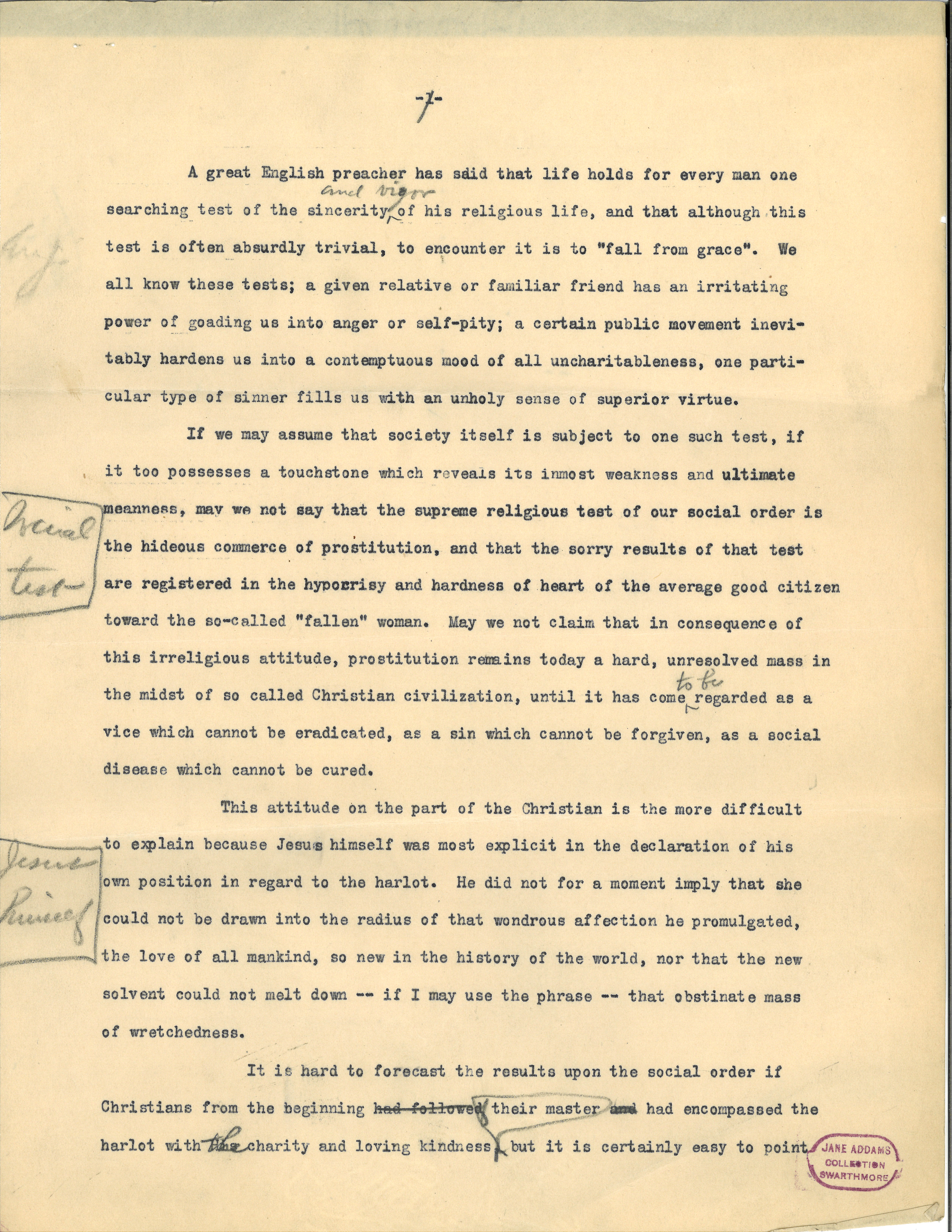 If we may assume that society itself is subject to one such test, if it too possesses a touchstone which reveals its inmost weakness and ultimate meanness, may we not say that the supreme religious test of our social order is the hideous commerce of prostitution, and that the sorry results of that test are registered in the hypocrisy and hardness of heart of the average good citizen toward the so-called "fallen" woman? May we not claim that in consequence of this irreligious attitude, prostitution remains today a hard, unresolved mass in the midst of so called Christian civilization, until it has come <to be> regarded as a vice which cannot be eradicated, as a sin which cannot be forgiven, as a social disease which cannot be cured? [written in left margin opposite this paragraph] social test