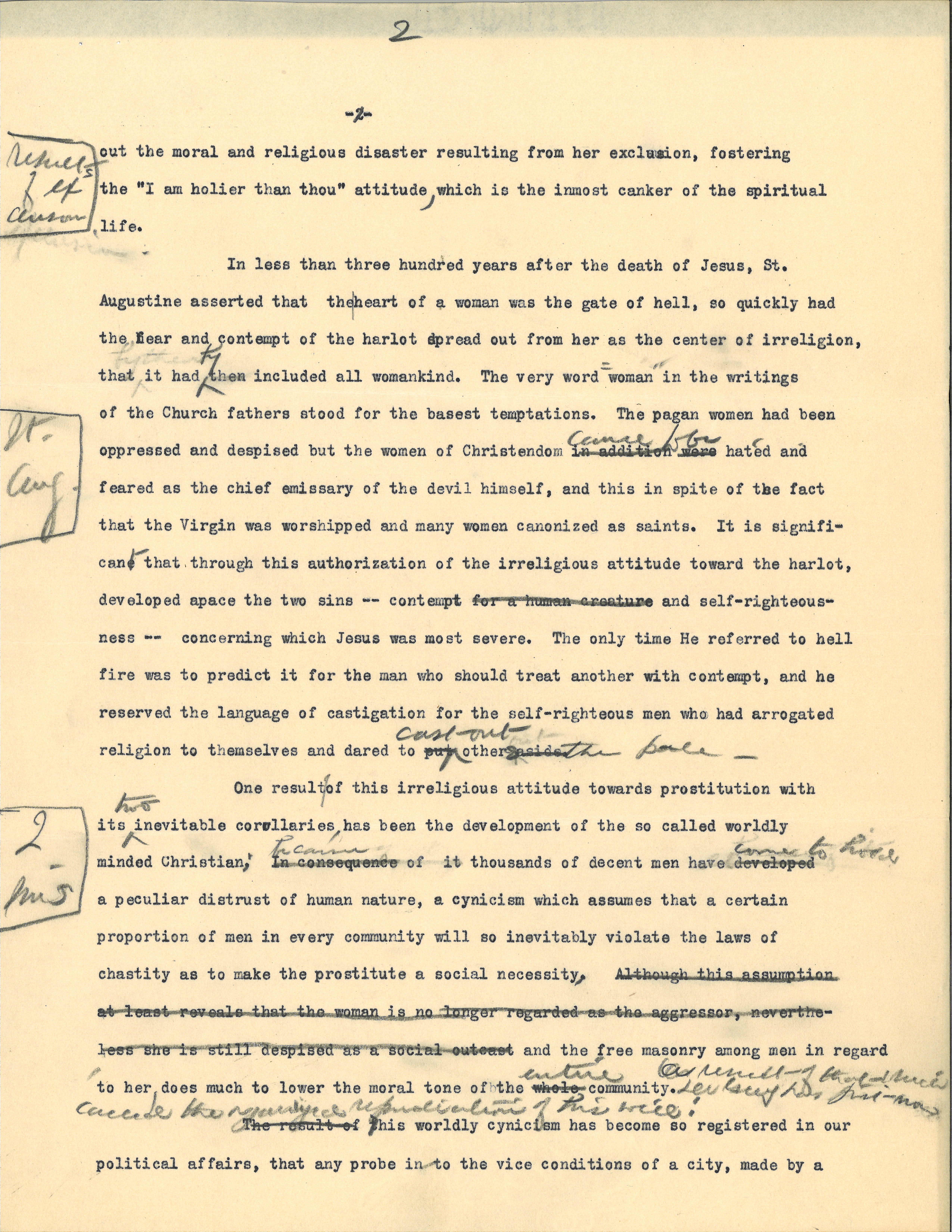 One result of this irreligious attitude towards prostitution with its <two> inevitable corollaries, has been the development of the so called worldly minded Christian; In consequence <because> of it thousands of decent men have developed <come to hold> a peculiar distrust of human nature, a cynicism which assumes that a certain proportion of men in every community will so inevitably violate the laws of chastity as to make the prostitute a social necessity, Although this assumption at least reveals that the woman is no longer regarded as the aggressor, nevertheless she is still despised as a social outcast and the free masonry among men in regard to her does much to lower the moral tone of the whole <entire> community. <One result of that which Dr [illegible surname] has just now [called] the organized repudiation of his will!> [written in left margin opposite this paragraph] 2 [MS?]