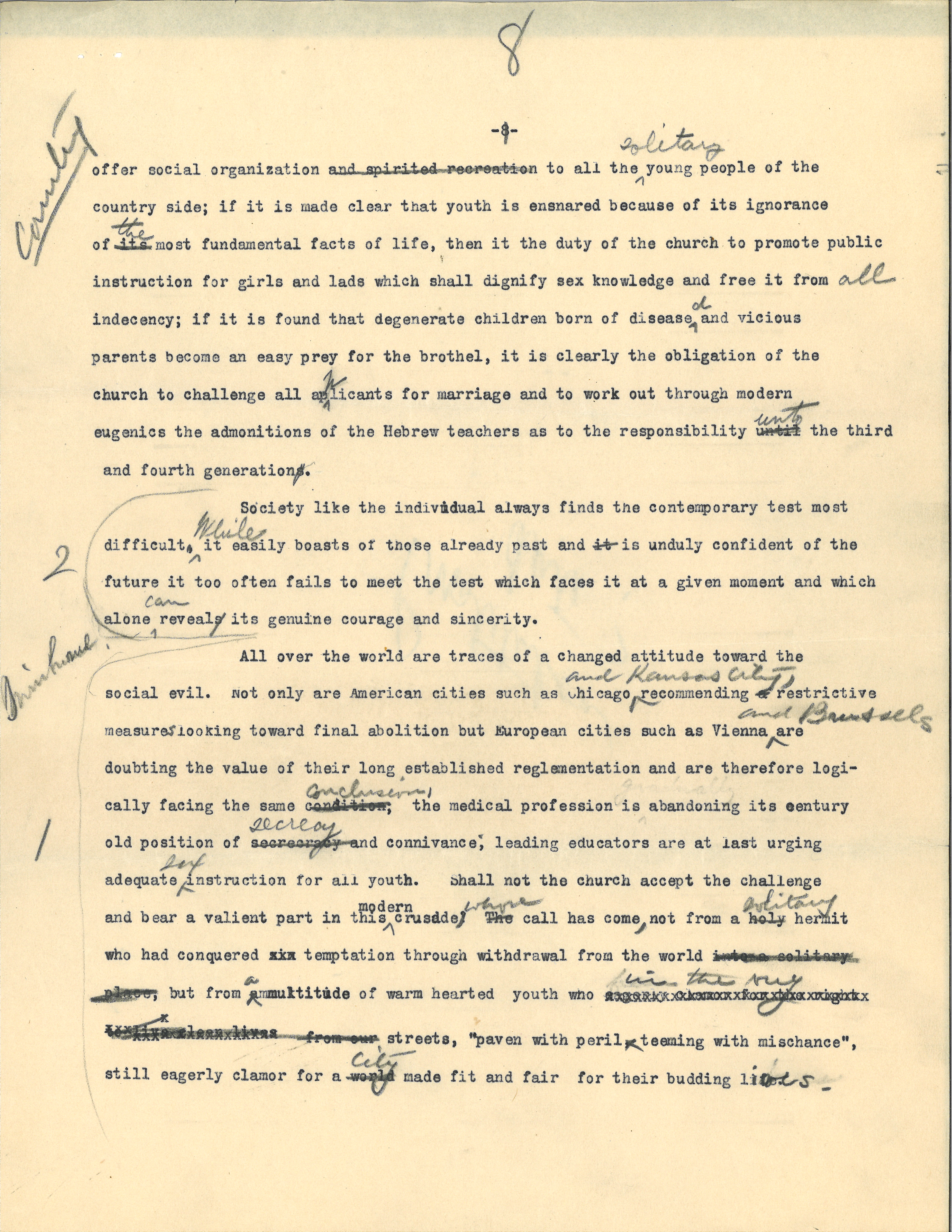 All over the world are traces of a changed attitude toward the social evil. Not only are American cities such as Chicago <and Kansas City,> recommending a restrictive measures looking toward final abolition but European cities such as Vienna <and Brussels> are doubting the value of their long established reglementation and are therefore logically facing the same condition <conclusion>, the medical profession is abandoning its century old position of secrecy and connivance; leading educators are at last urging adequate <sex> instruction for all youth. Shall not the church accept the challenge and bear a [valiant] part in this <modern> crusade, <whose> The call has come, not from a holy <solitary> hermit who had conquered [illegible] temptation through withdrawal from the world into a solitary place but from <a> multitude of warm hearted youth who eagerly [illegible] live clean lives from our <in the very> streets, "paven with peril, teeming with mischance", still eagerly clamor for a world <city> made fit and fair for their budding lives. [written in left margin opposite this paragraph] 1